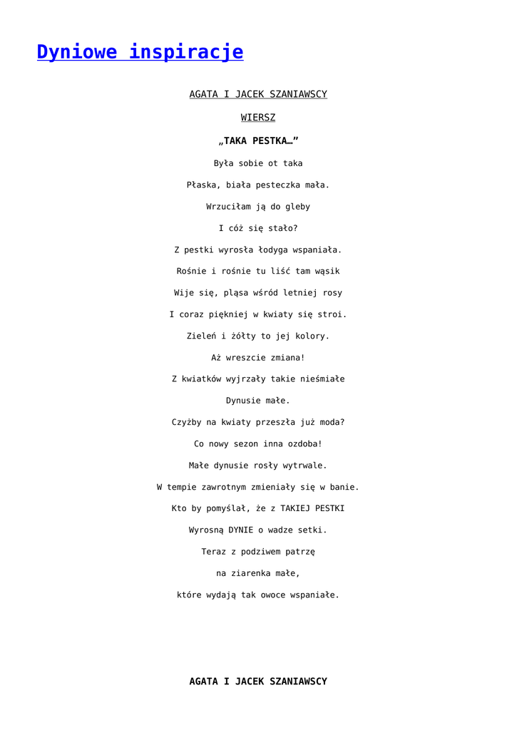 Dyniowe inspiracje AGATA I JACEK SZANIAWSCY WIERSZ „TAKA PESTKA…” Była sobie ot taka Płaska, biała pesteczka mała. Wrzuciłam ją do gleby I cóż się stało? Z pestki wyrosła łodyga wspaniała. Rośnie i rośnie tu liść tam wąsik Wije się, pląsa wśród letniej rosy I coraz piękniej w kwiaty się stroi. Zieleń i żółty to jej kolory. Aż wreszcie zmiana! Z kwiatków wyjrzały takie nieśmiałe Dynusie małe. Czyżby na kwiaty przeszła już moda? Co nowy sezon inna ozdoba! Małe dynusie rosły wytrwale. W tempie zawrotnym zmieniały się w banie. Kto by pomyślał, że z TAKIEJ PESTKI Wyrosną DYNIE o wadze setki. Teraz z podziwem patrzę na ziarenka małe, które wydają tak owoce wspaniałe. AGATA I JACEK SZANIAWSCY PRZEPIS ZDROWO, SZYBKO I SMACZNIE „Zupa krem z dyni” Składniki: 1KG DYNI, 1 POR/CZĘŚC BIAŁA/ 10DAG MASŁA, NATKA PIETRUSZKI Wykonanie: Na maśle udusić pokrojone białe części pora i natkę pietruszki. Rozgotować dynie pokrojoną w kostkę w małej ilości wody. Połączyć i zmiksować. Doprawić solą i pieprzem. Ozdobić natką pietruszki. Smacznego AGATA I JACEK SZANIAWSCY PIOSENKA „BYŁA SOBIE DYNIA DUŻA, DYNIA DUŻA BĘC” na melodię „Ogórek zielony ma garniturek” Dynusia, dynusia, dynusia Nie chodzi choć się porusza. Zielono się odziewa. I żółknie tak jak liście na drzewach. Garbata, sękata, pękata Dojrzewa pod koniec lata. Ma brzuszek okrągluszek Z niej pestki, pestki jeść muszę. Królowa dyniowa, królowa Na zimę jest gotowa W ogródku ją zbieramy. I wesoło jej śpiewamy: Dynusia, dynusia, dynusia… Bajka o dyni Zuzanna Walszewska kl.II gimn. Pewnego razu była sobie dynia i o imieniu Rozalia. Była mała, miała brzydki kolor i brzydko pachniała. Nikt jej nie lubił. Rozalia bardzo chciała się zaprzyjaźnić więc ruszyła w świat. Na swojej drodze spotkała marchewkę, która bawiła się z innymi małymi marchewkami. Rozalia próbowała zaprzyjaźnić się z nim, ale one stwierdziły że jest za brzydka i uciekły od niej. Smutna dynia poszła dalej i na swojej drodze spotkała kurę, która była zajęta wygrzebywaniem dżdżownic z ziemi. Jednak widząc nadchodzącą Rozalię szybko uciekła czując jej nieprzyjemny zapach. Zrozpaczona Rozalia szła przed siebie i w końcu dotarła do ogrodu, której właścicielką była mała Julka. Dziewczynka postanowiła zająć się Rozalią. Podlewała ją, mówiła jej miłe rzeczy i głaskała. Wraz z nastawieniem jesieni Rozalia odwdzięczyła się Julce za miłość i przyjaźń. Z malej, brzydkiej dyni wyrosła na dużą, pomarańczową i pachnącą dynię. Mama Julki przygotowała z niej pyszne potrawy a nasiona zasiała wiosną w swoim ogrodzie.