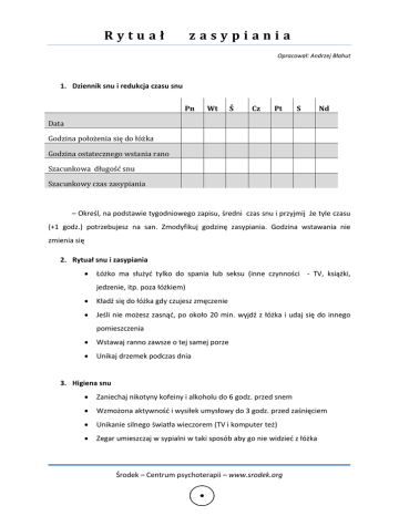 Rytuał zasypiania Opracował: Andrzej Błahut 1. Dziennik snu i redukcja czasu snu Pn Wt Ś Cz Pt S Nd Data Godzina położenia się do łóżka Godzina ostatecznego wstania rano Szacunkowa długość snu Szacunkowy czas zasypiania – Określ, na podstawie tygodniowego zapisu, średni czas snu i przyjmij że tyle czasu (+1 godz.) potrzebujesz na san. Zmodyfikuj godzinę zasypiania. Godzina wstawania nie zmienia się 2. Rytuał snu i zasypiania Łóżko ma służyd tylko do spania lub seksu (inne czynności - TV, książki, jedzenie, itp. poza łóżkiem) Kładź się do łóżka gdy czujesz zmęczenie Jeśli nie możesz zasnąd, po około 20 min. wyjdź z łóżka i udaj się do innego pomieszczenia Wstawaj ranno zawsze o tej samej porze Unikaj drzemek podczas dnia 3. Higiena snu Zaniechaj nikotyny kofeiny i alkoholu do 6 godz. przed snem Wzmożona aktywnośd i wysiłek umysłowy do 3 godz. przed zaśnięciem Unikanie silnego światła wieczorem (TV i komputer też) Zegar umieszczaj w sypialni w taki sposób aby go nie widzied z łóżka Środek – Centrum psychoterapii – www.srodek.org