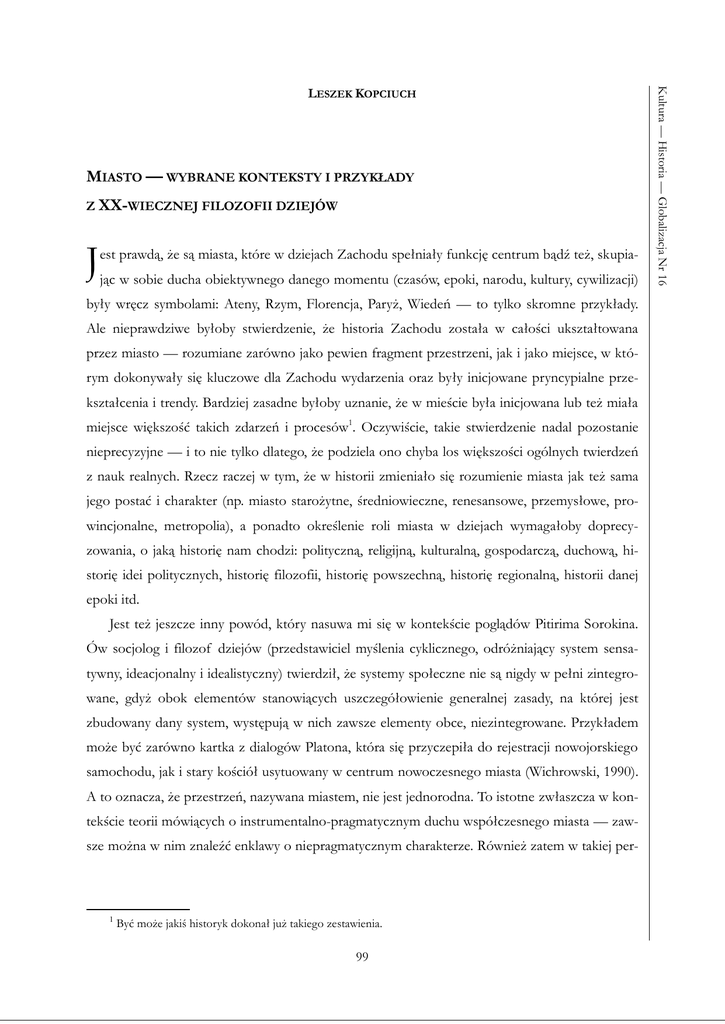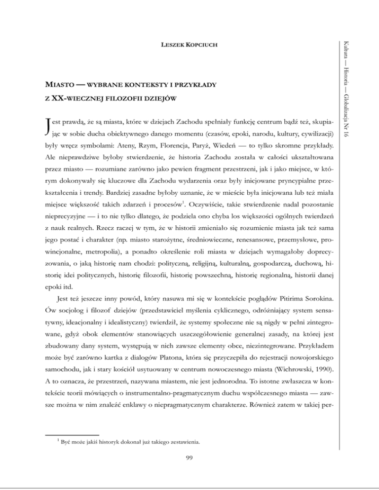 MIASTO — WYBRANE KONTEKSTY I PRZYKŁADY Z XX-WIECZNEJ FILOZOFII DZIEJÓW J est prawdą, że są miasta, które w dziejach Zachodu spełniały funkcję centrum bądź też, skupiając w sobie ducha obiektywnego danego momentu (czasów, epoki, narodu, kultury, cywilizacji) były wręcz symbolami: Ateny, Rzym, Florencja, Paryż, Wiedeń — to tylko skromne przykłady. Ale nieprawdziwe byłoby stwierdzenie, że historia Zachodu została w całości ukształtowana przez miasto — rozumiane zarówno jako pewien fragment przestrzeni, jak i jako miejsce, w którym dokonywały się kluczowe dla Zachodu wydarzenia oraz były inicjowane pryncypialne przekształcenia i trendy. Bardziej zasadne byłoby uznanie, że w mieście była inicjowana lub też miała miejsce większość takich zdarzeń i procesów1. Oczywiście, takie stwierdzenie nadal pozostanie nieprecyzyjne — i to nie tylko dlatego, że podziela ono chyba los większości ogólnych twierdzeń z nauk realnych. Rzecz raczej w tym, że w historii zmieniało się rozumienie miasta jak też sama jego postać i charakter (np. miasto starożytne, średniowieczne, renesansowe, przemysłowe, prowincjonalne, metropolia), a ponadto określenie roli miasta w dziejach wymagałoby doprecyzowania, o jaką historię nam chodzi: polityczną, religijną, kulturalną, gospodarczą, duchową, historię idei politycznych, historię filozofii, historię powszechną, historię regionalną, historii danej epoki itd. Jest też jeszcze inny powód, który nasuwa mi się w kontekście poglądów Pitirima Sorokina. Ów socjolog i filozof dziejów (przedstawiciel myślenia cyklicznego, odróżniający system sensatywny, ideacjonalny i idealistyczny) twierdził, że systemy społeczne nie są nigdy w pełni zintegrowane, gdyż obok elementów stanowiących uszczegółowienie generalnej zasady, na której jest zbudowany dany system, występują w nich zawsze elementy obce, niezintegrowane. Przykładem może być zarówno kartka z dialogów Platona, która się przyczepiła do rejestracji nowojorskiego samochodu, jak i stary kościół usytuowany w centrum nowoczesnego miasta (Wichrowski, 1990). A to oznacza, że przestrzeń, nazywana miastem, nie jest jednorodna. To istotne zwłaszcza w kontekście teorii mówiących o instrumentalno-pragmatycznym duchu współczesnego miasta — zawsze można w nim znaleźć enklawy o niepragmatycznym charakterze. Również zatem w takiej per- 1 Być może jakiś historyk dokonał już takiego zestawienia. 99 Kultura — Historia — Globalizacja Nr 16 LESZEK KOPCIUCH Leszek Kopciuch, Miasto — wybrane konteksty i przykłady z XX-wiecznej filozofii dziejów spektywie można by szukać poziomów uszczegółowienia odpowiedzi na pytanie o rolę miasta w dziejach. Rzecz jasna, takie potraktowanie kwestii jednorodności lub niejednorodności przestrzeni miejskiej wymaga pewnego doprecyzowania. Elementy tej przestrzeni mogą być na przykład obce pod względem swego historycznego pochodzenia lub też — co ważniejsze — pod względem swego sensu i wspierających go wartości. Pragmatyczna aksjologia fundująca efektywną i sprawną organizację życia jest oparta na takim materialnym rozumieniu wartości, które jest różne od wartości inspirujących strukturę starej katedry. Być może ta niejednorodność wartości i sensów ujawnia się nam najżywiej w naocznym doświadczeniu — gdy wchodząc z ulicy do katedry doświadczam, że znalazłem się jakby w innym świecie, pośród innych sensów, celów i wartości. Właśnie dlatego taki „inny świat” sprzyja autorefleksji bardziej niż świat codzienny. Tę niejednorodność można co prawda zawsze opanować poprzez włączenie jej w ramy sensu dominującego, choćby pragmatycznego. Dzieje się to jednak kosztem pogwałcenia innego sensu, jego dezinterpretacji, niedostrzeżenia lub zapomnienia. „Terapeutyczny” charakter takich miejsc — uchwytny jako taki również dla przeciętnego mieszkańca — dowodzi, że ta niejednorodność nie jest dostępna tylko w jakiejś specjalnej perspektywie teoretycznej. Wspomniana ich terapeutyczna funkcja jest bowiem możliwa właśnie dzięki ich specyficznym i odmiennym sensom. W rozwijającej się bujnie od przełomu XVIII i XIX wieku filozofii dziejów, problematyka i kategoria „miasto” (1) pojawiała się explicite w połączeniu z innymi teoretycznymi kwestiami, stanowiąc ich ważny element składowy i była traktowana jako tzw. termin techniczny danej koncepcji bądź też (2) była przywoływana jako egzemplifikacja lub podłoże ważkich treści teoretycznych, albo też (3) — pojawiając się explicite lub tylko implicite — skupiała w sobie w istotny sposób takie treści, które były analizowane w danej koncepcji i była wiązana z takim określeniami, jak rozum instrumentalny, pragmatyzm, industrializm, przemysł, technika. Celem artykułu jest pokazanie powyższych trzech sposobów użycia kategorii „miasto”, przy odwołaniu się do kilku wybranych teorii z dwudziestowiecznej filozofii dziejów (łączących się jednak z dyscyplinami pokrewnymi i bliskimi tematycznie, tj. z filozofią kultury, filozofią społeczną, filozoficzną antropologią). Przywołane zaś zostaną (choć w różnym zakresie) teorie Oswalda Spenglera, Ortegi y Gasseta, Maxa Horkheimera oraz Alvina Tofflera. Już na początku trzeba zastrzec, że choć analizowane teorie należą zarówno do modelu antyoptymistycznego, jak i optymistycznego2, to dominują w tym opracowaniu koncepcje antyoptymistyczne. Nie jest to kwestia przyjętej przeze mnie tematycznej konwencji lub dowolnego wyboru. 2 O tym podziale, który nie jest tożsamy z podziałem na stanowiska optymistyczne i pesymistyczne pisałem w książce Szkice systematyczne z filozofii dziejów (Kopciuch, 2014, 43–55). 100 wiązania antyoptymistyczne, lecz także optymistyczne, niemniej te pierwsze, gdy idzie o rozwiązania z zakresu „ontologicznej” filozofii dziejów 