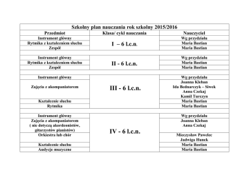 Szkolny plan nauczania rok szkolny 2015/2016 Przedmiot Instrument główny Rytmika z kształceniem słuchu Zespół Instrument główny Rytmika z kształceniem słuchu Zespół Klasa/ cykl nauczania Nauczyciel I – 6 l.c.n. Wg przydziału Maria Bastian Maria Bastian II - 6 l.c.n. Wg przydziału Maria Bastian Maria Bastian Instrument główny Zajęcia z akompaniatorem III - 6 l.c.n. Kształcenie słuchu Rytmika Instrument główny Zajęcia z akompaniatorem ( nie dotyczą akordeonistów, gitarzystów pianistów) Orkiestra lub chór Kształcenie słuchu Audycje muzyczne Wg przydziału Joanna Kleban Ida Bednarczyk – Siwek Anna Czekaj Kamil Turczyn Maria Bastian Maria Bastian Wg przydziału Joanna Kleban Anna Czekaj IV - 6 l.c.n. Mieczysław Pawelec Jadwiga Hunek Maria Bastian Maria Bastian Przedmiot Klasa/ cykl nauczania Nauczyciel Wg przydziału Instrument główny Fortepian dodatkowy Zajęcia z akompaniatorem ( nie dotyczą akordeonistów, gitarzystów pianistów) Orkiestra lub chór V – 6 l.c.n. Mieczysław Pawelec Jadwiga Hunek Anna Tryniecka Anna Tryniecka Kształcenie słuchu Audycje muzyczne Instrument główny Fortepian dodatkowy ( nie dotyczy pianistów) Zajęcia z akompaniatorem ( nie dotyczą akordeonistów, gitarzystów pianistów) Orkiestra lub chór Kształcenie słuchu Audycje muzyczne Ewa Gajewska Joanna Kleban Anna Czekaj VI – 6 l.c.n. Wg przydziału Ida Bednarczyk – Siwek Artur Smelkowski Ewa Gajewska Joanna Kleban Ewa Gajewska Mieczysław Pawelec Jadwiga Hunek Anna Tryniecka Anna Tryniecka Przedmiot Instrument główny Zespół Podstawy kształcenia słuchu Instrument główny Zespół Kształcenie słuchu z audycjami muzycznymi Orkiestra lub chór Klasa/ cykl nauczania Nauczyciel I – 4 l.c.n. Wg przydziału Maria Bastian Anna Tryniecka II – 4 l.c.n. Mieczysław Pawelec Jadwiga Hunek Anna Tryniecka Kształcenie słuchu Instrument główny Fortepian dodatkowy ( nie dotyczy pianistów) Zajęcia z akompaniatorem ( nie dotyczą akordeonistów, gitarzystów pianistów) Orkiestra lub chór Wg przydziału Ewa Gajewska Joanna Kleban Ewa Gajewska III – 4 l.c.n. Kształcenie słuchu Audycje muzyczne Przedmiot Instrument główny Fortepian dodatkowy ( nie dotyczy pianistów) Zajęcia z akompaniatorem Wg przydziału Maria Bastian Anna Tryniecka Klasa/ cykl nauczania Mieczysław Pawelec Jadwiga Hunek Anna Tryniecka Anna Tryniecka Nauczyciel Wg przydziału Anna Czekaj Ewa Gajewska ( nie dotyczą akordeonistów, gitarzystów pianistów) Orkiestra lub chór Anna Czekaj IV – 4 l.c.n. Kształcenie słuchu Audycje muzyczne Mieczysław Pawelec Jadwiga Hunek Anna Tryniecka Anna Tryniecka II stopień Przedmiot Klasa/ cykl nauczania Instrument główny Fortepian obowiązkowy (nie dotyczy pianistów) Gra a vista ( dotyczy tylko pianistów) Zajęcia z akompaniatorem ( nie dotyczą akordeonistów, gitarzystów, pianistów) Orkiestra lub chór Kształcenie słuchu Zasady muzyki z elem. edycji nut Nauczyciel Wg przydziału Wg przydziału I – średnia Artur Smelkowski Ida Bednarczyk – Siwek Anna Czekaj Joanna Kleban Ida Bednarczyk – Siwek Ewa Gajewska Kamil Turczyn Mieczysław Pawelec Jadwiga Hunek Anna Tryniecka Rafał Pudełko Zajęcia fakult. wyrównawcze Anna Tryniecka Klasa/ cykl nauczania Przedmiot Nauczyciel Instrument główny Fortepian obowiązkowy (nie dotyczy pianistów) Zajęcia z akompaniatorem ( nie dotyczą akordeonistów, gitarzystów pianistów) Wg przydziału Wg przydziału Gra a Vista ( dotyczy tylko pianistów) Wg przydziału II – średnia Zespół kameralny Orkiestra lub chór Wg przydziału Mieczysław Pawelec Jadwiga Hunek Anna Tryniecka Rafał Pudełko Kształcenie słuchu Zasady muzyki z elementami edycji nut Teoretyczne podstawy harmonii Rafał Pudełko Instrument główny Fortepian dodatkowy ( nie dotyczy pianistów) Zajęcia z akompaniatorem ( nie dotyczą akordeonistów, gitarzystów pianistów) Zespół kameralny Orkiestra lub chór Wg przydziału III – średnia Wg przydziału Artur Smelkowski Anna Czekaj Ewa Gajewska Kamil Turczyn Joanna Kleban Ewa Gajewska Ida Bednarczyk – Siwek Kamil Turczyn Wg przydziału Mieczysław Pawelec Jadwiga Hunek Anna Tryniecka Rafał Pudełko Rafał Pudełko Kształcenie słuchu Harmonia Historia muzyki z liter. muz. Przedmiot Klasa/ cykl nauczania Instrument główny Wg przydziału Ida Bednarczyk – Siwek Artur Smelkowski Ewa Gajewska Joanna Kleban Ida Bednarczyk – Siwek Kamil Turczyn Fortepian dodatkowy ( nie dotyczy pianistów) Zajęcia z akompaniatorem ( nie dotyczą akordeonistów, gitarzystów, pianistów) Nauka akompaniamentu ( dotyczy pianistów) Zespół kameralny Orkiestra lub chór IV – średnia Wg przydziału Wg przydziału Mieczysław Pawelec Jadwiga Hunek Anna Tryniecka Rafał Pudełko Rafał Pudełko Rafał Pudełko Kształcenie słuchu Harmonia Historia muzyki z liter. muz. Formy muzyczne Instrument główny Fortepian dodatkowy ( nie dotyczy pianistów) Zajęcia z akompaniatorem ( nie dotyczą akordeonistów, gitarzystów pianistów) Nauczyciel Wg przydziału Wg przydziału V – średnia Ida Bednarczyk – Siwek Ewa Gajewska Nauka akompaniamentu ( dotyczy pianistów) Zespół kameralny Orkiestra lub chór Kształcenie słuchu Harmonia Historia muzyki z liter. muz. Formy muzyczne V - średnia Instrument główny Fortepian dodatkowy ( nie dotyczy pianistów) Zajęcia z akompaniatorem ( nie dotyczą akordeonistów, gitarzystów pianistów) Nauka akompaniamentu ( dotyczy pianistów) Orkiestra lub chór Kamil Turczyn Ida Bednarczyk – Siwek Joanna Kleban Wg przydziału Mieczysław Pawelec Jadwiga Hunek Rafał Pudełko Rafał Pudełko Rafał Pudełko Rafał Pudełko Wg przydziału Artur Smelkowski Kamil Turczyn Joanna Kleban Ida Bednarczyk – Siwek Kamil Turczyn VI – średnia Wg przydziału Mieczysław Pawelec Jadwiga Hunek Rafał Pudełko Rafał Pudełko Rafał Pudełko Rafał Pudełko Kształcenie słuchu Harmonia Historia muzyki z liter. muz. Formy muzyczne Pozostałe zajęcia Przedmiot Zes