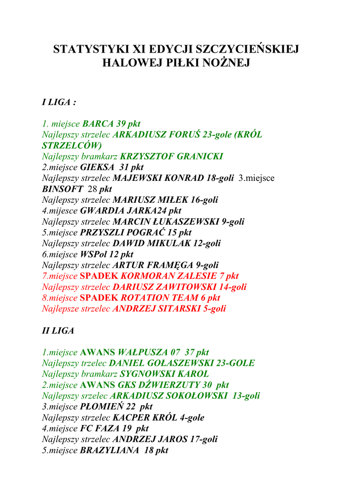 STATYSTYKI XI EDYCJI SZCZYCIEŃSKIEJ HALOWEJ PIŁKI NOŻNEJ I LIGA : 1. miejsce BARCA 39 pkt Najlepszy strzelec ARKADIUSZ FORUŚ 23-gole (KRÓL STRZELCÓW) Najlepszy bramkarz KRZYSZTOF GRANICKI 2.miejsce GIEKSA 31 pkt Najlepszy strzelec MAJEWSKI KONRAD 18-goli 3.miejsce BINSOFT 28 pkt Najlepszy strzelec MARIUSZ MIŁEK 16-goli 4.mijesce GWARDIA JARKA24 pkt Najlepszy strzelec MARCIN ŁUKASZEWSKI 9-goli 5.miejsce PRZYSZLI POGRAĆ 15 pkt Najlepszy strzelec DAWID MIKULAK 12-goli 6.miejsce WSPol 12 pkt Najlepszy strzelec ARTUR FRAMĘGA 9-goli 7.miejsce SPADEK KORMORAN ZALESIE 7 pkt Najlepszy strzelec DARIUSZ ZAWITOWSKI 14-goli 8.miejsce SPADEK ROTATION TEAM 6 pkt Najlepsze strzelec ANDRZEJ SITARSKI 5-goli II LIGA 1.miejsce AWANS WAŁPUSZA 07 37 pkt Najlepszy trzelec DANIEL GOŁASZEWSKI 23-GOLE Najlepszy bramkarz SYGNOWSKI KAROL 2.miejsce AWANS GKS DŹWIERZUTY 30 pkt Najlepszy srzelec ARKADIUSZ SOKOŁOWSKI 13-goli 3.miejsce PŁOMIEŃ 22 pkt Najlepszy strzelec KACPER KRÓL 4-gole 4.miejsce FC FAZA 19 pkt Najlepszy strzelec ANDRZEJ JAROS 17-goli 5.miejsce BRAZYLIANA 18 pkt Najlepszy strzelec AUGUSTYNIAK PRZEMYSŁAW,KRUCZYK DAMIAN 8-goli 6.miejsce FC CHLOROTHINIAIKOS 18 pkt Najlepszy strzelec BARTŁOMIEJ PIÓRKOWSKI 9-goli 7.miejsce SPADEK EBOLA TEAM 11 pkt Najlepszy strzelec DAWID POLAK 11-goli 8.miejsce SPADEK SANTOS 8 pkt Najlepszy strzelec KRZYSZTOF WAWRZYNIAK 7-goli III LIGA 1.miejsce AWANS PLUS 40 29 pkt Najlepszy strzelec MACIEJ ZYŚK 15-goli 2.miejsce AWANS GKS ROZOGI 22 pkt Najlepszy strzelec KAROL STAŃ 19-goli 3.miejsce LEŚNIK 16 pkt Najlepszy strzelec PRZEMYSŁAW BIEDKA 15-goli 4.miejsce CETCO 16 pkt Najlepszy strzelec CEZARY TRZEBIŃSKI 10-goli 5.miejsce FM BRAVO 16 pkt Najlepszy strzelec MARCIN KRUK 9-goli 6.miejsce SPADEK BO-DAR 14 pkt Najlepszy strzelec GRZEGORZ GOŹDZIEWSKI 25-goli (KRÓL STRZELCÓW 3 LIGI) 7.miejsce SPADEK OBY REMIS 5 pkt Najlepszy strzelec PAWEŁ DEPTUŁA 5-goli IVLIGA 1.miejsce BRYGADA KRYZYS 30 pkt Najlepszy strzelec TOMASZ MARSZAŁEK 15-goli Najlepszy bramkarz DENIS WIEWIÓRA 2.miejsce WAŁPUSZA 2 07 27 pkt Najlepszy strzelec JAKUB TABAKA 21-goli 3.miejsce KKS 10 pkt Najlepszy strzelec ADRIAN JAREMA,WOŹNIAK DANIEL 8-goli 4.miejsce DBAJ ŚWIĘTAJNO 4 pkt Najlepszy strzelec MARCIN TAŃSKI 8-goli PODSUMOWANIE I liga : Barca wygrywa po raz 3 z rzędu (36 pkt) tracąc przy tym najmniej bramek (20) .Najlepszym bramkarzem po raz drugi z rzedu został Krzysztof Granicki (barca) .Tabele zamyka Rotation Team z dorobkiem zaledwie 6 pkt. Najlepszy strzelcec Arkadiusz Forus (23-bramki) Padło łacznie az 341 bramek. Największy wynik padł w meczu KORMORAN ZALESIEBINSOFT az (0:11). Najwyższy remis bramkowy: KORMORAN ZALESIE-PRZYSZLI POGRAC (3:3) Najwiecej porażek az 12 zanotowała druzyna ROTATION TEAM II Liga : 1 miejsce zajmuje WAŁPUSZA 07 z dorobkiem (37 pkt). i wygrywa rywalizacje w 2 lidze…Warto dodać ze Wałpusza 07 po rocznej przerwie wraca do 1 ligi.Dla beniaminka GKS DŹWIERZUTY natomiast będzie to 1 sezon w 1 lidze . Na ostatnim miejscu uplasował się SANTOS z dorobkiem zaledwie 8 pkt. Najlepszy strzelec : DANIEL GOŁASZEWSKI (23-bramki) Łącznie bramek : 323 Największy wynik bramkowy : FC CHLOROTHINAIKOS – GKS DŹWIERZUTY (2:11) Największy remis bramkowy : EBOLA TEAM - GKS DŹWIERZUTY (4:4) III Liga : Wygrywa drużyna PLUS 40 ( 29 pkt) która przed rokiem awansowała z 4 ligi. Ostatnie miejsce zajmuje druzyna OBY REMIS która zdołała zdobyć tylko 5 pkt. Najlepsi strzelcy : Karol Stań ( GKS ROZOGI) , Grzegorz Goździewski ( BO- DAR) obaj 17-bramek Łącznie bramek : 280 Największy wynik : OBY REMIS – GKS ROZOGI (4:15) , LEŚNIK – FM BRAVO (12:1), BO- DAR – OBY REMIS (11:4) Największy remis bramkowy : LEŚNIK – GKS ROZOGI (5:5) IV Liga : Brygada Kryzys zwycięża i awansuje do 3 Ligi ( 30 pkt) . Ostatnie miejsce zajęła drużyna DBAJ ŚWIETAJNO ( 4 pkt ) Najlepszy strzelec : JAKUB TABAKA 21-bramki Łącznie bramek : 175 Największy wynik : DBAJ ŚWIĘTAJNO – WAŁPUSZA 2 07 (5:11) Największy remis bramkowy : KKS – DBAJ ŚWIETAJNO (3:3)