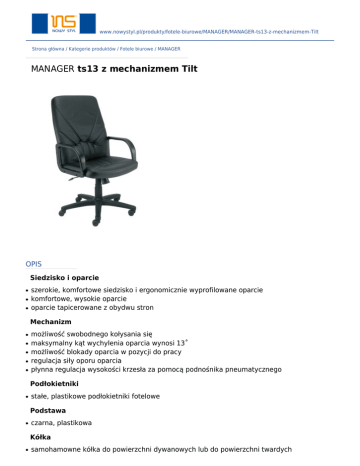 www.nowystyl.pl/produkty/fotele-biurowe/MANAGER/MANAGER-ts13-z-mechanizmem-Tilt Strona główna / Kategorie produktów / Fotele biurowe / MANAGER MANAGER ts13 z mechanizmem Tilt OPIS Siedzisko i oparcie ● ● ● szerokie, komfortowe siedzisko i ergonomicznie wyprofilowane oparcie komfortowe, wysokie oparcie oparcie tapicerowane z obydwu stron Mechanizm ● ● ● ● ● możliwość swobodnego kołysania się maksymalny kąt wychylenia oparcia wynosi 13˚ możliwość blokady oparcia w pozycji do pracy regulacja siły oporu oparcia płynna regulacja wysokości krzesła za pomocą podnośnika pneumatycznego Podłokietniki ● stałe, plastikowe podłokietniki fotelowe Podstawa ● czarna, plastikowa Kółka ● samohamowne kółka do powierzchni dywanowych lub do powierzchni twardych Inne właściwości ● dostępna wersja stacjonarna WYKOŃCZENIA SKÓRA DWOINA SP11 SP12 SP02 SP07 SP03 SP06 SP01 Skład: miękka skóra dwoina, lakierowana - tapicerka dostępna do końca 2013 roku lub do wyczerpania zapasów MICRO M56 M04 M81 M07 M54 M47 M62 M43 M15 M38 M12 M25 M28 M31 Skład: 100% poliester Gramatura: 215 g/m2 Odporność na ścieranie: 50 000 cykli Martindale Trudnozapalność: EN 1021 1&2 (papieros i zapałka) Inne: Atest higieniczny wydany przez Państwowy Zakład Higieny, Klasyfikacja ogniowa w zakresie wydzielania toksycznych produktów spalania wg. kryterium normy PN-88/-02855. - tapicerka dostępna do końca 2013 roku lub do wyczerpania zapasów SKAJ V01 V18N V46 V17 V26 V79N V16N V47 V82 V20 V13 V19N V49 V62 V98 V53N V28 V02N V04 V14N TG-01 V83 Skład: 100% poliester pokryty warstwą PCW Gramatura: 450 g/m2 Odporność na ścieranie: 50 000 cykli Martindale Trudnozapalność: niektóre kolory (oznaczone literą N) posiadają atest na niepalność; BS 5852: part 1: 1979 (papieros i zapałka) Inne: łatwozmywalny - tapicerka dostępna do końca 2013 roku lub do wyczerpania zapasów WYMIARY wysokość krzesła: 505 wysokość podłokietników: 480 Wszelkie prawa zastrzeżone © 2013 Grupa Nowy Styl KONTAKT Nowy Styl Sp. z o.o. Pużaka 49 38-400 Krosno Infolinia: 0801 177-291 Tel. 13 43 76 100 Fax: 13 43 62 732 [email protected] www.nowystyl.com Dział Sprzedaży Krajowej Pużaka 49 38-400 Krosno Tel. 13 43 76 100 Dział Marketingu Warszawska 15 32-086 Węgrzce Tel. 12 63 98 602