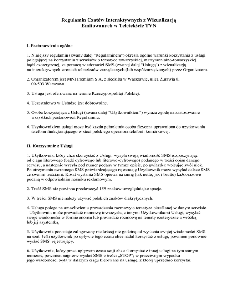 Regulamin Czatów Interaktywnych z Wizualizacją Emitowanych w Teletekście TVN I. Postanowienia ogólne 1. Niniejszy regulamin (zwany dalej "Regulaminem") określa ogólne warunki korzystania z usługi polegającej na korzystaniu z serwisów o tematyce towarzyskiej, matrymonialno-towarzyskiej, bądź ezoterycznej, za pomocą wiadomości SMS (zwanej dalej "Usługą") z wizualizacją na interaktywnych stronach teletekstów zarządzanych (lub współzarządzanych) przez Organizatora. 2. Organizatorem jest MNI Premium S.A. z siedzibą w Warszawie, ulica Żurawia 8, 00-503 Warszawa. 3. Usługa jest oferowana na terenie Rzeczypospolitej Polskiej. 4. Uczestnictwo w Usłudze jest dobrowolne. 5. Osoba korzystająca z Usługi (zwana dalej "Użytkownikiem") wyraża zgodę na zastosowanie wszystkich postanowień Regulaminu. 6. Użytkownikiem usługi może być każda pełnoletnia osoba fizyczna uprawniona do użytkowania telefonu funkcjonującego w sieci polskiego operatora telefonii komórkowej. II. Korzystanie z Usługi 1. Użytkownik, który chce skorzystać z Usługi, wysyła swoją wiadomość SMS rozpoczynając od ciągu literowego (bądź cyfrowego lub literowo-cyfrowego) podanego w treści opisu danego serwisu, a następnie wysyła pod numer podany w tymże opisie, po gwiazdce wpisując swój nick. Po otrzymaniu zwrotnego SMS potwierdzającego rejestrację Użytkownik może wysyłać dalsze SMS ze swoimi treściami. Koszt wysłania SMS opiewa na sumę (tak netto, jak i brutto) każdorazowo podaną w odpowiednim nośniku reklamowym. 2. Treść SMS nie powinna przekroczyć 159 znaków uwzględniajac spacje. 3. W treści SMS nie należy używać polskich znaków diakrytycznych. 4. Usługa polega na umożliwieniu prowadzenia rozmowy o tematyce określonej w danym serwisie - Użytkownik może prowadzić rozmowę towarzyską z innymi Użytkownikami Usługi, wysyłać swoje wiadomości w formie anonsu lub prowadzić rozmowę na tematy ezoteryczne z wróżką lub jej asystentką. 5. Użytkownik pozostaje zalogowany nie krócej niż godzinę od wysłania swojej wiadomości SMS na czat. Jeśli użytkownik po upływie tego czasu chce nadal korzystać z usługi, powinien ponownie wysłać SMS rejestrujący. 6. Użytkownik, który przed upływem czasu sesji chce skorzystać z innej usługi na tym samym numerze, powinien najpierw wysłać SMS o treści „STOP”; w przeciwnym wypadku jego wiadomości będą w dalszym ciągu kierowane na usługę, z której uprzednio korzystał. 7. Użytkownik pozostaje anonimowy, a jedynym elementem identyfikującym umożliwiającym korzystanie z Usługi jest numer jego telefonu. Użytkownik nie jest zobowiązany do podawania jakichkolwiek swoich danych mogących go zidentyfikować; podając w trakcie rozmowy jakiekolwiek informacje o w/wym charakterze czyni to dobrowolnie i na własną odpowiedzialność. 8. Przed umieszczeniem na wizji poprawnie wysłane przez Użytkownika SMS są poddawane moderacji ze względu na treść. Moderacja może mieć charakter skrócenia i/lub wyedytowania treści smsa. 9. Nie będą w ogóle emitowane smsy zawierające treści: - naruszające polskie prawo - skierowane do osób nieletnich lub budzące podejrzenie, że do nich są skierowane - nadawane przez osoby nieletnie lub budzące podejrzenie, że są przez nie nadane - pozostające poza tematyką danego czatu - mające charakter prośby o pomoc finansową, materialną lub inną, bądź pomoc taką oferujące - rasistowskie, faszystowskie, homofobiczne, obrażające uczucia narodowe lub religijne - będące ofertą wymiany przedmiotów lub plików elektronicznych - będące prośbami o doładowanie telefonu, uzyskanie kodu doładowującego itp. - budzące odrazę i wstręt - w jakikolwiek sposób odnoszące się do obcowania ze zwierzętami - zniesławiające inne osoby, bądź zawierające dane personalno-adresowe osób lub instytucji - wartościujące anonse innych Użytkowników - mające charakter rozpowszechniania materiałów reklamowych lub promocyjnych - inne budzące podejrzenia, iż mogą pozostawać w niezgodzie z prawem, obyczajem, Regulaminem lub wymaganiami emitenta 10. Moderacji podlegają wszystkie pozostałe smsy ze szczególnym uwzględnieniem treści, które: - zawierają opisy czynności erotycznych i/lub fizjologicznych - zawierają odniesienia do narządów płciowych - zawierają treści wulgarne i/lub obraźliwe - zwierają ofertę zapłodnienia lub oferty takiej poszukujące - zawierają adresy emailowe, numery komunikatorów, adresy stron www oraz wszelkie inne formy kontaktu, które nie są numerem telefonu komórkowego nadawcy oferty - inne budzące podejrzenia, iż mogą pozostawać w niezgodzie z prawem, obyczajem, Regulaminem lub wymaganiami emitenta 11. Kontaktem do Użytkownika (jeśli chce on go podać) jest numer telefonu, z którego nadał on swój SMS. Inne, podane w treści wiadomości, numery telefonów nie są uwzględniane. 12. Wizualizacje/emisje treści nadesłanych przez Użytkownika Usługi na czatach ezoterycznych nie są obligatoryjne. 13. Czas emisji wiadomości Użytkownika na wizji uzależniony jest liczby kolejnych nowo nadchodzących wiadomości SMS od innych Użytkowników i ma charakter rotacji chronologicznej. 14. Użytkownik ma prawo w każdym czasie przerwać korzystanie z Usługi, bądź rozpocząć korzystanie z niej na nowo. 15. Organizator zastrzega sobie prawo do zablokowania dostępu do Usługi Użytkownikowi, który narusza postanowienia niniejszego Regulaminu, obowiązujące prawo, ogólnie przyjęte normy moralne lub też z innych istotnych przyczyn. III. Postanowienia końcowe 1. Usługa jest dostępna w sieciach polskich operatorów telefonii komórkowej (T-Mobile, Plus GSM, Orange, P4), zarówno w systemie prepaid, jak i postpaid (abonamentowym). Do korzystania z Usługi nie mają zastosowania ulgi dla grup abonentów na opłaty abonamentowe oraz usługi dodatkowe. 2. Organizator dołoży wszelkich starań w celu za