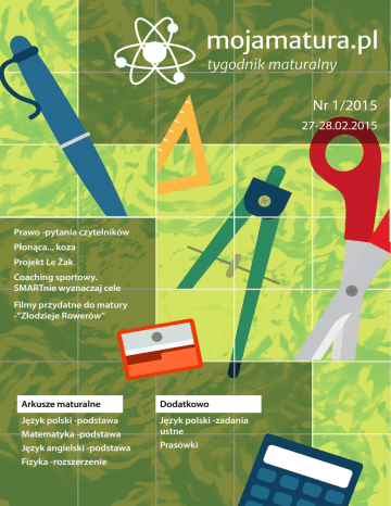 Nr 1/2015 27-28.02.2015 ISSN ISSN Spis Treści 2 .................................................. Wstep redaktorski 40 ................................................ Część edukacyjna 5 ................................................. Dietetyczne ABC... 41 ..................................... Język polski -podstawa 7 ........................Air Soft Gun -czyli paintball bez 54 .................................... Matematyka -podstawa farby 9 ...................................... Czym jest rynek FOREX? 11 .......................... Filmy przydatne do matury - “Złodzieje Rowerów” 14 .......................................................Płonąca... koza 72 ............................... Język angielski -podstawa 82 ........................................... Fizyka -rozszerzenie 99 ............................................... Jezyk polski ustny 115 .............................................................. Prasówki 16 .............................................. Patriotyzm w rapie 18 ............................ Prawo -pytania czytelników 20 ........................................ Czy warto rozmawiać z psychologiem szkolnym? 22 ........................... Ściąganie plików z internetu 25 .......................Coaching sportowy. SMARTnie wyznaczaj cele 27 .............................. Czego jeszcze potrzeba Ci, abyś zmieniał świat? 29 .............................. Laserowa Mysz Dla Gracza Kontakt: - Doradzamy Jak Wybrać i Kupić Mądrze Wydawca Instytut Edukacyjny AKADEMOS Patrycja Czarnecka-Jaskóła MojaMatura.pl ul. Dąbrowskiego 8 lok. 23 42-202 Częstochowa 32 .......................................Sanitas animalium pro salute homini 36 ..................................... Kosmetyki i takie tam... 38 ................................................... Projekt «Le Żak» Redaktor naczelny Tomasz Jaskóła [email protected] 887 645 231 Redakcja [email protected] Reklama [email protected] 2 Wstęp Dziś wielki dzień dla naszego, prawie 40 osobowego, zespołu. Oddajemy w Wasze ręce tygodnik MojaMatura.pl. Nasz zespół to wspaniali ludzie, którzy stanowią o sile tego pisma. Znajdziecie ich w zakładce zespół, czytacie ich materiały i artykuły. Pracowaliśmy nad naszym projektem 13 miesięcy. Dziś widzimy efekty tej pracy, naszej wizji i wysiłku. Nasz tygodnik – mam nadzieję tak właśnie pisać „Nasz” – jest eksperymentem na rynku edukacyjnym w Polsce. Składa się z dwóch części: „lajtowej” części nieedukacyjnej i części edukacyjnej - stanowiącej powtórkę przed maturą / będącej przygotowaniem do matury. W pierwszej części zapoznacie się z różnymi cyklami, które -mogą Was zainteresować w czasie, w którym przygotowujecie się do - najważniejszego dla Was egzaminu w 2015 roku. Niektóre z nich służą poradą w problemach, jakie możecie napotkać w tym wieku, inne mają charakter bardziej rozrywkowy. Są tam cykle: maturzysta i prawo, psychologia, ASG/militaria, moda trendy, muzyka, zdrowie i uroda - w tym fitness z trenerem, wizaż, technologie, Videotesty.pl, portrety osób, które odniosły sukces, ludzi intrygujących, oryginalnych, bądź tych którzy zderzyli się z trudną rzeczywistością - (licealistów, studentów, 30 latków, emigrantów), fauna i flora, spor t, miss i mister mojamatura. pl, ciekawostki maturalne itd. Druga część składa się z trzech części: oryginalnych, profesjonalnych materiałów opracowywanych dla naszego tygodnika przez najlepszych specjalistów. Uznaliśmy, że do godziny „0” czyli do 4 maja 2015 -, wydamy dla Was blisko 100 arkuszy maturalnych z rozwiązaniami z 14 przedmiotów. W każdym numerze znajdziecie 4-5 arkuszy z różnych przedmiotów. Druga części to cotygodniowe „prasówki” z prasy i telewizji potrzebne do nauczania wiedzy o społeczeństwie, ale i potrzebne do ogólnego rozwoju każdego ucznia szkoły ponadgimnazjalnej w klasach od 1 do 3. Kolejnym elementem jest pięć opracowanych tematów do matury ustnej z języka polskiego co tydzień oraz film godny obejrzenia przed maturą „Polaka” czy WOS-u wraz z recenzją tego filmu. Trzecią częścią są odpowiedzi do arkuszy – te pojawią się z następnym numerze. Czy to jest płatne? Za wyjątkiem bieżącego numeru … hmm … niestety tak! Uznaliśmy, że istnieją tylko dwa abonamenty – miesięczny i roczny. Miesięczny to 9,99 PLN natomiast do 31 sierpnia 2015 roku „półroczny” 19,99 PLN. W przypadku niepowodzenia – czego Wam i sobie nie życzymy, macie dostęp przed sierpniową poprawką do kolejnych nowych arkuszy przez dwa miesiące. Zauważyliście z pewnością, że dostajecie świetne i profesjonalne narzędzie do pracy w przygotowaniu do matury 2015 roku. Zatem - praktyczny poradnik: zaloguj się na www. mojamatura.pl, opłać abonament – najlepiej do sierpnia 2015 za 19,99 i miej dostęp do arkuszy i niespodzianek oraz konkursów. Pobieraj co tydzień w każdy piątek treść naszego tygodnika w trzech rozszerzeniach pdf., epub, mobi. Poczytaj sobie, daj „lajka” na FB profilowi mojamatura.pl. Wydrukuj sobie arkusze i rozwiązuj … sukcesywnie ze wszystkich przedmiotów maturalnych. Co tydzień dostaniesz nowe arkusze, nowe artykuły i odpowiedzi do poprzednich numerów. Zapraszam do najlepszego tygodnia edukacyjnego w Polsce … Red. naczelny Tomasz Jaskóła 3 88 nowych arkuszy do 4 maja co tydzień nowe zestawy 20 typów arkuszy 14 przedmiotów 120 tematów ustnych z języka polskiego 100 prasówek Dietetyczne ABC… Jakub Feliksik [email protected] Coach i trener sportowy. Absolwent AWF w Krakowie. Ekspert Fitness, absolwent kursów CrossFit. Wielki miłośnik sportu i zdrowego stylu życia. Piłkarz, tenisista, bokser, narciarz. Trener personalny. Dietetyczne ABC… Moje zainteresowanie zdrowym stylem życia trwa od dobrych dwudziestu lat. W tym czasie byłem świadkiem kilku, kilkunastu trendów dietetycznych. Dieta to nic innego, jak sposób w jaki 