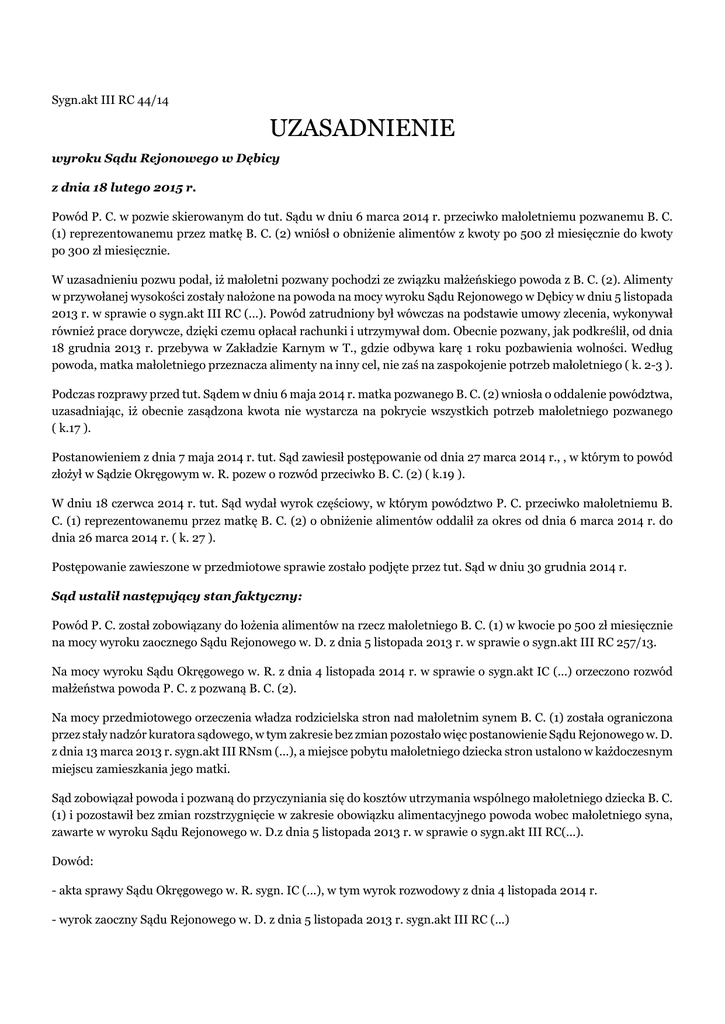 Sygn.akt III RC 44/14 UZASADNIENIE wyroku Sądu Rejonowego w Dębicy z dnia 18 lutego 2015 r. Powód P. C. w pozwie skierowanym do tut. Sądu w dniu 6 marca 2014 r. przeciwko małoletniemu pozwanemu B. C. (1) reprezentowanemu przez matkę B. C. (2) wniósł o obniżenie alimentów z kwoty po 500 zł miesięcznie do kwoty po 300 zł miesięcznie. W uzasadnieniu pozwu podał, iż małoletni pozwany pochodzi ze związku małżeńskiego powoda z B. C. (2). Alimenty w przywołanej wysokości zostały nałożone na powoda na mocy wyroku Sądu Rejonowego w Dębicy w dniu 5 listopada 2013 r. w sprawie o sygn.akt III RC (...). Powód zatrudniony był wówczas na podstawie umowy zlecenia, wykonywał również prace dorywcze, dzięki czemu opłacał rachunki i utrzymywał dom. Obecnie pozwany, jak podkreślił, od dnia 18 grudnia 2013 r. przebywa w Zakładzie Karnym w T., gdzie odbywa karę 1 roku pozbawienia wolności. Według powoda, matka małoletniego przeznacza alimenty na inny cel, nie zaś na zaspokojenie potrzeb małoletniego ( k. 2-3 ). Podczas rozprawy przed tut. Sądem w dniu 6 maja 2014 r. matka pozwanego B. C. (2) wniosła o oddalenie powództwa, uzasadniając, iż obecnie zasądzona kwota nie wystarcza na pokrycie wszystkich potrzeb małoletniego pozwanego ( k.17 ). Postanowieniem z dnia 7 maja 2014 r. tut. Sąd zawiesił postępowanie od dnia 27 marca 2014 r., , w którym to powód złożył w Sądzie Okręgowym w. R. pozew o rozwód przeciwko B. C. (2) ( k.19 ). W dniu 18 czerwca 2014 r. tut. Sąd wydał wyrok częściowy, w którym powództwo P. C. przeciwko małoletniemu B. C. (1) reprezentowanemu przez matkę B. C. (2) o obniżenie alimentów oddalił za okres od dnia 6 marca 2014 r. do dnia 26 marca 2014 r. ( k. 27 ). Postępowanie zawieszone w przedmiotowe sprawie zostało podjęte przez tut. Sąd w dniu 30 grudnia 2014 r. Sąd ustalił następujący stan faktyczny: Powód P. C. został zobowiązany do łożenia alimentów na rzecz małoletniego B. C. (1) w kwocie po 500 zł miesięcznie na mocy wyroku zaocznego Sądu Rejonowego w. D. z dnia 5 listopada 2013 r. w sprawie o sygn.akt III RC 257/13. Na mocy wyroku Sądu Okręgowego w. R. z dnia 4 listopada 2014 r. w sprawie o sygn.akt IC (...) orzeczono rozwód małżeństwa powoda P. C. z pozwaną B. C. (2). Na mocy przedmiotowego orzeczenia władza rodzicielska stron nad małoletnim synem B. C. (1) została ograniczona przez stały nadzór kuratora sądowego, w tym zakresie bez zmian pozostało więc postanowienie Sądu Rejonowego w. D. z dnia 13 marca 2013 r. sygn.akt III RNsm (...), a miejsce pobytu małoletniego dziecka stron ustalono w każdoczesnym miejscu zamieszkania jego matki. Sąd zobowiązał powoda i pozwaną do przyczyniania się do kosztów utrzymania wspólnego małoletniego dziecka B. C. (1) i pozostawił bez zmian rozstrzygnięcie w zakresie obowiązku alimentacyjnego powoda wobec małoletniego syna, zawarte w wyroku Sądu Rejonowego w. D.z dnia 5 listopada 2013 r. w sprawie o sygn.akt III RC(...). Dowód: - akta sprawy Sądu Okręgowego w. R. sygn. IC (...), w tym wyrok rozwodowy z dnia 4 listopada 2014 r. - wyrok zaoczny Sądu Rejonowego w. D. z dnia 5 listopada 2013 r. sygn.akt III RC (...) Powód P. C. ma 42 lat. Obecnie w Zakładzie Karnym w T. odbywa karę pozbawienia wolności orzeczoną za znęcanie nad rodziną. Nie wykonuje odpłatnej pracy w jednostce więziennej. Nie posiada na koncie depozytowym żadnych środków pieniężnych. Przed umieszczeniem w zakładzie karnym powód podejmował prace dorywcze, zatrudniany był na podstawie umowy zlecenia, nie był zatrudniany na okres dłuższy niż 1 miesiąc. Do chwili umieszczenia w zakładzie karnym codziennie pił alkohol. Każdego dnia wychodził z domu w godzinach porannych i wracał wieczorem. Dowód: - informacja Dyrektora Zakładu Karnego w T. z dnia 22 maja 2014 r. – k. 24; - akta dozoru tut. Sądu nad P. C. (...) i IIK 164/14 i akta Opm 28/13 - zeznania pozwanej B. C. (2) – k.47-48 Pozwana B. C. (2) ma 42 lata. Nie posiada stałego zatrudnienia. Wykonuje prace o charakterze dorywczym, w tym jako pomoc domowa, sprząta, wykonuje prace w szklarni przy kwiatach. Pozwana korzysta ze wsparcia Miejskiego Ośrodka Pomocy Społecznej w P., który to wypłaca jej miesięcznie tytułem zasiłków kwotę średnio 280 zł. Alimenty na rzecz małoletniego syna B. wypłacane są przez Fundusz Alimentacyjny. Małoletni B. ma 11 lat i jest obecnie uczniem V klasy Szkoły Podstawowej. Jest chłopcem zdrowym, prawidłowo rozwijającym się. Matka małoletniego wynajmuje drewniany dom w P., za wynajem którego płaci kwotę 325 zł miesięcznie. Rachunki za prąd opiewają na kwotę 150 zł miesięcznie, zakup butli z gazem, która wystarcza na okres 2 miesięcy to wydatek 55 zł. Opłata za wodę łączy się z kosztem 50 zł za okres dwóch miesięcy, opłata za wywóz śmieci za okres dwóch miesięcy wynosi 48 zł. W okresie zimowym dom ogrzewany jest piecami kaflowymi. Pozwana posiada kuchnię kaflową, na której przyrządza potrawy w okresie zimowym. W obecnym roku pozwana zakupiła 300 kg węgla, korzystała również z opału z ubiegłego roku. W grudniu 2014 r. pozwana otrzymała z Miejskiego Ośrodka Pomocy Społecznej w P. kwotę 300 zł na zakup opału. Dorosły syn J. we wrześniu 2014 r. powrócił do domu i podjął naukę w pierwszej klasie Liceum dla Dorosłych w P.. Pracuje dorywczo u sąsiadów, jeśli posiada środki pieniężne zakupuje żywność dla rodziny. Drugi syn M. założył własną rodzinę, mieszka z narzeczoną. Wspiera pozwaną finansowo, jeśli potrzebuje ona pieniędzy, czasem robi również zakupy żywnościowe. Dowód: - zeznania pozwanej B. C. (2) – k.47-48, k. 55 Sąd ustalił stan faktyczny na podstawie zgromadzonego w sprawie materiału dowodowego, w tym na podstawie wydanych dotychczas orzeczeń w przedmiocie alimentów oraz informacji Dyrektora Zakładu Karnego w T. dotyczącej obecnej sytuacji zarobkowej i mater