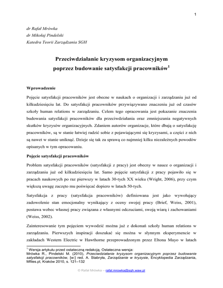 1 dr Rafał Mrówka dr Mikołaj Pindelski Katedra Teorii Zarządzania SGH Przeciwdziałanie kryzysom organizacyjnym poprzez budowanie satysfakcji pracowników1 Wprowadzenie Pojęcie satysfakcji pracowników jest obecne w naukach o organizacji i zarządzaniu już od kilkudziesięciu lat. Do satysfakcji pracowników przywiązywano znaczeniu już od czasów szkoły human relations w zarządzaniu. Celem tego opracowania jest pokazanie znaczenia budowania satysfakcji pracowników dla przeciwdziałania oraz zmniejszania negatywnych skutków kryzysów organizacyjnych. Zdaniem autorów organizacje, które dbają o satysfakcję pracowników, są w stanie łatwiej radzić sobie z pojawiającymi się kryzysami, a części z nich są nawet w stanie uniknąć. Dzieje się tak za sprawą co najmniej kilku niezależnych powodów opisanych w tym opracowaniu. Pojęcie satysfakcji pracowników Problem satysfakcji pracowników (satysfakcji z pracy) jest obecny w nauce o organizacji i zarządzaniu już od kilkudziesięciu lat. Samo pojęcie satysfakcji z pracy pojawiło się w pracach naukowych po raz pierwszy w latach 30-tych XX wieku (Wright, 2006), przy czym większą uwagę zaczęto mu poświęcać dopiero w latach 50-tych. Satysfakcja z pracy (satysfakcja pracowników) definiowana jest jako wywołujący zadowolenie stan emocjonalny wynikający z oceny swojej pracy (Brief, Weiss, 2001), postawa wobec własnej pracy związana z własnymi odczuciami, swoją wiarą i zachowaniami (Weiss, 2002). Zainteresowanie tym pojęciem wywodzić można już z dokonań szkoły human relations w zarządzaniu. Pierwszych inspiracji doszukać się można w słynnym eksperymencie w zakładach Western Electric w Hawthorne przeprowadzonym przez Eltona Mayo w latach 1 Wersja artykułu przed ostateczną redakcją. Ostateczna wersja: Mrówka R., Pindelski M. (2010), Przeciwdziałanie kryzysom organizacyjnym poprzez budowanie satysfakcji pracowników, [w:] red. A. Stabryła, Zarządzanie w kryzysie, Encyklopedia Zarządzania, Mfiles.pl, Kraków 2010, s. 121–132 © Rafał Mrówka – [email protected] 2 1927-1932, który wykazał, że robotnicy reagują na społeczny kontekst pracy, włączając w to przygotowanie społeczne, normy grupowe oraz dynamikę kontaktów międzyludzkich (Mayo, 1933). Potem także Vroom dowodził, że „podejście human relations można opisać jako próbę zwiększenia produktywności poprzez zaspokojenie potrzeb pracowników” (za Schwab, Cummings, 1983, str. 186). Wyciągnięto stąd także wniosek, że troska menedżera o robotników doprowadzi do wzrostu zadowolenia, które z kolei zaowocuje poprawą wyników. Potem problem satysfakcji z pracy pojawiał się wielokrotnie przy modelach motywowania pracowników. Początkowo były to modele związane z zaspokajaniem potrzeb. Stąd fundamentów dla zainteresowania pojęciem satysfakcji z pracy szukać można także w teorii Maslowa (1943). Teoria ta została poddana wprawdzie gruntownej krytyce, nie dotyczyła ona jednak problemów związanych z satysfakcją i jej związków z efektywnością wykonywanej pracy. Dziwił jednak fakt, że próby wykonywania badań potwierdzających hipotezę o istnieniu takiego związku zakończyły się fiaskiem. Nie udało się wychwycić większych korelacji między tymi dwoma zjawiskami. Ta sytuacja nie budziła jednak zaniepokojenia wśród teoretyków szkoły human relations. Niemożność wykazania związku tłumaczono raczej brakami metodologicznymi badań, trudnością w badaniu zjawiska, subiektywnością pojęcia satysfakcji. Sprawą zainteresował się między innymi Herzberg i stworzył jedną z najpopularniejszych do dziś teorii związanych z satysfakcją pracowników – teorię dwuczynnikową. Według tej teorii zadowolenie i niezadowolenie nie znajdują się na skraju jednego kontinuum, a raczej są zupełnie niezależne. Jeden zestaw cech wpływa na zadowolenie lub jego brak (są to czynniki motywacji, czyli osiągnięcia, uznanie, sama praca, odpowiedzialność, awanse i rozwój), drugi niezależny zestaw wpływa natomiast na brak niezadowolenia lub jego występowanie (czynniki higieny – przełożeni, warunki pracy, stosunki interpersonalne, płaca i bezpieczeństwo, polityka i administracja firmy). Pierwsza grupa czynników związana jest z samą treścią pracy, druga natomiast ze środowiskiem pracy. Proces motywowania składa się z dwóch etapów. W pierwszym trzeba dopilnować czynników higienicznych, aby pracownicy nie czuli się niezadowoleni, w drugim motywacji, aby pracownicy poczuli zadowolenie. Ograniczenie się do czynników higienicznych powoduje, że pracownicy ograniczają swój wysiłek jedynie do niezbędnego minimum. Natomiast, aby zwiększyć produktywność, potrzebna jest satysfakcja, na którą wpływają czynniki motywujące. Badań Herzberga krytykowanych pod względem metodologicznym (mała i niereprezentatywna próba) nie udało się jednak praktycznie potwierdzić (King, 1983, str. 198© Rafał Mrówka – [email protected] 3 213). Nie stworzył on też teoretycznego wyjaśnienia związku przyczynowo-skutkowego między satysfakcją i wykonywaniem zadań, którego istnienie zakładał. Przedstawione wyżej koncepcje satysfakcji z pracy opierały się na założeniu, że satysfakcja pracowników jest czynnikiem wpływającym na wzrost ich efektywności. Tymczasem badania empiryczne pokazywały raczej, że korelacja między efektywnością i satysfakcją z pracy jest bardzo niewielka (Vroom, 1964, Iaffaldano, Muchinsky, 1985), co czyni zainteresowanie budowaniem satysfakcji pracowników bezcelowym. Pewne wytłumaczenie i pogłębienie tego problemu można znaleźć w pracach Hackmana i Oldhama (1980, Vecchio, 1995, Sikorski, 1999). Zaproponowali oni kompleksową teorię wzbogacenia pracy, która wyjaśnia, jak różne wymiary pracy wpływają na zachowanie pracowników. Zgodnie z tym modelem, wyniki pracy takie jak pragnienie dobrego wykonania zadania (czyli wewnętrzna 