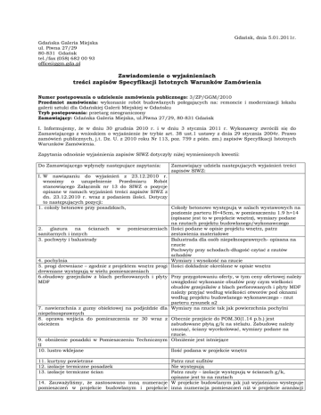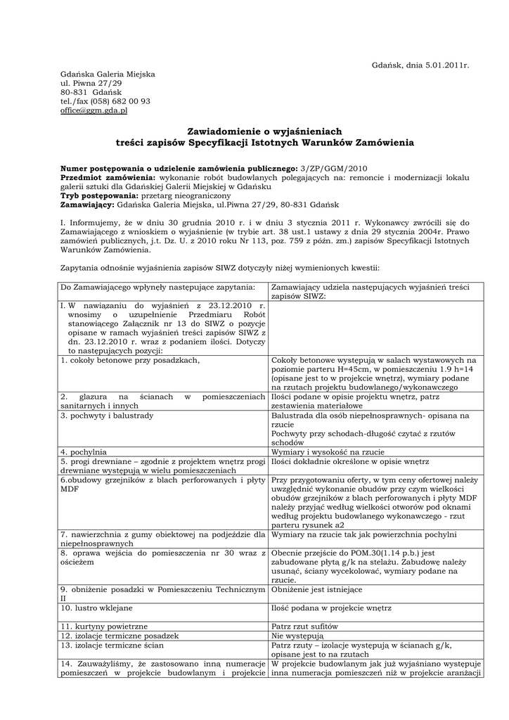 Gdańsk, dnia 5.01.2011r. Gdańska Galeria Miejska ul. Piwna 27/29 80-831 Gdańsk tel./fax (058) 682 00 93 [email protected] Zawiadomienie o wyjaśnieniach treści zapisów Specyfikacji Istotnych Warunków Zamówienia Numer postępowania o udzielenie zamówienia publicznego: 3/ZP/GGM/2010 Przedmiot zamówienia: wykonanie robót budowlanych polegających na: remoncie i modernizacji lokalu galerii sztuki dla Gdańskiej Galerii Miejskiej w Gdańsku Tryb postępowania: przetarg nieograniczony Zamawiający: Gdańska Galeria Miejska, ul.Piwna 27/29, 80-831 Gdańsk I. Informujemy, że w dniu 30 grudnia 2010 r. i w dniu 3 stycznia 2011 r. Wykonawcy zwrócili się do Zamawiającego z wnioskiem o wyjaśnienie (w trybie art. 38 ust.1 ustawy z dnia 29 stycznia 2004r. Prawo zamówień publicznych, j.t. Dz. U. z 2010 roku Nr 113, poz. 759 z późn. zm.) zapisów Specyfikacji Istotnych Warunków Zamówienia. Zapytania odnośnie wyjaśnienia zapisów SIWZ dotyczyły niżej wymienionych kwestii: Do Zamawiającego wpłynęły następujące zapytania: Zamawiający udziela następujących wyjaśnień treści zapisów SIWZ: I. W nawiązaniu do wyjaśnień z 23.12.2010 r. wnosimy o uzupełnienie Przedmiaru Robót stanowiącego Załącznik nr 13 do SIWZ o pozycje opisane w ramach wyjaśnień treści zapisów SIWZ z dn. 23.12.2010 r. wraz z podaniem ilości. Dotyczy to następujących pozycji: 1. cokoły betonowe przy posadzkach, Cokoły betonowe występują w salach wystawowych na poziomie parteru H=45cm, w pomieszczeniu 1.9 h=14 (opisane jest to w projekcie wnętrz), wymiary podane na rzutach projektu budowlanego/wykonawczego 2. glazura na ścianach w pomieszczeniach Ilości podane w opisie projektu wnętrz, patrz sanitarnych i innych zestawienia materiałowe 3. pochwyty i balustrady Balustrada dla osób niepełnosprawnych- opisana na rzucie Pochwyty przy schodach-długość czytać z rzutów schodów 4. pochylnia Wymiary i wysokość na rzucie 5. progi drewniane – zgodnie z projektem wnętrz progi Ilości dokładnie określone w opisie wnętrz drewniane występują w wielu pomieszczeniach 6.obudowy grzejników z blach perforowanych i płyty Przy przygotowaniu oferty, w tym ceny ofertowej należy MDF uwzględnić wykonanie obudów przy czym wielkości obudów grzejników z blach perforowanych i płyty MDF należy przyjąć według wielkości otworów pod oknami według projektu budowlanego wykonawczego - rzut parteru rysunek a2 7. nawierzchnia z gumy obiektowej na podjeździe dla Wymiary na rzucie tak jak powierzchnia pochylni niepełnosprawnych 8. oprawa wejścia do pomieszczenia nr 30 wraz z Obecnie przejście do POM.30(1.14 p.b.) jest ościeżem zabudowane płytą g/k na stelażu. Zabudowę należy usunąć, ściany wycekolować, wymiary podane na rzucie. 9. obniżenie posadzki w Pomieszczeniu Technicznym Obniżenie jest istniejące II 10. lustro wklejane Ilość podana w projekcie wnętrz 11. kurtyny powietrzne 12. izolacje termiczne posadzek 13. izolacje termiczne ścian Patrz rzut sufitów Nie występują Patrz rzuty – izolacje występują w ścianach g/k, opisane jest to na rzutach 14. Zauważyliśmy, że zastosowano inną numeracje W projekcie budowlanym jak już wyjaśniano występuje pomieszczeń w projekcie budowlanym i projekcie inna numeracja pomieszczeń niż w projekcie aranżacji aranżacji wnętrz, do którego odwołuje się projekt budowlany. I tak pom. Nr 30 z proj. aranżacji odpowiada najprawdopodobniej pom. Nr 1.17 z projektu budowlanego i wtedy uzasadnione pozostaje pytanie nr 26.20 o oprawę wejścia do pomieszczenia nr 30. Wnosimy o sprecyzowanie, która dokumentacja jest obowiązująca i stanowi podstawę do wyceny. wnętrz, zgodnie z informacjami architekta pomieszczenie Nr 30 z projektu aranżacji wnętrz odpowiada przejściu pomiędzy pomieszczeniami oznaczonymi w projekcie budowlanym numerami 1.14 i 1.12 15. W pozycji nr 1 przedmiaru jest mowa o 2 szt. Proszę przyjąć tak jak w projekcie O12,O13 i okienko ościeżnic drewnianych o powierzchni ponizej 1 m2 - nad O10 mają powierzchnię poniżej 1m2 wg zestawienia stolarki sa 3 szt. takich ościeżnic (O10 male, O12, O13). Co nalezy uwzględnić w wycenie? 16. W pozycji nr 2 przedmiaru jest mowa o 6 szt. Proszę przyjąć tak jak w projekcie. ościeżnic drewnianych o powierzchni do 2m2 - wg zestawienia stolarki jest 5 szt. takich ościeżnic (O2, O11 - 2 szt., O14, O15). Co należy uwzględnić w wycenie? 17. W pozycji 5 przedmiaru jest mowa o oknach o Proszę przyjąć tak jak w projekcie. powierzchni do 1 m2. Podana powierzchnia nie zgadza się z powierzchnią okien wyliczoną z zestawienia stolarki -jest 33,605 m2, a powinno być 0,6345 m2. Czy przyjąć wartość wynikajającą z zestawienia stolarki czy Zamawiajacy uwzględnił w pozycji nr 5 jeszcze jakies inne okna, nie uwzględnione w zestawieniu które należy uwzględnic w wycenie? 18. Pozycja nr 8 dotyczy mycia okien. Podana w Proszę przyjąć tak jak w projekcie. przedmiarze całkowita ich powierzchnia 98,363 m2 jest znacznie większa niż wynika z zestawienia stolarki (65,686m2). Jaką powierzchnię przyjać do wyceny? 19. Pozycja nr 9 przedmiaru dotyczy parapetów Proszę przyjąć tak jak projekcie wewnętrznych. Zgodnie z odpowiedziami na pytania konglomeratu kamiennego i drewniane. z 23 grudnia 2010 r. wszystkie parapety mają być z postformingu, a zgodnie z dokumentacją zamieszczoną przez Zamawiającego wraz z modyfikacją 1 SIWZ w pomieszczeniach 7, 8, 12, 28, 31 i 32 parapety mają być z konglomeratu kamiennego, a w pomieszezeniach 17 - 23 drewniane. Jakie parapety przyjąć do wyceny? 20. Czy pozycje 20 i 21 dotyczą renowacji drzwi zewnętrznych od strony ul. Grobla I i ul. Szerokiej? Jezeli tak to podana w przedmiarze powierzchnia jest niezgodna z wymiarami drzwi podanymi na rysunkach. Podana jest powierzchnia 13,27m2 a zgodnie z podanymi wymiarami powinno być 10,19m2x2 (ze względu na renowację obu stron drzwi). Co należy przyjać do wyceny? w