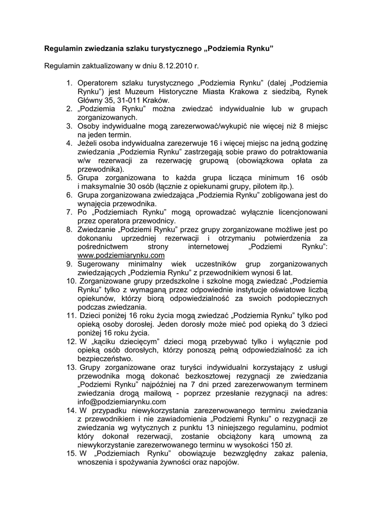 Regulamin zwiedzania szlaku turystycznego „Podziemia Rynku” Regulamin zaktualizowany w dniu 8.12.2010 r. 1. Operatorem szlaku turystycznego „Podziemia Rynku” (dalej „Podziemia Rynku”) jest Muzeum Historyczne Miasta Krakowa z siedzibą, Rynek Główny 35, 31-011 Kraków. 2. „Podziemia Rynku” moŜna zwiedzać indywidualnie lub w grupach zorganizowanych. 3. Osoby indywidualne mogą zarezerwować/wykupić nie więcej niŜ 8 miejsc na jeden termin. 4. JeŜeli osoba indywidualna zarezerwuje 16 i więcej miejsc na jedną godzinę zwiedzania „Podziemia Rynku” zastrzegają sobie prawo do potraktowania w/w rezerwacji za rezerwację grupową (obowiązkowa opłata za przewodnika). 5. Grupa zorganizowana to kaŜda grupa licząca minimum 16 osób i maksymalnie 30 osób (łącznie z opiekunami grupy, pilotem itp.). 6. Grupa zorganizowana zwiedzająca „Podziemia Rynku” zobligowana jest do wynajęcia przewodnika. 7. Po „Podziemiach Rynku” mogą oprowadzać wyłącznie licencjonowani przez operatora przewodnicy. 8. Zwiedzanie „Podziemi Rynku” przez grupy zorganizowane moŜliwe jest po dokonaniu uprzedniej rezerwacji i otrzymaniu potwierdzenia za pośrednictwem strony internetowej „Podziemi Rynku”: www.podziemiarynku.com 9. Sugerowany minimalny wiek uczestników grup zorganizowanych zwiedzających „Podziemia Rynku” z przewodnikiem wynosi 6 lat. 10. Zorganizowane grupy przedszkolne i szkolne mogą zwiedzać „Podziemia Rynku” tylko z wymaganą przez odpowiednie instytucje oświatowe liczbą opiekunów, którzy biorą odpowiedzialność za swoich podopiecznych podczas zwiedzania. 11. Dzieci poniŜej 16 roku Ŝycia mogą zwiedzać „Podziemia Rynku” tylko pod opieką osoby dorosłej. Jeden dorosły moŜe mieć pod opieką do 3 dzieci poniŜej 16 roku Ŝycia. 12. W „kąciku dziecięcym” dzieci mogą przebywać tylko i wyłącznie pod opieką osób dorosłych, którzy ponoszą pełną odpowiedzialność za ich bezpieczeństwo. 13. Grupy zorganizowane oraz turyści indywidualni korzystający z usługi przewodnika mogą dokonać bezkosztowej rezygnacji ze zwiedzania „Podziemi Rynku” najpóźniej na 7 dni przed zarezerwowanym terminem zwiedzania drogą mailową - poprzez przesłanie rezygnacji na adres: [email protected] 14. W przypadku niewykorzystania zarezerwowanego terminu zwiedzania z przewodnikiem i nie zawiadomienia „Podziemi Rynku” o rezygnacji ze zwiedzania wg wytycznych z punktu 13 niniejszego regulaminu, podmiot który dokonał rezerwacji, zostanie obciąŜony karą umowną za niewykorzystanie zarezerwowanego terminu w wysokości 150 zł. 15. W „Podziemiach Rynku” obowiązuje bezwzględny zakaz palenia, wnoszenia i spoŜywania Ŝywności oraz napojów. 16. W „Podziemiach Rynku” obowiązuje zakaz filmowania, nagrywania oraz fotografowania z uŜyciem lampy błyskowej. 17. „Podziemia Rynku” naleŜy zwiedzać zgodnie z ustalonym porządkiem zwiedzania. 18. Podczas zwiedzania naleŜy stosować się do uwag i zaleceń przewodnika oraz pracowników obsługi „Podziemi Rynku”. 19. Zabrania się wstępu do „Podziemi Rynku” osobom nietrzeźwym lub zachowującym się w sposób, który zagraŜałby bezpieczeństwu innych osób, zbiorów. 20. „Podziemia Rynku” zastrzegają sobie prawo do usunięcia zwiedzających zakłócających porządek zwiedzania, niszczących mienie oraz naruszających ogólnie przyjęte normy zachowania w miejscach publicznych. 21. „Podziemia Rynku” zastrzegają sobie prawo do naliczenia opłaty za zniszczone mienie. 22. Zabrania się wnoszenia na wystawę: broni palnej i białej, amunicji, przedmiotów uznanych za potencjalnie niebezpieczne, materiałów wybuchowych, łatwopalnych i toksycznych, długich parasoli, statywów, plecaków, duŜego bagaŜu, zwierząt. 23. „Podziemia Rynku” zastrzegają sobie prawo nie przyjęcia grup nie przestrzegających niniejszego regulaminu. 24. Zabrania się odstępowania, zamiany, cesji lub odsprzedaŜy terminów wizyt w „Podziemiach Rynku” zarezerwowanych w systemie on-line bez zgody „Podziemi Rynku”. Termin zwiedzania moŜe być wykorzystany jedynie przez podmiot, który dokonał rezerwacji zwiedzania. 25. Ustala się następujące ceny biletów: • bilet normalny 13 zł • bilet ulgowy 10 zł (emeryci, renciści, młodzieŜ ucząca się do 26 roku Ŝycia za okazaniem legitymacji) • bilet grupowy 10 zł • bilet grupowy szkolny 7 zł (młodzieŜ ucząca się do 26 roku Ŝycia za okazaniem legitymacji) opieka 1 osoba/15 gratis – czyli kaŜda 16 osoba gratis. • bilet rodzinny 30 zł (2 osoby dorosłe i 2 dzieci lub 1 osoba dorosła i 3 dzieci) • dzieci do lat 5 – bezpłatnie • usługa przewodnicka 150 zł • usługa przewodnicka dla szkół 110 zł/od grupy 26. Za uszkodzony lub zgubiony bloczek do szatni naliczana jest opłata w wysokości 10 zł. 27. Ustala się następujące dni i godziny otwarcia: PONIEDZIAŁEK 10:00 - 20:00 WTOREK 10:00 - 16:00 ŚRODA 10:00 - 20:00 CZWARTEK 10:00 - 20:00 PIĄTEK 10:00 - 20:00 SOBOTA 10:00 - 20:00 NIEDZIELA 10:00 - 20:00 28. „Podziemia Rynku” zastrzegają sobie prawo zmiany godzin zwiedzania. 29. Ostatnie wejście do „Podziemi Rynku” dla osób indywidualnych na 60 minut przed ich zamknięciem. Ostatnie wejście do „Podziemi Rynku” dla grup zorganizowanych na 90 minut przed ich zamknięciem. 30. Czas zwiedzania przez osoby indywidualne wynosi ok. 60 minut. 31. Przewodnicy dostępni są w 6 językach: angielskim, niemieckim, francuskim, japońskim, rosyjskim, włoskim. 32. Audioprzewodnik dostępny w języku: angielskim, niemieckim, francuskim, hiszpańskim, włoskim, rosyjskim - w cenie 5 zł (wymagany dokument ze zdjęciem ). 33. Rezerwacja oraz wykupienie biletu wiąŜe się z akceptacją niniejszego regulaminu.