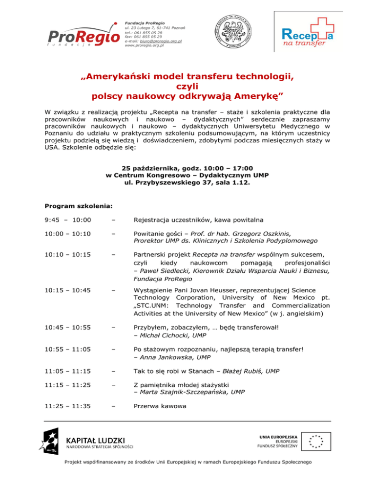Fundacja ProRegio ul. 23 Lutego 7, 61-741 Poznań tel.: 061 855 05 28 fax: 061 855 05 29 e-mail: [email protected] www.proregio.org.pl „Amerykański model transferu technologii, czyli polscy naukowcy odkrywają Amerykę” W związku z realizacją projektu „Recepta na transfer – staże i szkolenia praktyczne dla pracowników naukowych i naukowo – dydaktycznych” serdecznie zapraszamy pracowników naukowych i naukowo – dydaktycznych Uniwersytetu Medycznego w Poznaniu do udziału w praktycznym szkoleniu podsumowującym, na którym uczestnicy projektu podzielą się wiedzą i doświadczeniem, zdobytymi podczas miesięcznych staży w USA. Szkolenie odbędzie się: 25 października, godz. 10:00 – 17:00 w Centrum Kongresowo – Dydaktycznym UMP ul. Przybyszewskiego 37, sala 1.12. Program szkolenia: 9:45 – 10:00 – Rejestracja uczestników, kawa powitalna 10:00 – 10:10 – Powitanie gości – Prof. dr hab. Grzegorz Oszkinis, Prorektor UMP ds. Klinicznych i Szkolenia Podyplomowego 10:10 – 10:15 – Partnerski projekt Recepta na transfer wspólnym sukcesem, czyli kiedy naukowcom pomagają profesjonaliści – Paweł Siedlecki, Kierownik Działu Wsparcia Nauki i Biznesu, Fundacja ProRegio 10:15 – 10:45 – Wystąpienie Pani Jovan Heusser, reprezentującej Science Technology Corporation, University of New Mexico pt. „STC.UNM: Technology Transfer and Commercialization Activities at the University of New Mexico” (w j. angielskim) 10:45 – 10:55 – Przybyłem, zobaczyłem, … będę transferował! – Michał Cichocki, UMP 10:55 – 11:05 – Po stażowym rozpoznaniu, najlepszą terapią transfer! – Anna Jankowska, UMP 11:05 – 11:15 – Tak to się robi w Stanach – Błażej Rubiś, UMP 11:15 – 11:25 – Z pamiętnika młodej stażystki – Marta Szajnik-Szczepańska, UMP 11:25 – 11:35 – Przerwa kawowa Projekt współfinansowany ze środków Unii Europejskiej w ramach Europejskiego Funduszu Społecznego Fundacja ProRegio ul. 23 Lutego 7, 61-741 Poznań tel.: 061 855 05 28 fax: 061 855 05 29 e-mail: [email protected] www.proregio.org.pl 11:35 – 12:05 – Wystąpienie Pani Anny Solowiej, reprezentującej Technology Transfer Office przy National Genome Research Institute (National Institute of Health) pt. „Technology transfer practices and policies at the U.S. National Institutes of Health” (w j. angielskim) 12:05 – 12:15 – Nie taka straszna komercjalizacja, potrzeba tylko pieniędzy… – Marcin Ruciński, UMP 12:15 – 12:25 – Stażowe inspiracje, czyli jakie doświadczenie chcę zdobyć – Hanna Piotrowska, Andrzej Czyrski, UMP 12:25 – 12:30 – Podsumowanie – Paweł Siedlecki, Kierownik Działu Wsparcia Nauki i Biznesu, Fundacja ProRegio 12:30 – 13:00 – Lunch 13:00 – 17:00 – Spotkanie konsultacyjne Konsultacje indywidualne z Panią Jovan Heusser oraz Panią Anną Solowiej Zgłoszenie uczestnictwa: Ze względów organizacyjnych i ograniczoną liczbę miejsc, prosimy o zgłoszenie uczestnictwa w szkoleniu do dnia 19 października 2012 r. drogą mailową na adres: [email protected] z dopiskiem „Praktyczne szkolenie podsumowujące”. W zgłoszeniu proszę podać swoje imię, nazwisko oraz stanowisko. Uprzejmie prosimy również o zaznaczenie konsultacjach indywidualnych z gośćmi z USA. w zgłoszeniu chęci uczestnictwa w Informacji dodatkowych udziela Pani Bożena Raducha, Kierownik Działu Współpracy Międzynarodowej i Integracji Europejskiej UMP, Telefon 61 854 60 36. SERDECZNIE ZAPRASZAMY! Projekt współfinansowany ze środków Unii Europejskiej w ramach Europejskiego Funduszu Społecznego Fundacja ProRegio ul. 23 Lutego 7, 61-741 Poznań tel.: 061 855 05 28 fax: 061 855 05 29 e-mail: [email protected] www.proregio.org.pl Informacja o współorganizatorze: Fundacja ProRegio z siedzibą w Poznaniu (www.proregio.org.pl) od 2004 roku skutecznie działa na rzecz efektywnej współpracy sfery nauki i biznesu, realizując projekty o zasięgu regionalnym, ogólnokrajowym i międzynarodowym w obszarze transferu technologii, komercjalizacji wyników prac B+R oraz zarządzania i ochrony własności intelektualnej. Informacja o partnerach ze Stanów Zjednoczonych: Science Technology Corporation University of New Mexico (STC) to firma utworzona z inicjatywy Uniwersytetu New Mexico w 1995 r. Celem jej działalności jest świadczenie usług z zakresu komercjalizacji wyników badań. Specjalizuje się w badaniach rynkowych, poszukiwaniach licencjobiorców i finalizowaniu procesu komercjalizacji technologii, m.in. z takich działów nauki jak: optyka, mikroprzepływy, lecznictwo, farmacja, diagnostyka, aparatura medyczna. Pani Jovan Heusser, posiadająca tytuł M.B.A. z zakresu Finansów Przedsiębiorstw UNM's Anderson School of Management i zakończone studia z zakresu biologii i komunikacji na University of New Mexico, zatrudniona jest w STC na stanowisku Starszego Menedżera Innowacji. Zajmuje się wynalazkami z UNM Health Sciences Center oraz innowacjami związanymi z nauką o życiu oraz inżynierią biomedyczną, działając w obszarze ochrony własności intelektualnej, zgłoszeń patentowych oraz licencjonowania. Technology Transfer Office at the National Genome Research Institute (TTO) to działająca od połowy lat 90-tych instytucja, która odpowiedzialna jest za ewaluację, patentowanie i licencjonowanie nowych technologii, materiałów biologicznych oraz zwierzęcych modeli wynalezionych przez badaczy NHGRI. TTO zapewnia badaczom NHGRI oraz kadrze administracyjnej doradztwo w zakresie praw autorskich, własności intelektualnej i spraw związanych z procedurą transferu technologii. Pani Anna Solowiej – doktor fizjologii komórkowej i molekularnej Uniwersytetu Yale oraz doktor prawa George Washington University Law School; w TTO na stanowisku specjalisty ds. transferu technologii; odpowiedzialna jest za zawieranie umów licencyjnych oraz kwestie związane z własnością intelektualną. Projekt współfinansowany ze środków U