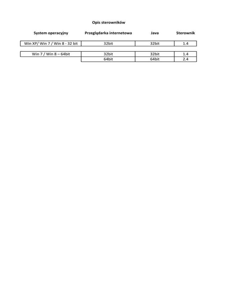 Opis sterowników System operacyjny Przeglądarka internetowa Java Sterownik Win XP/ Win 7 / Win 8 - 32 bit 32bit 32bit 1.4 Win 7 / Win 8 – 64bit 32bit 64bit 32bit 64bit 1.4 2.4