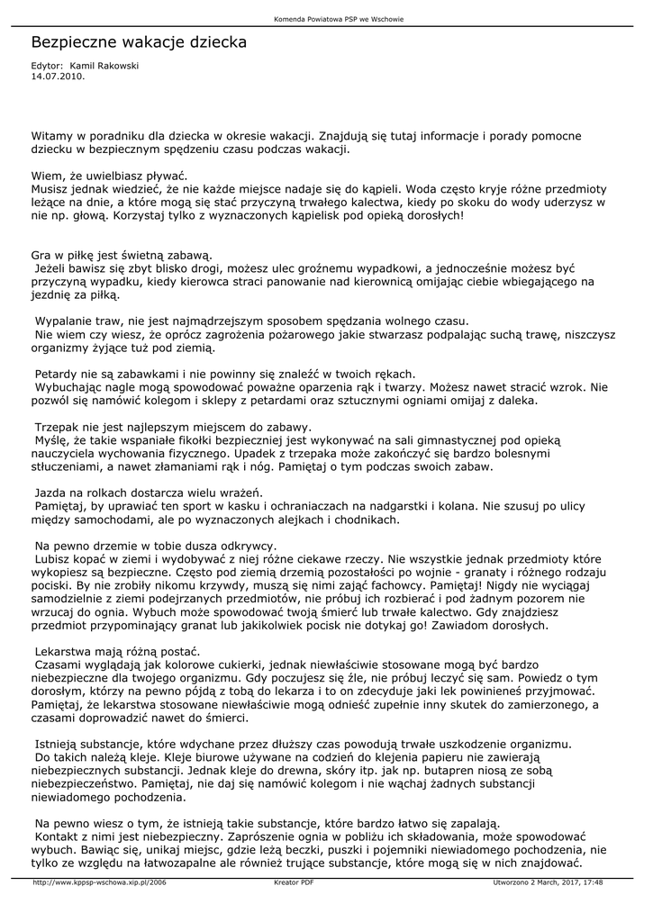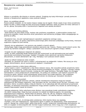 Komenda Powiatowa PSP we Wschowie Bezpieczne wakacje dziecka Edytor: Kamil Rakowski 14.07.2010. Witamy w poradniku dla dziecka w okresie wakacji. Znajdują się tutaj informacje i porady pomocne dziecku w bezpiecznym spędzeniu czasu podczas wakacji. Wiem, że uwielbiasz pływać. Musisz jednak wiedzieć, że nie każde miejsce nadaje się do kąpieli. Woda często kryje różne przedmioty leżące na dnie, a które mogą się stać przyczyną trwałego kalectwa, kiedy po skoku do wody uderzysz w nie np. głową. Korzystaj tylko z wyznaczonych kąpielisk pod opieką dorosłych! Gra w piłkę jest świetną zabawą. Jeżeli bawisz się zbyt blisko drogi, możesz ulec groźnemu wypadkowi, a jednocześnie możesz być przyczyną wypadku, kiedy kierowca straci panowanie nad kierownicą omijając ciebie wbiegającego na jezdnię za piłką. Wypalanie traw, nie jest najmądrzejszym sposobem spędzania wolnego czasu. Nie wiem czy wiesz, że oprócz zagrożenia pożarowego jakie stwarzasz podpalając suchą trawę, niszczysz organizmy żyjące tuż pod ziemią. Petardy nie są zabawkami i nie powinny się znaleźć w twoich rękach. Wybuchając nagle mogą spowodować poważne oparzenia rąk i twarzy. Możesz nawet stracić wzrok. Nie pozwól się namówić kolegom i sklepy z petardami oraz sztucznymi ogniami omijaj z daleka. Trzepak nie jest najlepszym miejscem do zabawy. Myślę, że takie wspaniałe fikołki bezpieczniej jest wykonywać na sali gimnastycznej pod opieką nauczyciela wychowania fizycznego. Upadek z trzepaka może zakończyć się bardzo bolesnymi stłuczeniami, a nawet złamaniami rąk i nóg. Pamiętaj o tym podczas swoich zabaw. Jazda na rolkach dostarcza wielu wrażeń. Pamiętaj, by uprawiać ten sport w kasku i ochraniaczach na nadgarstki i kolana. Nie szusuj po ulicy między samochodami, ale po wyznaczonych alejkach i chodnikach. Na pewno drzemie w tobie dusza odkrywcy. Lubisz kopać w ziemi i wydobywać z niej różne ciekawe rzeczy. Nie wszystkie jednak przedmioty które wykopiesz są bezpieczne. Często pod ziemią drzemią pozostałości po wojnie - granaty i różnego rodzaju pociski. By nie zrobiły nikomu krzywdy, muszą się nimi zająć fachowcy. Pamiętaj! Nigdy nie wyciągaj samodzielnie z ziemi podejrzanych przedmiotów, nie próbuj ich rozbierać i pod żadnym pozorem nie wrzucaj do ognia. Wybuch może spowodować twoją śmierć lub trwałe kalectwo. Gdy znajdziesz przedmiot przypominający granat lub jakikolwiek pocisk nie dotykaj go! Zawiadom dorosłych. Lekarstwa mają różną postać. Czasami wyglądają jak kolorowe cukierki, jednak niewłaściwie stosowane mogą być bardzo niebezpieczne dla twojego organizmu. Gdy poczujesz się źle, nie próbuj leczyć się sam. Powiedz o tym dorosłym, którzy na pewno pójdą z tobą do lekarza i to on zdecyduje jaki lek powinieneś przyjmować. Pamiętaj, że lekarstwa stosowane niewłaściwie mogą odnieść zupełnie inny skutek do zamierzonego, a czasami doprowadzić nawet do śmierci. Istnieją substancje, które wdychane przez dłuższy czas powodują trwałe uszkodzenie organizmu. Do takich należą kleje. Kleje biurowe używane na codzień do klejenia papieru nie zawierają niebezpiecznych substancji. Jednak kleje do drewna, skóry itp. jak np. butapren niosą ze sobą niebezpieczeństwo. Pamiętaj, nie daj się namówić kolegom i nie wąchaj żadnych substancji niewiadomego pochodzenia. Na pewno wiesz o tym, że istnieją takie substancje, które bardzo łatwo się zapalają. Kontakt z nimi jest niebezpieczny. Zaprószenie ognia w pobliżu ich składowania, może spowodować wybuch. Bawiąc się, unikaj miejsc, gdzie leżą beczki, puszki i pojemniki niewiadomego pochodzenia, nie tylko ze względu na łatwozapalne ale również trujące substancje, które mogą się w nich znajdować. http://www.kppsp-wschowa.xip.pl/2006 Kreator PDF Utworzono 2 March, 2017, 17:48 Komenda Powiatowa PSP we Wschowie Przede wszystkim jednak nie baw się zapałkami. Przedmioty spadające z dużej wysokości są zagrożeniem dla przechodniów. Dlatego nie wolno niczego wyrzucać przez okno. To co Tobie wydaje się dobrą zabawą może być przyczyną groźnego wypadku. W domu używa się wielu substancji chemicznych. Służą one do utrzymania czystości w kuchni lub łazience. Nie wolno ich w żadnym wypadku pić! Gdy jednak ktoś z Twojego młodszego rodzeństwa przez pomyłkę wypije trującą substancję, natychmiast powiadom rodziców i zadzwoń na pogotowie ratunkowe pod numer alarmowy 999 lub do straży pożarnej – 998. Pamiętaj! Nie wolno podawać w takim przypadku niczego do picia! Zabezpiecz substancję, która została spożyta i pokaż ją lekarzowi. Pomoże to w szybkim podjęciu właściwego leczenia. Jedną z ulubionych zabaw dzieci i młodzieży jest jeżdżenie na rolkach lub łyżwach. Bywa, że zabawy te kończą się złamaniem, zwichnięciem bądź skręceniem nogi. Kiedy więc zauważysz, że któreś z dzieci przewróciło się i ma kłopoty z poruszaniem się, zdejmij mu z nóg buty i odsłoń miejsce urazu. Zobacz, czy nie doszło do rozcięcia skóry. W razie mocno krwawiącej rany, nie podnoś poszkodowanego. Jeżeli takiej rany nie ma, poproś kogoś o pomoc w celu unieruchomienia nogi i szybko powiadom osoby dorosłe. Gdy zauważysz u kolegi lub koleżanki krwotok z nosa nie panikuj! Do chwili nadejścia kogoś z dorosłych poproś taką osobę, aby usiadła i wyczyściła nos, tak jak to robi się przy katarze. Następnie pochyl jej głowę do przodu, aby uniknąć możliwości zadławienia się krwią. Na czoło krwawiącego przyłóż zmoczony zimną wodą okład. Przygotuj małe tamponiki z chusteczki higienicznej i pomóż umieścić je w krwawiącym nosie. Jeżeli ktoś z Twoich rówieśników oparzy się, troskliwie zaopiekuj się poszkodowanym, a miejsce poparzenia ochłodź natychmiast strumieniem zimnej, bieżącej wody. Czynność ta powinna trwać około 20 minut lub do momentu, kied