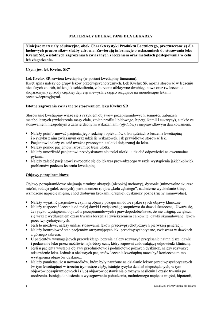 MATERIAŁY EDUKACYJNE DLA LEKARZY Niniejsze materiały edukacyjne, obok Charakterystyki Produktu Leczniczego, przeznaczone są dla fachowych pracowników służby zdrowia. Zawierają informacje o wskazaniach do stosowania leku Kvelux SR, o istotnych zagrożeniach związanych z leczeniem oraz metodach postępowania w celu ich złagodzenia. Czym jest lek Kvelux SR? Lek Kvelux SR zawiera kwetiapinę (w postaci kwetiapiny fumaranu). Kwetiapina należy do grupy leków przeciwpsychotycznych. Lek Kvelux SR można stosować w leczeniu niektórych chorób, takich jak schizofrenia, zaburzenie afektywne dwubiegunowe oraz (w leczeniu skojarzonym) epizody ciężkiej depresji niewystarczająco reagujące na monoterapię lekami przeciwdepresyjnymi. Istotne zagrożenia związane ze stosowaniem leku Kvelux SR Stosowanie kwetiapiny wiąże się z ryzykiem objawów pozapiramidowych, senności, zaburzeń metabolicznych (zwiększenia masy ciała, zmian profilu lipidowego, hiperglikemii i cukrzycy), a także ze stosowaniem niezgodnym z zatwierdzonymi wskazaniami (off-label) i nieprawidłowym dawkowaniem. Należy poinformować pacjenta, jego rodzinę i opiekunów o korzyściach z leczenia kwetiapiną i o ryzyku z nim związanym oraz udzielić wskazówek, jak prawidłowo stosować lek. Pacjentowi należy zalecić uważne przeczytanie ulotki dołączonej do leku. Należy pomóc pacjentowi zrozumieć treść ulotki. Należy umożliwić pacjentowi przedyskutowanie treści ulotki i udzielić odpowiedzi na ewentualne pytania. Należy zalecić pacjentowi zwrócenie się do lekarza prowadzącego w razie wystąpienia jakichkolwiek problemów podczas leczenia kwetiapiną. Objawy pozapiramidowe Objawy pozapiramidowe obejmują terminy: akatyzja (niepokój ruchowy), dystonie (mimowolne skurcze mięśni, rotacja gałek ocznych), parkinsonizm (objaw „koła zębatego”, nadmierne wydzielanie śliny, wzmożone napięcie mięśni, chód drobnymi krokami, drżenie), dyskinezy późne (ruchy mimowolne). Należy wyjaśnić pacjentowi, czym są objawy pozapiramidowe i jakie są ich objawy kliniczne. Należy rozpocząć leczenie od małej dawki i zwiększać ją stopniowo do dawki skutecznej. Uważa się, że ryzyko wystąpienia objawów pozapiramidowych i prawdopodobieństwo, że nie ustąpią, zwiększa się wraz z wydłużeniem czasu trwania leczenia i zwiększeniem całkowitej dawki skumulowanej leków przeciwpsychotycznych. Jeśli to możliwe, należy unikać stosowania leków przeciwpsychotycznych pierwszej generacji. Należy kontrolować stan pacjentów otrzymujących leki przeciwpsychotyczne, zwłaszcza w dawkach z górnego zakresu. U pacjentów wymagających przewlekłego leczenia należy rozważyć przepisanie najmniejszej dawki i podawanie leku przez możliwie najkrótszy czas, który zapewni zadowalającą odpowiedź kliniczną. Jeśli u pacjenta wystąpią objawy przedmiotowe i podmiotowe późnych dyskinez, należy rozważyć odstawienie leku. Jednak u niektórych pacjentów leczenie kwetiapiną może być konieczne mimo wystąpienia objawów dyskinez. Należy pamiętać, że u noworodków, które były narażone na działanie leków przeciwpsychotycznych (w tym kwetiapinę) w trzecim trymestrze ciąży, istnieje ryzyko działań niepożądanych, w tym objawów pozapiramidowych i (lub) objawów odstawienia o różnym nasileniu i czasie trwania po urodzeniu. Istnieją doniesienia o występowaniu pobudzenia, nadmiernego napięcia mięśni, hipotonii, 1 DK/H/2334/RMP/ulotka dla lekarza drżenia, senności, zaburzeń oddechowych lub zaburzeń ssania. Dlatego stan noworodków należy uważnie kontrolować. Senność Leczenie kwetiapiną wiąże się z występowaniem senności i uspokojenia. Senność jest częstym działaniem niepożądanym zgłaszanym przez pacjentów, zwykle w ciągu 3-dniowego początkowego okresu zwiększania dawki. W badaniach klinicznych dotyczących leczenia pacjentów z depresją w przebiegu zaburzenia afektywnego dwubiegunowego i ciężkiego zaburzenia depresyjnego senność o nasileniu głównie lekkim do umiarkowanego występowała zwykle w ciągu pierwszych 3 dni leczenia. Wyjaśnieniem senności może być oddziaływanie z receptorami histaminowymi H1. Należy uprzedzić pacjentów o ryzyku senności lub uspokojenia (które mogą spowodować upadki, zwłaszcza osób w podeszłym wieku), szczególnie w okresie początkowego zwiększania dawki. Pacjenci powinni zachować ostrożność podczas wykonywania czynności wymagających uwagi, takich jak prowadzenie pojazdów mechanicznych (w tym samochodów) lub obsługiwania maszyn, do czasu upewnienia się, że kwetiapina nie działa niekorzystnie na ich organizm. Zwiększenie masy ciała, zmiany lipidowe, hiperglikemia i cukrzyca U osób ze schizofrenią lub zaburzeniem afektywnym dwubiegunowym prawdopodobieństwo przedwczesnego zgonu z przyczyn naturalnych (głównie choroby sercowo-naczyniowej) jest większe niż u osób bez zaburzeń psychicznych. Wydaje się, że schizofrenia wiąże się również z możliwymi lub niemożliwymi do modyfikacji czynnikami ryzyka zachorowalności i śmiertelności sercowo-naczyniowej (takimi jak palenie tytoniu, nieodpowiednia dieta, siedzący tryb życia i choroba układu krążenia w wywiadzie rodzinnym). U osób leczonych kwetiapiną odnotowano zwiększenie masy ciała. W celu uzyskania długotrwałej poprawy zdrowia psychicznego podczas stosowania atypowych leków przeciwpsychotycznych konieczne jest podjęcie następujących działań: wczesne rozpoznanie czynników ryzyka, które można zmodyfikować monitorowanie dalszego rozwoju metabolicznych działań niepożądanych odpowiednie postępowanie w przypadku metabolicznych działań niepożądanych Należy oceniać, kontrolować i leczyć stan fizyczny wszystkich pacjentów zgodnie z odpowiednimi wytycznymi klinicznymi. Wytyczne brytyjskiego instytutu NICE (National Institute for Health and Care Excellence) Lekarz zajmujący się leczeniem chorób psychicz