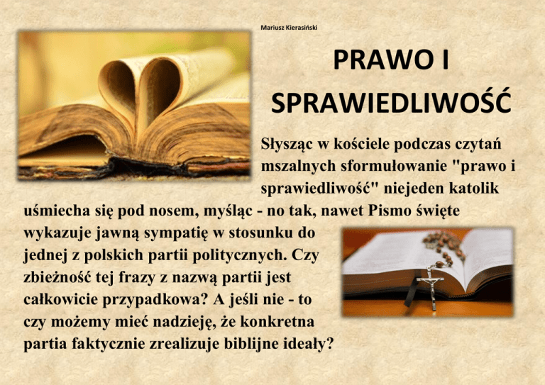 Mariusz Kierasiński PRAWO I SPRAWIEDLIWOŚĆ Słysząc w kościele podczas czytań mszalnych sformułowanie "prawo i sprawiedliwość" niejeden katolik uśmiecha się pod nosem, myśląc - no tak, nawet Pismo święte wykazuje jawną sympatię w stosunku do jednej z polskich partii politycznych. Czy zbieżność tej frazy z nazwą partii jest całkowicie przypadkowa? A jeśli nie - to czy możemy mieć nadzieję, że konkretna partia faktycznie zrealizuje biblijne ideały? Fraza „Prawo i Sprawiedliwość” dość często występuje na kartach Pisma Świętego. W psalmie 33 czytamy o Bogu, że „On miłuje prawo i sprawiedliwość; ziemia jest pełna łaskawości Pana”(por. Ps 33,5). Paralelnie czytamy o Bogu w psalmie 11, że jest On sprawiedliwy i miłuje sprawiedliwość, dlatego ludzie prawi zobaczą Jego oblicze, oblicze sprawiedliwości. (zob. Ps 11,7). Jakby było mało tego, psalm 37 mówi o tym, że Bóg miłuje sprawiedliwość , a swoich świętych (sprawiedliwych) nie opuszcza, w przeciwieństwie do ludzi nikczemnych. Wręcz nikczemni wyginą, a potomstwo występnych będzie wytępione (zob. Ps 37,28). Tak ostre słowa mogą mrozić krew w żyłach, szczególnie tym, którzy umiłowali doczesność oraz związany z doczesnością grzech. Natomiast psalm 99 mówi o Bogu, który jest nie tylko potężny, ale który kocha sprawiedliwość. Który prawo i sprawiedliwość ustanowił w Jakubie (Izraelu) (zob. Ps 99,4). Zatem to Bóg jest nie tylko twórcą prawa, ale i sprawiedliwości. Dlatego Bóg gromi pyszałków, a przeklęci są wszyscy ci, którzy odstępują od Jego przykazań(zob. Ps 119,21). Bowiem Jego przykazania są i prawem i sprawiedliwością. Prawo i sprawiedliwość w księdze Jeremiasza to konkretne czyny, jak: uwolnienie uciśnionego z rąk ciemięzcy, czy zakaz uciskania obcego, sieroty, czy wdowy oraz stanowczy zakaz rozlewania niewinnej krwi (zob. Jr 22,3). Tam, gdzie Jeremiasz mówi o królu Jozjaszu wspomina, że „... on wykonywał prawo i sprawiedliwość i dlatego zażywał pomyślności” (por. Jr 22,15). Jeremiasz prorokując o Mesjaszu, także podkreśla, że będzie to mąż, który będzie wykonywał prawo i sprawiedliwość na ziemi (zob. Jr 23,5). W księdze Ezechiela czytamy: „Tak mówi Pan Bóg: Niechże wam to wystarczy, wy, władcy Izraela! Połóżcie kres gwałtowi i uciskowi, a wypełniajcie prawo i sprawiedliwość! Zaprzestańcie obdzierania ludu mojego! - wyrocznia Pana Boga”(por. Ez 45,9). Zatem te napomnienia skierowane są do władców, oczywiście nie tylko do władców Izraela. Wypełnianie prawa i sprawiedliwości to przede wszystkim powstrzymanie się każdej władzy od ucisku, współcześnie w domyśle podatkowego, czy administracyjnego. To kres wszelkim gwałtom, także, a może przede wszystkim gwałtom, które obecnie nazywamy aferami politycznymi, czy gospodarczymi, a także obyczajowymi. Zatem współcześni władcy, którzy mieliby wypełniać prawo i sprawiedliwość winny być ludźmi prawymi, na wysokim poziomie moralnym. Dla których podstawowe i fundamentalne wartości są niezbywalne. Niewątpliwie takie wartości, to szacunek dla prawdy o naszej ludzkiej kondycji, między innymi i takiej, że życie ludzkie winno być chronione od poczęcia, aż po naturalną śmierć, czy wszelkiego rodzaju nieformalne, a także tej samej płci związki międzyludzkie są dewiacyjne. Reasumując ten wątek, trzeba stwierdzić, że tylko ludzie prawi mogą zagwarantować prawo i sprawiedliwość w społeczeństwie i w państwie. Zatem wybór ludzi do władzy państwowej pozbawionych moralności, inaczej mówiąc prawości będzie skutkował uciskiem społecznym, tak w wymiarze duchowym (prawna możliwość aborcji, eutanazji, In vitro, legalizacja par homoseksualnych, antykoncepcji oraz w edukacji wpajanie fałszywych informacji, choćby związanych z gender itp.), jak w wymiarze fizycznym (nadmierny fiskalizm, połączony z licznymi aferami gospodarczymi, które zubożają i osłabiają całe narody). W Polsce zaistniał pewnego rodzaju fenomen. Bo oto jedna z partii politycznych nazwała się Prawo i Sprawiedliwość. Już samą nazwą wyróżnia się od innych, aczkolwiek taka nazwa niezwykle zobowiązuje, choćby i do tego, aby działający w niej ludzie byli prawi. Osoba, która taką nazwę tej partii wymyśliła, albo jej nadała, najprawdopodobniej kierowała się powyższymi znaczeniami i Biblijnym jej pochodzeniem. Jest to swego rodzaju fenomen, tym bardziej w świecie współczesnej polityki, aby polityczna partia już w swojej nazwie nawiązywała do istoty sprawowania władzy. Być może i z tego powodu ludzie prawi, szukający prawości i tęskniący za sprawiedliwością, w jakiejś mierze pokładają nadzieje, że Prawo i Sprawiedliwość za pomocą prawych ludzi będzie sprawowała władzę sprawiedliwie przy poszanowaniu niezbywalnych praw jednostki ludzkiej i przy poszanowaniu wartości, na których została zbudowana nasza chrześcijańska cywilizacja. Źródlo . opoka.pl