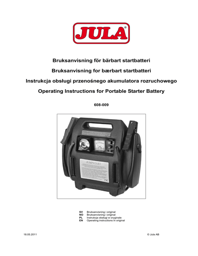 Bruksanvisning för bärbart startbatteri Bruksanvisning for bærbart startbatteri Instrukcja obsługi przenośnego akumulatora rozruchowego Operating Instructions for Portable Starter Battery 608-009 SV NO PL EN 18.05.2011 Bruksanvisning i original Bruksanvisning i original Instrukcja obsługi w oryginale Operating instructions in original © Jula AB SVENSKA SVENSKA SÄKERHETSANVISNINGAR Läs bruksanvisningen noggrant innan användning! Läs denna bruksanvisning noga innan apparaten används. Ha denna manual alltid till hands och läs den alltid innan apparaten används. Använd aldrig apparaten om den är skadad. Reparationer skall utföras av leverantören. Annars kan livsfarliga skador uppstå. Apparaten får aldrig kortslutas. Polerna får ej beröras med ledande material, utom vid avsedd användning. Observera noggrant hur polerna skall kopplas in. Risk för brännskador, brand och allvarliga personskador. Använd aldrig apparaten i omgivningar med explosionsrisk eller eldfara. Då apparaten skall skrotas, lämna in den till återvinning. Innehåller batterier. Förvara apparaten i högst 50 grader C. Om apparaten läcker vätska, tvätta omedelbart huden med tvål och vatten. Neutralisera därefter med en mild syra såsom apelsinjuice eller vinäger. Om batterivätskan kommer i ögonen, skölj rikligt med vatten och uppsök omedelbart läkare. Tag aldrig isär apparaten. Ladda apparaten endast via medlevererad kabel i cigarettändaruttaget. Laddning får endast ske från 12 V system eller från bifogad adapter. Adaptern får aldrig tas isär eller repareras. TEKNISKA DATA Märkspänning Ström Laddning Kompressor 12 VDC 400 A Från cigarettändaruttag, 12 V Drift max 10 min. Därefter vila i minst 10 min. BESKRIVNING Hjälpstarten är avsedd att ge tillfälligt krafttillskott till 12-voltssystem vid låg batterispänning. T.ex. start av båtmotorer, bilmotorer, traktorer, elverk etc. Den är även avsedd för tillfällig strömförsörjning av 12 V elförbrukare. 1. 2. 3. 4. 5. 6. 7. 12-voltsuttag med överbelastningsskydd Batterimätare Anslutningsklämma Strömbrytare Anslutningsklämma Kåpa 220 V laddadapter 8. 9. 10. 11. A. B. C. 2 DC-kabel Belysningsströmbrytare Lampa Laddindikator och laddanslutning Manometer Strömbrytare, kompressor Slang och lucka för slangutrymmet SVENSKA HANDHAVANDE Laddning Innan hjälpstarten kan användas skall den först laddas. Ladda hjälpstarten genom att ansluta den till cigarettändaruttaget i bilen eller anslut till 220 VAC med hjälp av bifogad adapter. Se beskrivningen. Under tiden laddningen pågår lyser laddindikatorn (11). Koppla bort laddningen då batterimätaren visar 14-15 V. Laddtiden efter att hjälpstartaren har använts framgå av nedanstående tabell. Antal hjälpstarter 1 2 3 4 5 6 Laddtid i timmar (ung.) 8 16 24 32 40 48 Att strömförsörja apparat Hjälpstartaren kan användas till att leverera ström till kylskåp, belysning, radio, fläktar och andra 12 Vförbrukare. Koppla in aktuell apparat enligt följande: 12. Lyft locket till uttaget (1). 13. Montera cigarettändarpluggen som är kopplad till strömförbrukaren. Inkoppling till annat batteri Stäng av alla strömförbrukare på fordonet/motorn som skall startas. VARNING! Observera noggrannt hur polerna skall kopplas in. Risk för brännskador, brand och allvarliga personskador om nedanstående instruktioner ej följs. Polerna får ej beröras med ledande material, utom vid avsedd användning. Koppla därefter in hjälpstaren enligt följande: 1. Anslut den röda kabelklämman till batteriets pluspol (+). 2. Anslut därefter den svarta kabelklämman till batteriets minuspol (-). 3. Starta motorn på vanligt sätt. 4. Nytt startförsök får göras efter minst 3 minuter. 5. Då motorn startat, koppla först bort den svarta kabelklämman. 6. Koppla därefter bort den röda. Kompressor Kompressorn får arbeta i max 10 minuter. Därefter skall den vila i minst 10 minuter före nästa användning. Kompressorn kan användas till att pumpa bildäck, fotbollar etc. För att pumpa fotbollar, använd lämpligt bifogat munstycke. Slangadaptern är permanent monterad i slangen. Koppla in kompressorn enligt följande: 1. Montera slangadaptern på objektet. 2. Avläs trycket på manometern (A). 3. Starta kompressorn med strömbrytaren (B). 4. Stäng av kompressorn och koppla bort slangen då pumpningen är klar. UNDERHÅLL Batteri Batteriet laddas enligt tidigare instruktioner. Då batteriet eller hela apparaten skall skrotas skall den lämnas för återvinning enligt respektive kommuns anvisningar. Rengöring Apparaten får ej rengöras med vatten eller andra vätskor. Rengör apparaten med en lätt fuktad trasa ed. 3 SVENSKA Med reservation för tryckfel och konstruktionsändringar som vi ej kan råda över. Vid eventuella problem, kontakta vår serviceavdelning på telefon: 0200-88 55 88. Jula AB, Box 363, 532 24 SKARA www.jula.se 4 NORSK NORSK SIKKERHETSANVISNINGER Les bruksanvisningen nøye før bruk! Les bruksanvisningen nøye før du tar apparatet i bruk. Ha alltid bruksanvisningen tilgjengelig og les den alltid før du bruker apparatet. Ikke bruk apparatet hvis det er skadet. Reparasjoner skal utføres av leverandøren. Hvis ikke kan det oppstå livsfarlige skader. Apparatet må ikke kortsluttes. Polene må ikke berøres med ledende materiale, unntatt hvis dette gjøres med hensikt. Legg nøye merke til hvordan polene skal tilkobles. Fare for brannskader, brann og alvorlige personskader. Ikke bruk apparatet i omgivelser der det er eksplosjons- eller brannfare. Lever apparatet til gjenvinning når det skal avhendes. Inneholder batterier. Apparatet bør oppbevares ved maks 50°C. Hvis apparatet lekker væske, må du umiddelbart vaske huden med såpe og vann. Nøytraliser deretter med en mild syre som appelsinjuice eller eddik. Hvis du får batterivæske i øynene, bør du skylle med rikelig med vann og oppsøke lege umiddelbart. Ikke demonter apparatet. Apparatet må kun la