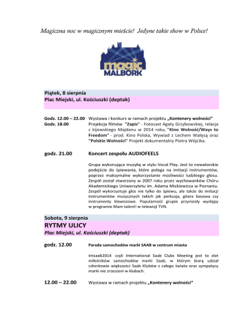 Magiczna noc w magicznym mieście! Jedyne takie show w Polsce! 8 – 9 sierpnia 2014r. Piątek, 8 sierpnia Plac Miejski, ul. Kościuszki (deptak) Godz. 12.00 – 22.00 Wystawa i konkurs w ramach projektu „Kontenery wolności” Godz. 18.00 Projekcja filmów "Zapis" - Fotocast Agaty Grzybowskiej, relacja z kijowskiego Majdanu w 2014 roku, "Kino Wolność/Ways to Freedom" - prod. Kino Polska, Wywiad z Lechem Wałęsą oraz "Polskie Wolności" Projekt dokumentalny Piotra Wójcika. godz. 21.00 Koncert zespołu AUDIOFEELS Grupa wykonująca muzykę w stylu Vocal Play. Jest to nowatorskie podejście do śpiewania, które polega na imitacji instrumentów, poprzez maksymalne wykorzystanie możliwości ludzkiego głosu. Zespół został stworzony w 2007 roku przez wychowanków Chóru Akademickiego Uniwersytetu im. Adama Mickiewicza w Poznaniu. Zespół wykorzystuje głos nie tylko do śpiewu, ale także do imitacji instrumentów muzycznych takich jak perkusja, gitara basowa czy instrumenty klawiszowe. Popularność grupie przyniosły występy w programie Mam talent! w telewizji TVN. Sobota, 9 sierpnia RYTMY ULICY Plac Miejski, ul. Kościuszki (deptak) godz. 12.00 Parada samochodów marki SAAB w centrum miasta Intsaab2014 czyli International Saab Clubs Meeting jest to zlot miłośników samochodów marki Saab, w którym biorą udział członkowie większości Saab Klubów z całego świata oraz sympatycy marki nie zrzeszeni w klubach. 12.00 – 22.00 Wystawa w ramach projektu „Kontenery wolności” „Kontenery Wolności” - Inicjatywa Razem 89' zaprasza na obchody 25 rocznicy wolnych wyborów 1989r. Z tej okazji „Kontenery Wolności” odwiedzą 25 miast, w tym Malbork, wydarzeniu patronuje Prezydent Bronisław Komorowski. Kontener Wolności to mobilne studio, czyli miejsce spotkań w którym będą rejestrowane wypowiedzi mieszkańców miasta związane z ich postrzeganiem wolności, odbędzie się tam debata młodzieży, kino plenerowe, gry i zabawy dla dzieci. 17.00 – 21.00 Kolorowa parada artystów (spod zamku do centrum miasta) z udziałem zespołu Cocodjembé Show bębniarskie na scenie w wykonaniu Cocodjembé Wszyscy muzycy są mocno związani z Trójmiastem, łączą afrykańską tradycję ze słowiańskim temperamentem. Tradycyjne instrumentarium Afryki Zachodniej i rytmy z tamtych rejonów połączone z energetyczną aranżacją porywają do tańca. W skład zespołu wchodzą 3 bębny basowe: dununba, sangban, kenkeni oraz 3 djembe. Interaktywny (uliczny i na scenie) teatrzyk dla dzieci „Zielonomu i Czarnoksiężnik” - Teatr „Ja Się” z Gdańska Magiczna podróż z Marcinem Muszyńskim - pokazy iluzji „Zegar zaczyna odmierzać czas a rzeczywistość zmienia swój wymiar... za chwilę, przeniesiesz się ponad przeciętność, wyjdziesz poza granice rozumu. Zobaczysz rzeczy niezrozumiałe dla ludzkiego oka i umysłu. Zapraszamy więc do świata Magii, który przeniesie Cię, do niezwykłych tajemnic, niezwykłej rzeczywistości.. Stoisko modelowania balonów - baloniarski kącik dla dzieci Stoisko dla dzieci - malowanie twarzy Animacje uliczne, szczudlarze Stoiska sponsorskie z atrakcjami: (Orlen – Mobilne Stop Cafe, Polski Cukier, Radio ESKA, Helen Doron English) godz. 22.00 WIDOWISKO „MAGIC MALBORK” Widownia na wałach von Plauena – ul. Parkowa „Magiczny Sen Mnicha” to opowieść z pogranicza fantasy, o człowieku, który ciężko doświadczony przez los, ze złoczyńcy staje się pobożnym mnichem. Z pewnością nie będzie to jednak tylko liryczna historia, gdyż w widowisku bierze udział plejada gwiazd znanych z finałów programu Mam Talent. W specjalnej scenerii wystąpi również Tetiana Galitsyna – zwyciężczyni programu „Mam Talent” z Ukrainy, która będzie tworzyć z piasku obrazy powiązane z historią widowiska na dużym horyzontalnym ekranie, na którym również zobaczymy interakcję multimedialną z tancerzami. Przeniosą one widza w odrealniony baśniowy świat. Będą tańce z chorągwiami, przepiękna scena balu z udziałem iluzjonisty Marcina Muszyńskiego z lewitującym w powietrzu fortepianem, malowanie światłem w wykonaniu Trio Multivisual, efekty pirotechniczne, taniec z ogniem, tańce akrobatyczne na żyrandolu, szarfach i obręczach, innych jednak niż w ubiegłym roku, w wykonaniu Akrobatycznego Teatru Tańca MIRA – ART. Całość tradycyjnie zwieńczy pokaz sztucznych ogni. W widowisku wystąpią: Тetiana Galitsyna - W 2013 roku została zwyciężczynią szóstej edycji programu TVN "Mam Talent". 28-letnia аrtystka pochodząca z Ukrainy, malarka, kierowniczka studia artystycznego. Od 5 lat zajmuje się piaskowymi animacjami. Jej występy fascynują widzów od pierwszego spojrzenia. Тetiana za pomocą piasku opowiada publiczności niesamowite historie, które wywołują mimowolny uśmiech lub sprawiają, że odczuwa się głębię smutku. Jej zawsze wspaniałe występy fascynują, ujawniając istotę i piękno życia. Marcin Muszyński – aktor, iluzjonista, finalista programu TVN „Mam Talent”. Marcin iluzją interesował się od najmłodszych lat. Rozpoczął naukę w Paryżu i tam przez wiele lat szlifował i zgłębiał tajniki aktorstwa i najbardziej tajemniczego zawodu na świecie. Jego sztandarowym numerem jest lewitacja asystentki - w ubiegłym roku wykonał tę sztukę z Dodą! Bierze udział w kongresach iluzjonistycznych w kraju i za granicą. W swoim repertuarze Marcin stworzył własne autorskie Magiczne Etiudy z najtrudniejszych na świecie projektów Dużej Iluzji - rozmaite magiczne pojawienia asystentek, różnorodne magiczne metamorfozy jak również magiczne zmiany sukienek czy lewitacje mebli. W 2011r. Marcin pojawił się w programie Mam Talent, gdzie jako pierwszy Iluzjonista w Polsce dotarł do finału, do ścisłej czwórki najbardziej utalentowanych ludzi w Polsce. W 2013 roku wraz z żoną Eweliną występują już jako gwiazdy w programie na żywo "Mam Talent" z niezwykłą premierą te