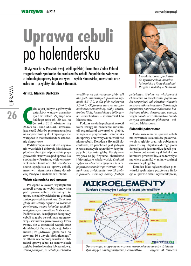 warzywa 4/2013 [email protected] Uprawa cebuli po holendersku UPRAWA 10 stycznia br. w Prusimiu (woj. wielkopolskie) firma Bejo Zaden Poland zorganizowała spotkanie dla producentów cebuli. Zagadnienia związane z technologią uprawy tego warzywa – wybór stanowiska, nawożenie oraz ochrona – przybliżył doradca z Holandii. 26 dr inż. Marcin Bartczak C ebula jest jednym z głównych gatunków warzyw uprawianych w Polsce. Zajmuje ona każdego roku ok. 30 tys. ha (w roku 2011 obsiano nią 26 629 ha – dane GUS-u). Przeważająca część zbiorów przeznaczona jest na zaopatrzenie rynku krajowego, ale warzywo to ma również duże znaczenie eksportowe. Podstawowym warunkiem uzyskania wysokich i dobrych jakościowo plonów cebuli jest odpowiednie przygotowanie stanowiska pod uprawę. Na spotkaniu w Prusimiu, wiele wskazówek na ten temat udzielił Leo Mabesoone, specjalista ds. uprawy cebuli, marchwi i ziemniaka z firmy doradczej Profyto z siedzibą w Holandii. wrażliwa na zakwaszenie gleb; pH dla gleb mineralnych powinno wynosić 6,5–7,0, a dla gleb torfowych 5,5–6,5. Objawami uprawy na glebach zakwaszonych są: słaby wzrost, drobne liście, jasnozielone z żółknącymi wierzchołkami – informował Leo Mabesoone. Podczas wykładu prelegent zwrócił także uwagę na znaczenie substancji organicznej zawartej w glebie, w aspekcie przydatności stanowiska do uprawy oraz wpływu na wielkość plonu cebuli. Doradca z Holandii akcentował, że próchnica jest jednym z podstawowych czynników decydujących o żyzności gleby. Pozytywnie wpływa na jej fizyczne, chemiczne i biologiczne właściwości. Dodatni wpływ na właściwości fizyczne to m.in. poprawa stosunków powietrzno-wodnych oraz zwiększenie termiki gleby z powodu ciemnej barwy frakcji Leo Mabesoone, specjalista ds. uprawy cebuli, marchwi i ziemniaka z firmy doradczej Profyto z siedzibą w Holandii. próchnicy. Wpływ na właściwości chemiczne to zwiększenie pojemności sorpcyjnej, jak również wiązanie makro- i mikroelementów. Substancja organiczna poprawia właściwości biologiczne gleby, dostarczając energii, węgla i azotu oraz składników budulcowych organizmom glebowym – mówił Leo Mabesoone. Składniki pokarmowe Duże znaczenie w uprawie cebuli ma zawartość składników pokarmowych w glebie oraz ich pobieranie przez rośliny. Uzyskanie dużego plonu dobrej jakość jest możliwe jeżeli prawidłowo pobieranie są składniki pokarmowe przez rośliny, a na to wpływ ma wiele czynników, m.in. wcześniej omawiane pH gleby. Doradca jako najważniejsze pierwiastki spełniające pozytywne funkcje w uprawie cebuli wymienił: potas, Wybór stanowiska pod uprawę Prelegent w swoim wystąpieniu zwrócił uwagę na wybór stanowiska pod uprawę cebuli. Zaznaczył, że upraw nie należy zakładać na glebach z nieodpowiednią strukturą. Struktura gleby ma istotny wpływ na warunki powietrzne, wodne i cieplne, czyli klimat glebowy – mówił Leo Mabesoone. Podkreślał on, że najlepsze do uprawy cebuli są gleby o strukturze agregatowej – zwłaszcza gruzełkowatej, która tworzy się w obecności wapnia oraz działalności fauny glebowej. Informował, że „zdrowa” gleba na 1 ha zawiera 10 t „życia biologicznego” w 20-cm wierzchniej warstwie. Odradzał uprawę cebuli na stanowiskach z glebą bardzo kwaśną lub zasadową. Warto pamiętać, że cebula jest bardzo Opracowując programy nawozowe, warto mieć na uwadze działanie stymulujące i antagonistyczne pierwiastków. Zdjęcia: M. Bartczak 4/2013 [email protected] azot i fosfor. Według jego doświadczeń prowadzonych w Holandii, do wytworzenia 60 t/ha cebuli rośliny pobierają 140 kg N, 60 kg P oraz 145 kg K, czyli w przeliczeniu na 1 tonę produktu przypada: 2,3 kg N, 1,0 kg P oraz 2,4 K. Specjalista ds. uprawy cebuli uwypuklił znaczenie potasu w produkcji tego warzywa. O jego znaczeniu świadczy fakt, że znajduje się go dużo w tych organach i tkankach, w których najintensywniej przebiegają procesy przemiany materii i wzrostu, np. w stożkach wzrostu. Zaakcentował wpływ potasu na gospodarkę wodną. Warto pamiętać, że przy odpowiednim odżywieniu roślin potasem zwiększa się siła ssąca komórek liści. Dzięki temu woda jest lepiej utrzymywana przez komórki, co w efekcie powoduje zmniejszenie transpiracji oraz lepsze wykorzystanie wody glebowej przez rośliny. Natomiast niedobór potasu powoduje znaczne obniżenie plonu. W przywołanym holenderskim przykładzie stosowania nawozów potasowych przewidziana na sezon dawka (350 kg) podzielona była na 2 części: 200 kg – przedsiewnie, 150 kg – 8. tydzień po wschodach roślin. W warunkach klimatyczno-glebowych Polski zaleca się wysiew nawozów potasowych przed założeniem uprawy. Według doświadczeń prowadzonych w Holandii, do wytworzenia 60 t/ha cebuli rośliny pobierają 140 kg N, 60 kg P oraz 145 kg K. Za ważne składniki dla cebuli Holender uznał również mangan, magnez oraz siarkę. Pierwiastek wymieniony jako ostatni jest niezbędnym składnikiem dla prawidłowego rozwoju i uzyskania wysokich i dobrej jakości plonów cebuli. Rośliny siarkolubne pobierają przeciętnie ze średnim plonem ponad 40 kg siarki z hektara. W przypadku cebuli pobranie tego składnika może wynosić nawet 100 kg/ha. Nie mniej jednak nawożenie siarką cebuli nie zawsze jest nieodzowne. Stosowanie nawozów z siarką jest uzasadnione w przypad- ku stwierdzenia znacznego niedoboru tego składnika w glebie, potwierdzonego aktualną analizą chemiczną gleby. Mineralne nawożenie siarką jest także zalecane w przypadku, gdy w płodozmianie przeważają rośliny wykazujące duże zapotrzebowanie na siarkę, np. rzepak, czy warzywa kapustne. Zwalczanie chwastów W dalszej części swojego wystąpienia Leo Mabesoone skupił się na zwalczaniu chwastów na plantacji cebuli. Przedstawił program walki z chwastami uwzględniający herbicydy po- warzywa lecane do stosowania w Holandii. Niestety 