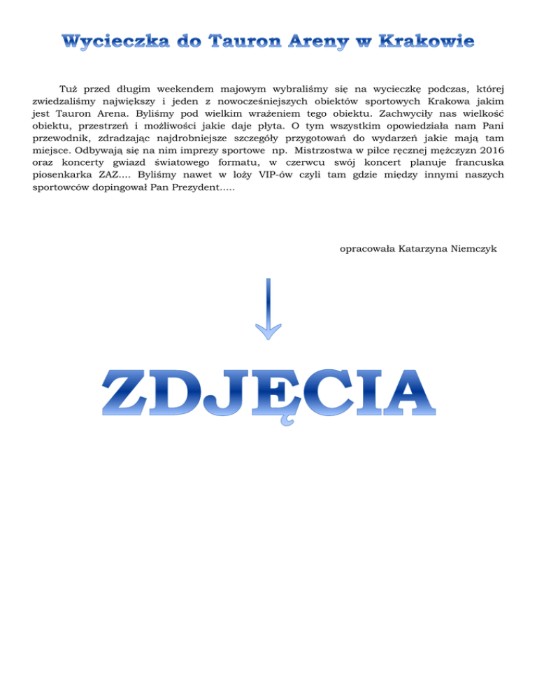 Tuż przed długim weekendem majowym wybraliśmy się na wycieczkę podczas, której zwiedzaliśmy największy i jeden z nowocześniejszych obiektów sportowych Krakowa jakim jest Tauron Arena. Byliśmy pod wielkim wrażeniem tego obiektu. Zachwyciły nas wielkość obiektu, przestrzeń i możliwości jakie daje płyta. O tym wszystkim opowiedziała nam Pani przewodnik, zdradzając najdrobniejsze szczegóły przygotowań do wydarzeń jakie mają tam miejsce. Odbywają się na nim imprezy sportowe np. Mistrzostwa w piłce ręcznej mężczyzn 2016 oraz koncerty gwiazd światowego formatu, w czerwcu swój koncert planuje francuska piosenkarka ZAZ.... Byliśmy nawet w loży VIP-ów czyli tam gdzie między innymi naszych sportowców dopingował Pan Prezydent..... opracowała Katarzyna Niemczyk