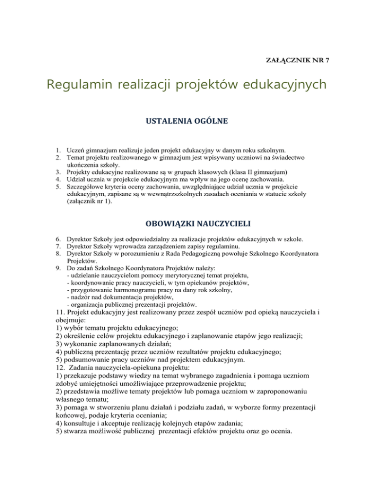 ZAŁĄCZNIK NR 7 Regulamin realizacji projektów edukacyjnych USTALENIA OGÓLNE 1. Uczeń gimnazjum realizuje jeden projekt edukacyjny w danym roku szkolnym. 2. Temat projektu realizowanego w gimnazjum jest wpisywany uczniowi na świadectwo ukończenia szkoły. 3. Projekty edukacyjne realizowane są w grupach klasowych (klasa II gimnazjum) 4. Udział ucznia w projekcie edukacyjnym ma wpływ na jego ocenę zachowania. 5. Szczegółowe kryteria oceny zachowania, uwzględniające udział ucznia w projekcie edukacyjnym, zapisane są w wewnątrzszkolnych zasadach oceniania w statucie szkoły (załącznik nr 1). OBOWIĄZKI NAUCZYCIELI 6. Dyrektor Szkoły jest odpowiedzialny za realizacje projektów edukacyjnych w szkole. 7. Dyrektor Szkoły wprowadza zarządzeniem zapisy regulaminu. 8. Dyrektor Szkoły w porozumieniu z Rada Pedagogiczną powołuje Szkolnego Koordynatora Projektów. 9. Do zadań Szkolnego Koordynatora Projektów należy: - udzielanie nauczycielom pomocy merytorycznej temat projektu, - koordynowanie pracy nauczycieli, w tym opiekunów projektów, - przygotowanie harmonogramu pracy na dany rok szkolny, - nadzór nad dokumentacja projektów, - organizacja publicznej prezentacji projektów. 11. Projekt edukacyjny jest realizowany przez zespół uczniów pod opieką nauczyciela i obejmuje: 1) wybór tematu projektu edukacyjnego; 2) określenie celów projektu edukacyjnego i zaplanowanie etapów jego realizacji; 3) wykonanie zaplanowanych działań; 4) publiczną prezentację przez uczniów rezultatów projektu edukacyjnego; 5) podsumowanie pracy uczniów nad projektem edukacyjnym. 12. Zadania nauczyciela-opiekuna projektu: 1) przekazuje podstawy wiedzy na temat wybranego zagadnienia i pomaga uczniom zdobyć umiejętności umożliwiające przeprowadzenie projektu; 2) przedstawia możliwe tematy projektów lub pomaga uczniom w zaproponowaniu własnego tematu; 3) pomaga w stworzeniu planu działań i podziału zadań, w wyborze formy prezentacji końcowej, podaje kryteria oceniania; 4) konsultuje i akceptuje realizację kolejnych etapów zadania; 5) stwarza możliwość publicznej prezentacji efektów projektu oraz go ocenia. 13. Realizując projekt, uczeń: 1) zdobywa wiedzę i umiejętności związane z przedmiotem projektu; 2) wybiera zagadnienie: problem lub działanie, zgodnie ze swoimi zainteresowaniami i założonymi celami projektu; 3) poszukuje sposobów zbadania i rozwiązania problemu oraz skutecznego przeprowadzenia założonego w projekcie działania; 4) organizuje własną pracę i współpracuje z innymi realizatorami projektu; 5) wytrwale i w przemyślany sposób dąży do realizacji zamierzonego celu; 6) przygotowuje i przeprowadza publiczną prezentację efektów projektu (np. na forum klasy, szkoły, gminy). 14. Zakres projektu edukacyjnego może dotyczyć wybranych treści nauczania określonych w podstawie programowej kształcenia ogólnego dla gimnazjów lub wykraczać poza te treści. 15. Dyrektor gimnazjum, po zasięgnięciu opinii Rady Pedagogicznej, ustala: 1) zadania nauczyciela, o którym mowa w pkt 12; 2) czas realizacji projektu edukacyjnego; 3) termin oraz sposób prezentacji przez uczniów rezultatów projektu edukacyjnego; 4) sposób podsumowania pracy uczniów nad projektem edukacyjnym; 5) inne elementy istotne dla prawidłowej realizacji projektu edukacyjnego. 16. Wychowawca oddziału na początku roku szkolnego, w którym uczniowie rozpoczną realizację projektu edukacyjnego, informuje uczniów i ich rodziców o warunkach realizacji projektu. DZIAŁANIA PROJEKTOWE Wybór tematu projektu: I. Na początku roku szkolnego, w którym będzie realizowany projekt edukacyjny, nauczyciele wspólnie ustalają zestaw projektów edukacyjnych do realizacji w danym roku. Projekty mogą być realizowane prze jednego nauczyciela międzyoddziałowo, bądź przez kilku nauczycieli miedzy przedmiotowo. Uczniowie dokonują wyboru tematu projektu, który będą realizować w danym roku szkolnym w terminie do końca września. Określenie celów projektu i zaplanowanie etapów jego realizacji II. Opiekunowie projektów omawiają z uczniami: scenariusz projektu, harmonogram działań, wspomagają podział zadań w grupie, przygotowują kontrakt, omawiają wzory dokumentów i kryteria oceniania projektu i jego prezentacji. Opiekunowie projektów i nauczyciele pracujący z uczniami wyznaczają miejsce i terminy konsultacji. Opiekunowie projektów i nauczyciele pracujący z uczniami przygotowują kartę projektu. Wykonania zaplanowanych działań III. Uczniowie pod opieka nauczycieli pracują nad realizacja projektu do końca maja danego roku szkolnego Szkolny opiekun projektu wraz z innymi nauczycielami do końca maja przygotowuje program i uzgadnia formę prezentacji poszczególnych projektów IV. Uczniowie dokonują samooceny projektu Opiekun dokonuje oceny projektu. Publiczne przedstawianie rezultatów projektu Projekty edukacyjne są prezentowane podczas: o Apeli szkolnych o Uroczystości szkolnych o Innych uzgodnionych z dyrektorem działań Po prezentacji projektu dokonuje się jego oceny. Uczniowie wraz z nauczycielami dokonują ewaluacji swojej pracy. Do końca roku szkolnego uczniowie przygotowują sprawozdania z realizacji projektów, które powinny być umieszczane na stronie internetowej szkoły. Dokumentacja dotycząca projektu to: Karty samooceny ucznia, Karta projektu, Karta oceny projektu, Karta oceny prezentacji projektu USTALENIA KOŃCOWE 1. Informację o udziale ucznia w realizacji projektu edukacyjnego oraz temat projektu edukacyjnego wpisuje się na świadectwie ukończenia gimnazjum. 2. Dyrektor Szkoły decyduje o zwolnieniu ucznia z realizacji projektu edukacyjnego w uzasadnionych przypadkach na wniosek rodziców. 3. W przypadku zwolnienia ucznia z realizacji projektu edukacyjnego na świadectwie ukończenia gimnazjum w miejscu przeznaczonym na wpisanie informacji o udziale ucznia w realizacji projektu wpisuje się „zwolniony” albo „zwolniona”