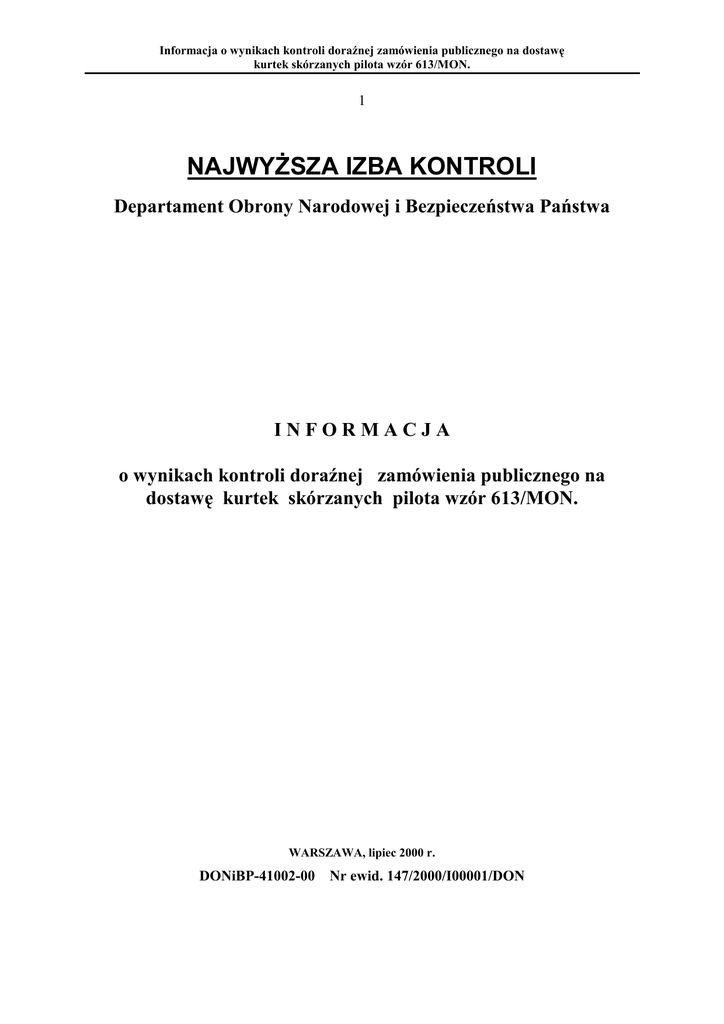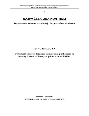 Informacja o wynikach kontroli doraźnej zamówienia publicznego na dostawę kurtek skórzanych pilota wzór 613/MON. 1 NAJWYŻSZA IZBA KONTROLI Departament Obrony Narodowej i Bezpieczeństwa Państwa INFORMACJA o wynikach kontroli doraźnej zamówienia publicznego na dostawę kurtek skórzanych pilota wzór 613/MON. WARSZAWA, lipiec 2000 r. DONiBP-41002-00 Nr ewid. 147/2000/I00001/DON Informacja o wynikach kontroli doraźnej zamówienia publicznego na dostawę kurtek skórzanych pilota wzór 613/MON. 2 SPIS TREŚCI Str. I. CZĘŚĆ OGÓLNA................................................................................................ 3 1. Charakterystyka kontroli.................................................................................. 3 2. Synteza ustaleń kontroli i ocena kontrolowanej działalności......................... 3. Uwagi i wnioski................................................................................................... 5 10 II. CZĘŚĆ SZCZEGÓŁOWA................................................................................ 12 1. Charakterystyka stanu prawnego....................................................................... 12 2. Istotne ustalenia kontroli..................................................................................... 16 2.1. Wprowadzenie kurtki skórzanej pilota do zestawów należności przedmiotów zaopatrzenia mundurowego................................................... 2.2. Ustalenie wzoru kurtki oraz wyznaczenie jej dostawcy............................. 16 17 2.3 Realizacja prac badawczo-rozwojowych i wdrożeniowych oraz określenie warunków techniczno-technologicznych produkcji kurtek........................ 18 2.4 Realizacja zmówienia na dostawę kurtek skórzanych pilota......................... 22 2.4.1 Negocjacje cenowe z Zakładami Futrzarskimi „Kurów 1” S.A...... 22 2.4.2 Wybór trybu i zasad udzielenia zamówienia publicznego................ 24 2.4.3 Realizacja zamówienia publicznego w trybie z wolnej ręki na zasadach szczególnych ......................................................... 28 2.5. Ocena kurtki pod względem spełnienia warunków techniczno-technlogicznych............................................................................ 2.6. Koszt produkcji a cena jednostkowa kurtki..................................................... 31 32 2.7. Praktyczne możliwości wykorzystania kurtki skórzanej pilota w siłach zbrojnych............................................................................................... III. 37 PRZEBIEG POSTĘPOWANIA KONTROLNEGO I DZIAŁAŃ PODJĘTYCH PO ZAKOŃCZENIU KONTROLI......................................... 39 Informacja o wynikach kontroli doraźnej zamówienia publicznego na dostawę kurtek skórzanych pilota wzór 613/MON. 3 I. CZĘŚĆ OGÓLNA 1. Charakterystyka kontroli. Temat kontroli Najwyższa Izba Kontroli przeprowadziła w II kwartale 2000 r. kontrolę doraźną zamówienia publicznego na dostawę kurtek skórzanych pilota wzór 613/MON. Kontrola została podjęta z inicjatywy własnej NIK i oznaczona numerem I/00/001. Cel i zakres kontroli Celem kontroli było zbadanie i ocena działań resortu obrony narodowej w związku z wprowadzeniem do zestawów ubiorczych personelu latającego kurtki skórzanej pilota wzór 613/MON oraz realizacji zamówienia publicznego na dostawę tych kurtek. Dla osiągnięcia celu kontroli badaniami objęto następujące zagadnienia: - wprowadzenie kurtki skórzanej pilota do zestawu należności zaopatrzenia mundurowego; - przebieg prac badawczo-rozwojowych i wdrożeniowych kurtki pilota oraz opracowanie warunków taktycznotechnicznych produkcji tych kurtek; - realizację zamówienia publicznego na dostawę kurtek skórzanych pilota, w tym ustalenie ceny jednostkowej, wyboru zamawiającego i producenta; - relacje kosztu produkcji i ceny jednostkowej kurtki, a także zgodność wyrobu z dokumentacją technicznotechnologiczną; - praktyczne możliwości wykorzystanie kurtki skórzanej pilota w siłach zbrojnych. Jednostki kontrolowane Badaniami kontrolnymi objęto następujące jednostki organizacyjne: 1. Dowództwo Wojsk Lotniczych i Obrony Powietrznej. Informacja o wynikach kontroli doraźnej zamówienia publicznego na dostawę kurtek skórzanych pilota wzór 613/MON. 4 2. Jednostkę Wojskową nr 3823 w Dęblinie (6 Baza Lotnicza). Ponadto zasięgano informacji w: - Gabinecie Ministra Obrony Narodowej oraz Gabinecie Sekretarza Stanu – I Zastępcy Ministra Obrony Narodowej; - Dowództwie Marynarki Wojennej; - Zarządzie Materiałowym Sztabu Generalnego WP; - Departamencie Polityki Zbrojeniowej MON; - Departamencie Zaopatrywania Sił Zbrojnych MON; - Wojskowym Ośrodku Badawczo-Wdrożeniowym Służby Mundurowej w Łodzi; - Wyższej Szkole Oficerskiej Sił Powietrznych w Dęblinie; - Urzędzie Skarbowym w Puławach; - Zakładzie Ubezpieczeń Społecznych Oddział w Puławach; - Urzędzie Gminy w Kurowie; - Zakładach Futrzarskich „Kurów 1” S.A. w Kurowie; - Zakładach PPH „Andy Fashion” w Łodzi; - Zakładach PHU „Kompleks” sc w Poznaniu; - Zakładach ZPHU „Waskór” w Łasku. W trakcie kontroli powołany został przez NIK biegły sądowy przy Sądzie Okręgowym w Warszawie m.in. w celu ustalenia czy materiał, krój i wykończenie kurtki są zgodne z dokumentacja techniczno-technologiczną produkcji tej kurtki. Uczestnicy kontroli Badania kontrolne przeprowadził Departament Obrony Narodowej i Bezpieczeństwa Państwa NIK. 2. Synteza ustaleń kontroli i ocena kontrolowanej działalności. Najwyższa Izba Kontroli negatywnie ocenia przygotowanie i przebieg zamówienia publicznego na dostawę kurtek skórzanych pilota dla Wojsk Lotniczych i Obrony Powietrznej. Działania w tym zakresie przeprowadzone zostały bowiem z naruszeniem prawa, nierzetelnie i niegospodarnie. W szczególności, ocenę powyższą uzasadnia wskazanie dostawcy oraz ustalenie ceny poza procedurą postępowania o udzielenie z