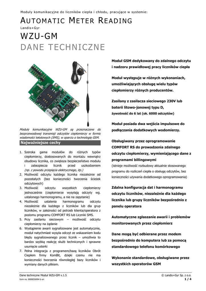 Moduły komunikacyjne do liczników ciepła i chłodu, pracujące w systemie: AUTOMATIC METER READING Landis+Gyr WZU-GM D A N E T EC H N I C Z N E Moduł GSM dedykowany do zdalnego odczytu i nadzoru prawidłowej pracy liczników ciepła Moduł występuje w różnych wykonaniach, umożliwiających obsługę wielu typów ciepłomierzy różnych producentów. Zasilany z zasilacza sieciowego 230V lub baterii litowo-jonowej jonowej typu D, żywotność do 6 lat (ok. 6000 odczytów) Moduł posiada dwa wejścia impulsowe do Moduły komunikacyjne WZU-GM są przeznaczone do bezprzewodowej transmisji odczytów ciepłomierzy w formie wiadomości tekstowych (SMS), w oparciu o technologię GSM. GSM Najważniejsze cechy podłączania dodatkowych wodomierzy. Obsługiwany przez oprogramowanie oprogra COMFORT RS do prowadzenia zdalnego 1. Szeroka gama modułów do różnych typów ciepłomierzy, dostosowanych do montażu wewnątrz obudowy licznika, co zwiększa bezpieczeństwo modułu i zabezpiecza ecza licznik przed uszkodzeniem (np. z powodu przepięcia elektrycznego, itp.) 2. Możliwość odczytu każdego licznika niezależnie niezależ od pozostałych (bez konieczności tworzenia ścieżek odczytowych) 3. Możliwość odczytu wszystkich ciepłomierzy jednocześnie (ciepłomierze wysyłają odczyty wg. ustalonego harmonogramu, a nie na zapytanie) 4. Możliwość ustalenia harmonogramu odczytu niezależnie dla każdego z liczników lub dla grup liczników, w zależności od potrzeb klienta/operatora z poziomu programu COMFORT RS lub Liczniki SMS. 5. Przy zasilaniu sieciowym – możliwość odczytu ciepłomierzy na żądanie 6. Wystąpienie awarii sygnalizowane jest automatycznie, automatyczn moduł natychmiast wysyła odczyt ze wskazaniem kodu błędu sygnalizowanego przez licznik – umożliwia to bardzo szybką reakcję służb technicznych i sprawne usunięcie usterki 7. Pełna integracja z programem/bazą bazą liczników Obrót Ciepłem firmy KomBit,, dzięki czemu cz nie ma konieczności tworzenia równoległej bazy liczników i wymiany danych plikiem. Dane techniczne Moduł WZU-GM v.1.5 form no. 8000036994 b en odczytu ciepłomierzy, wymieniającego dane z programami billingowymi (istnieje możliwość rozbudowy aktualnie stosowanego programu do rozliczeń ciepła o obsługę odczytów, bez konieczności używania dodatkowego oprogramowania) Zdalna konfiguracja dat i harmonogramu odczytu liczników, niezależnie dla każdego licznika lub grupy liczników bezpośrednio z panelu operatora Automatyczne zgłaszanie awarii i problemów monitorowanych przez ciepłomierz Dane mogą być odbierane przez modem bezpośrednio do komputera lub za pomocą standardowego telefonu komórkowego Wykonanie standardowe, obsługiwane przez wszystkich operatorów GSM © Landis+Gyr Sp. z o.o. 1/4 Ogólna charakterystyka Dodatkowe wejścia impulsowe Moduł jest instalowany wewnątrz obudowy ciepłomierza, a Moduł WZU-GM jest wyposażony w dwa dodatkowe komunikacja z licznikiem odbywa się poprzez standardowe wejścia wewnętrzne złącza komunikacyjne licznika. Moduł oparty wodomierzy. Wejścia te są galwanicznie separowane, aby jest zabezpieczyć o przemysłowy modem GSM dual-band impulsowe układ do podłączenia elektroniczny dodatkowych licznika przed 900/1800/1900 MHz. Odczyty są przesyłane w postaci ewentualnym uszkodzeniem. Zasilanie wejść impulsowych wiadomości definiuje jest niezależnie od zasilania licznika. Moduł może być interwał (harmonogram) w jakim moduł ma przesyłać użyty jako odbiornik impulsów z nadajników typu „Reed”, odczyty. Ponieważ każdy moduł jest odrębnym punktem otwarty kolektor lub innych, których sygnał można dostępu, jednego, odwzorować sposobem 0/1. W tym przypadku waga konkretnego licznika lub grupy liczników. Jeśli moduły są impulsów ustawiona zostanie jako 1. Wykorzystując te zasilanie sieciowo, operator może odczytać konkretny wejścia w sposób niestandardowy należy zwrócić uwagę licznik lub grupę liczników na żądanie. Gdy ciepłomierz na polaryzację przewodów podłączanych do wejść. Moduł zasygnalizuje błąd (pojawi się kod błędu), moduł wyśle może przekazywać stan z wejść impulsowych do licznika, wiadomość z odczytem niezwłocznie, poza ustalonym gdy ten umożliwia taką funkcję. W takim przypadku harmonogramem. Moduł WZU-GM jest wyposażony w dwa wartości zostaną pokazane na wyświetlaczu licznika. Gdy wejścia impulsowe do podłączenia dodatkowych urządzeń licznik nie posiada lub nie jest uruchomiona na nim opcja np. wodomierzy. Jeśli dany licznik ciepła obsługuje wejść impulsowych, moduł nie współpracuje z licznikiem w wejścia tym zakresie, a dane z tych wejść dostępne są tylko w SMS. Użytkownik harmonogram impulsowe, samodzielnie może stan na dotyczyć tych wejściach jest przekazywany i prezentowany na wyświetlaczu licznika. transmisji GSM. Jeśli nie, zakumulowana wartość z wejść impulsowych jest Uwaga, dostępna wyłącznie w paczce transmitowanych danych. sparametryzowane (za pomocą SMS’a lub programu wejścia wodomierzowe nie zostaną konfiguracyjnego licznika), pozostają nieaktywne. Niezawodność Wewnętrzne dopóki moduły GSM/SMS są wyposażone w Montaż modułu automatyczny system służący do kontroli poprawności Przygotowanie karty SIM wykonywanych zadań. Jeśli serwis operatora GSM jest Przed uruchomieniem karta SIM wymaga przygotowania. niedostępny, moduł co godzinę automatycznie będzie Najlepiej ponawiał Moduł komórkowego. W pierwszej kolejności należy usunąć standardowo jest zasilany z zasilacza sieciowego 230V, konieczność wprowadzania kodu PIN do uruchomienia alternatywnie może zostać dostarczony z baterią typu D karty. (ok. wykonywania próbę 6000 zalogowania odczytów). Aby się do sieci. maksymalnie wydłużyć jest Zaleca skorzystać się także połączeń ze zwykłego zablokowanie głosowych i telefonu możliwości transmisji żywotność
