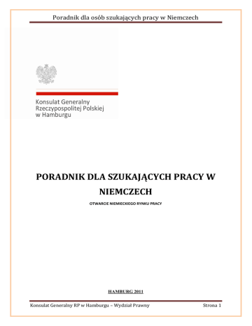 Poradnik dla osób szukających pracy w Niemczech PORADNIK DLA SZUKAJĄCYCH PRACY W NIEMCZECH OTWARCIE NIEMIECKIEGO RYNKU PRACY HAMBURG 2011 Konsulat Generalny RP w Hamburgu – Wydział Prawny Strona 1 Poradnik dla osób szukających pracy w Niemczech WPROWADZENIE I. NIEMIECKI RYNEK PRACY 4 Poszukiwane zawody 4 Zatrudnienie czy własna działalność gospodarcza? 5 Poszukiwanie pracy 5 Polskie agencje zatrudnienia 6 Za co polska agencja nie może pobrać opłaty 7 Agencje pracy w Niemczech 7 Jak uniknąć nielegalnego pośrednika w Niemczech 8 Jak sprawdzić niemiecką agencję pracy tymczasowej 8 II. ZANIM WYJEDZIESZ 9 Licz się z porażką 10 III. FORMALNOŚCI PO PRZYJEŹDZIE 11 Obowiązek meldunkowy 10 Ubezpieczenie zdrowotne 10 Rejestracja w niemieckim urzędzie pracy 11 Zasiłek dla bezrobotnych 11 Rejestracja własnej działalności gospodarczej 12 Pozwolenie na pobyt 13 IV. UZNAWANIE DYPLOMÓW I KWALIFIKACJI ZAWODOWYCH 14 V. PODSTAWOWE PRAWA PRACOWNIKÓW 17 Umowa o pracę 17 Wynagrodzenie za pracę 17 Czas pracy 17 Urlop 18 Prawa pracowników oddelegowanych w ramach świadczenia usług 18 Prawa pracownika tymczasowego - transgraniczne użyczanie pracowników 18 VI. PRAWO DO ŚWIADCZEŃ SPOŁECZNYCH 18 Kindergeld 19 Elterngeld 19 VII. UBEZPIECZENIA SPOŁECZNE 19 VIII. Zasiłki chorobowe 20 Świadczenia z tytułu wypadków przy pracy i chorób zawodowych 21 Renta i emerytura 21 DOCHODZENIE ROSZCZEŃ PRACOWNICZYCH W NIEMCZECH 22 Dochodzenie roszczeń pracowniczych w Polsce 23 Bezpłatne porady z prawa pracy 24 IX. ORGANY KONTROLI I NADZORU 25 X. Polska Państwowa Inspekcja Pracy 25 Gewerbeaufsicht 25 Finanzkontrolle Schwarzarbeit 25 POWRÓT DO KRAJU 26 Jakie kroki możesz podjąć będąc jeszcze w Niemczech 26 Transfer niemieckiego zasiłku dla bezrobotnych do Polski 27 Prawo do polskiego zasiłku dla bezrobotnych po powrocie z Niemiec 27 XI. ZAGROŻENIA ZWIĄZANE Z WYJAZDEM 28 XII. SYSTEM OPIEKI NAD MAŁOLETNIMI 32 Konsulat Generalny RP w Hamburgu – Wydział Prawny Strona 2 Poradnik dla osób szukających pracy w Niemczech WPROWADZENIE Niniejszy poradnik jest zbiorem podstawowych informacji na temat warunków pracy oraz pobytu w Niemczech. Stworzony został na podstawie doświadczeń w codziennej pracy konsularnej. Krok po kroku omawia problemy na jakie może natrafić polska migracja zarobkowa. Doradzamy, jak tych problemów uniknąć i do jakich instytucji można zwrócić się o pomoc. Uwaga! Poradnik nie stanowi jednak źródła prawa. Pomimo dołożenia wszelkiej staranności w jego przygotowaniu, autor nie ponosi odpowiedzialności za ewentualne nieścisłości łub błędy. Informacje zawarte w poradniku nie będą stanowiły podstawy do odpowiedzialności odszkodowawczej wobec użytkowników. Konsulat służy pomocą udzielając wszelkich informacji, które mogą pomóc w uniknięciu ewentualnych kłopotów na terenie Niemiec. Urząd udziela informacji o obowiązujących przepisach prawa, a w szczególnych sytuacjach, na prośbę zainteresowanego, udostępnia listę polskojęzycznych adwokatów działających na terenie danego okręgu konsularnego. Działając na rzecz obywateli polskich konsul przestrzega norm prawa międzynarodowego i zwyczajów międzynarodowych, prawa Unii Europejskiej, prawa polskiego oraz prawa i zwyczajów miejscowych. Stosowne kroki interwencyjne u władz miejscowych konsul podejmuje po zebraniu niezbędnych informacji i możliwie dokładnym ustaleniu okoliczności sprawy. Stosowne interwencje podejmuje w szczególności w przypadkach dyskryminacji polskich obywateli. Jako dyskryminacyjne nie mogą być traktowane same w sobie działania władz miejscowych, polegające na kontroli i egzekwowaniu przestrzegania prawa w ramach ich ustawowych kompetencji, lecz jedynie wówczas, gdy te działania w stosunku do obywatela polskiego nie odpowiadają standardom stosowanym wobec innych obywateli państw Unii Europejskiej. Konsulat Generalny RP w Hamburgu – Wydział Prawny Strona 3 Poradnik dla osób szukających pracy w Niemczech I. NIEMIECKI RYNEK PRACY Od 1 maja 2011 r. obywatele polscy nie potrzebują zezwoleń na pracę i korzystają ze swobodnego, nieograniczonego dostępu do niemieckiego rynku pracy. Z dniem 30 kwietnia 2011 roku przestaje obowiązywać „Traktat Akcesyjny" z 2003 r. Polski z Unią Europejską, który pozwolił ówczesnym państwom członkowskim UE, między innymi Niemcom, na czasowe ograniczenie swobodnego dostępu do ich rynków pracy dla obywateli ośmiu nowych państw przystępujących do UE w 2004 r. Od 1 maja 2011 polskie przedsiębiorstwa mogą delegować pracowników do wykonania prac w krajach Unii Europejskiej korzystając z obowiązującej w Unii Europejskiej swobody świadczenia usług. Przestaną obowiązywać branżowe ograniczenia wprowadzone „Traktatem Akcesyjnym". Chodzi tu m.in. o prace budowlane, sprzątanie i dekoratorstwo wnętrz, które do 30 kwietna 2011 mogły być wykonywane przez polskie przedsiębiorstwa tylko na podstawie polsko-niemieckiej umowy z 31.01.1990 o oddelegowaniu pracowników polskich przedsiębiorstw do realizacji umów o dzieło (Dz. U. 1994 r. nr 98 poz. 474), w ramach wyznaczonego kontyngentu i po uzyskaniu zezwoleń na pracę. Pracownicy delegowani do Niemiec do dnia 30 kwietnia 2011 r. w ramach umowy z 1990 roku będą mogli po tym terminie kontynuować wykonywanie pracy w ramach swobody świadczenia usług, obowiązującej w Unii Europejskiej zgodnie z art. 49 Traktatu Ustanawiającego Wspólnotę Europejską (art. 56 Traktatu o Funkcjonowaniu UE). Poszukiwane zawody Mimo istniejącego bezrobocia Niemcy poszukują pracowników dla poszczególnych branż: rolnictwa, hotelarstwa, gastronomii, do opieki nad chorymi, inżynierów, informatyków. Szansę na znalezienie dobrze płatnej pracy mają osoby z odpowiednimi kwalifikacjami. Lista zawodów deficytowych to zawody wyuczone, w których trzeba się wykazać pewnymi kwalifikacjami. Aktualny wykaz najbardziej poszukiwanych zawodów na