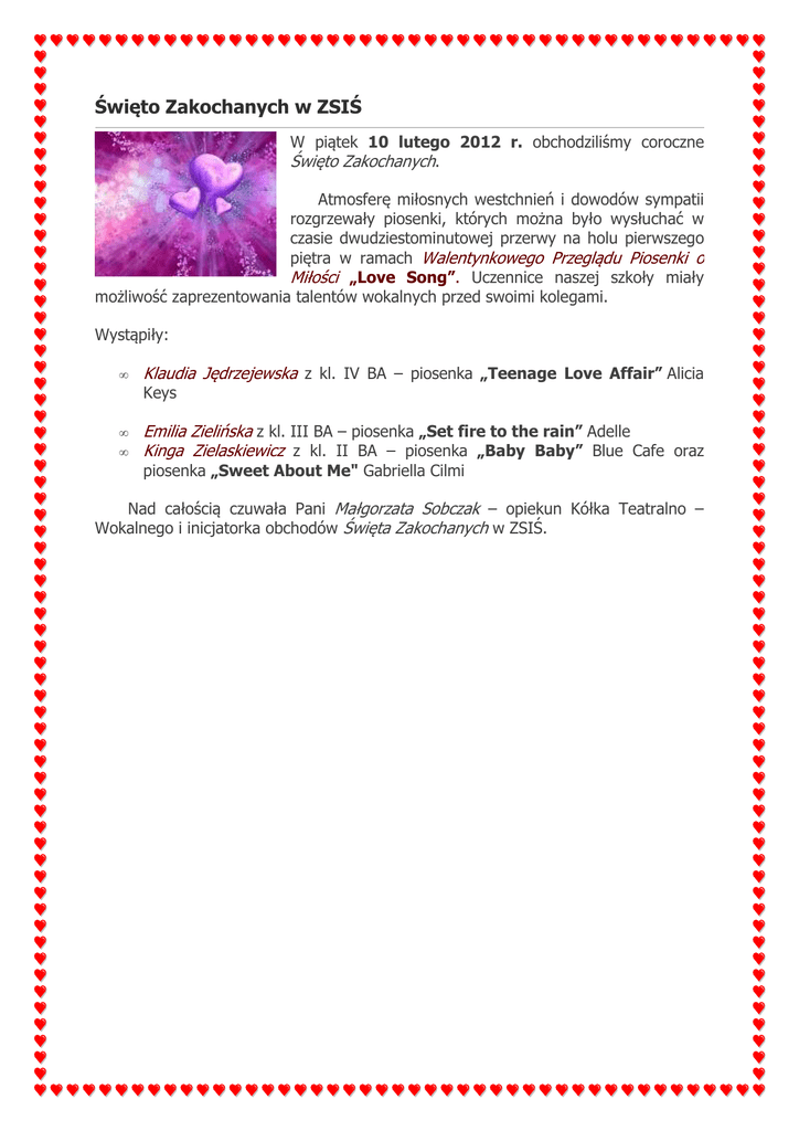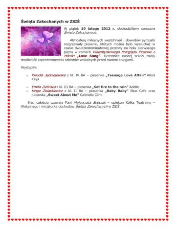 Święto Zakochanych w ZSIŚ W piątek 10 lutego 2012 r. obchodziliśmy coroczne Święto Zakochanych. Atmosferę miłosnych westchnień i dowodów sympatii rozgrzewały piosenki, których można było wysłuchać w czasie dwudziestominutowej przerwy na holu pierwszego piętra w ramach Walentynkowego Przeglądu Piosenki o Miłości „Love Song”. Uczennice naszej szkoły miały możliwość zaprezentowania talentów wokalnych przed swoimi kolegami. Wystąpiły: • Klaudia Jędrzejewska z kl. IV BA – piosenka „Teenage Love Affair” Alicia Keys • • Emilia Zielińska z kl. III BA – piosenka „Set fire to the rain” Adelle Kinga Zielaskiewicz z kl. II BA – piosenka „Baby Baby” Blue Cafe oraz piosenka „Sweet About Me" Gabriella Cilmi Nad całością czuwała Pani Małgorzata Sobczak – opiekun Kółka Teatralno – Wokalnego i inicjatorka obchodów Święta Zakochanych w ZSIŚ. Występ Kingi Zielaskiewicz z klasy II BA Występ Klaudii Jędrzejewskiej z klasy IV BA Występ Emilii Zielińskiej z klasy III BA