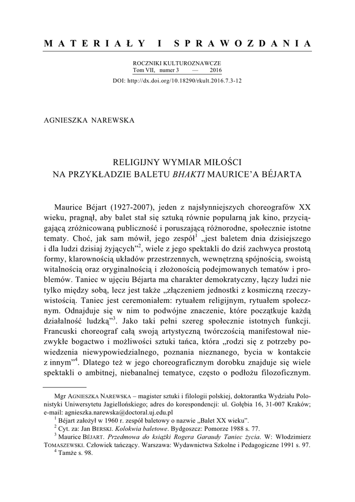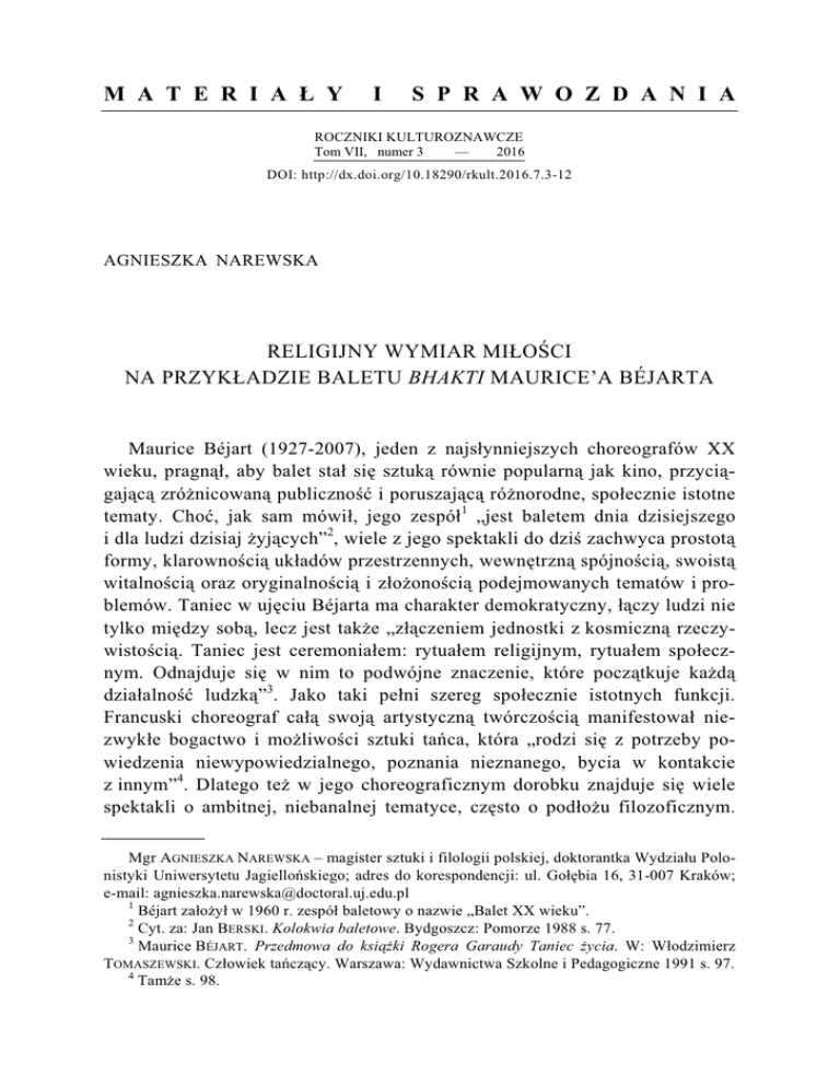 M A T E R I A Y I S P R A W O Z D A N I A ROCZNIKI KULTUROZNAWCZE Tom VII, numer 3 — 2016 DOI: http://dx.doi.org/10.18290/rkult.2016.7.3-12 AGNIESZKA NAREWSKA * RELIGIJNY WYMIAR MIOCI NA PRZYKADZIE BALETU BHAKTI MAURICE’A BÉJARTA Maurice Béjart (1927-2007), jeden z najsynniejszych choreografów XX wieku, pragn, aby balet sta si sztuk równie popularn jak kino, przycigajc zrónicowan publiczno i poruszajc rónorodne, spoecznie istotne tematy. Cho, jak sam mówi, jego zespó1 „jest baletem dnia dzisiejszego i dla ludzi dzisiaj yjcych”2, wiele z jego spektakli do dzi zachwyca prostot formy, klarownoci ukadów przestrzennych, wewn trzn spójnoci, swoist witalnoci oraz oryginalnoci i zoonoci podejmowanych tematów i problemów. Taniec w uj ciu Béjarta ma charakter demokratyczny, czy ludzi nie tylko mi dzy sob, lecz jest take „zczeniem jednostki z kosmiczn rzeczywistoci. Taniec jest ceremoniaem: rytuaem religijnym, rytuaem spoecznym. Odnajduje si w nim to podwójne znaczenie, które pocztkuje kad dziaalno ludzk”3. Jako taki peni szereg spoecznie istotnych funkcji. Francuski choreograf ca swoj artystyczn twórczoci manifestowa niezwyke bogactwo i moliwoci sztuki taca, która „rodzi si z potrzeby powiedzenia niewypowiedzialnego, poznania nieznanego, bycia w kontakcie z innym”4. Dlatego te w jego choreograficznym dorobku znajduje si wiele spektakli o ambitnej, niebanalnej tematyce, cz sto o podou filozoficznym. Mgr AGNIESZKA NAREWSKA – magister sztuki i filologii polskiej, doktorantka Wydziau Polonistyki Uniwersytetu Jagielloskiego; adres do korespondencji: ul. Go bia 16, 31-007 Kraków; e-mail: [email protected] 1 Béjart zaoy w 1960 r. zespó baletowy o nazwie „Balet XX wieku”. 2 Cyt. za: Jan BERSKI. Kolokwia baletowe. Bydgoszcz: Pomorze 1988 s. 77. 3 Maurice BÉJART. Przedmowa do ksiki Rogera Garaudy Taniec ycia. W: Wodzimierz TOMASZEWSKI. Czowiek taczcy. Warszawa: Wydawnictwa Szkolne i Pedagogiczne 1991 s. 97. 4 Tame s. 98. 216 AGNIESZKA NAREWSKA Zamiowanie do filozofii Béjart wyniós ju z domu rodzinnego, gdy jego ojciec Gaston Berger, cho zarabia na ycie jako przemysowiec, skoczy studia filozoficzne pod kierunkiem Maurice’a Blondela5. Po otrzymaniu za tytuu doktorskiego, po obronie pracy powi conej Edmundowi Husserlowi 6, Berger powi ci si ju gównie dziaalnoci naukowej. To po nim Maurice Béjart7 odziedziczy pasj do czytania ksiek, skonno do mistycyzmu, ciekawo wiata i szerokie horyzonty mylowe, które doprowadziy go do wczania do swoich spektakli elementów z kultur pozaeuropejskich, m.in. z hinduizmu8. Jego zainteresowanie obyczajami indyjskimi narodziy si ju w dziecistwie, kiedy to przeczyta jedn z cz ci najduszego eposu wiata – Mahabharaty, zatytuowan Bhagawadgita9. Béjart rozwija je nast pnie podczas swych podróy do Indii, które powi ca dla jak najlepszego poznania tamtejszej kultury. Po jednym z wyjazdów choreograf opisa jedno z wanych przey, które na dugo zapado mu w pami : [...] spotkaem mistrza, prawdziwego i uznanego jog , i wyjawiem mu moje pragnienie poznania wicze jogi g boko, a nie w sposób powierzchownie fizyczny. Odpowiedzia mi: „Sowo joga oznacza jedno. T jedno moe pan znale poprzez taniec, gdy taniec take jest jednoci. Pan jest tancerzem: iwa, Pan wiata, wielki joga, jest nazywany take Nataraja, król taca... Pan jest tancerzem, ma pan szcz cie. Niech paski taniec b dzie pask jog, niech pan nie szuka innej”. Póniej, patrzc na mnie w chwili rozstania, dorzuci: „Ach! gdyby wszyscy ludzie Zachodu potrafili na nowo nauczy si taczy10. Béjart by zafascynowany indyjsk kultur do tego stopnia, e zaoon przez siebie w 1971 r. w Brukseli szko taca nazwa Mudra11, a drug, otwart w 1992 r. w Lozannie, opatrzy nazw Rudra12. Widoczne lady tej 5 Maurice Blondel (1861-1949), francuski filozof zwizany z nurtem modernizmu katolickiego. Le Cogito dans la philosophie de Husserl. Paris: Aubier 1941. 7 Béjart to artystyczny pseudonim, który choreograf zaczerpn od panieskiego nazwiska ony Moliera, Madeleine Béjart, gdy – jak pisze Jacek Marczyski – „si gn [on, przyp. A. N.] do tradycji w drownych artystów, bo sam czu si jednym z nich”. Jacek MARCZYSKI. Maurice Béjart nie lubi czekoladek. W: TENE. Dziesiciu taczcych facetów. Warszawa: Axis Mundi 2014 s. 47. 8 W dorobku choreograficznym Béjarta znajduj si take nawizania do kultury afrykaskiej, np. w finale IX Symfonii. Zob. J. MARCZYSKI. Maurice Béjart nie lubi czekoladek s. 52. 9 Por. Irena TURSKA. Materiay do nauczania historii taca. Warszawa: Warexpo 1976 s. 68. 10 M. BÉJART. Przedmowa s. 99. 11 Symboliczny ukad doni w hinduizmie. 12 Rudra – dos. „wyjcy”; wedyjskie bóstwo burz i gromów; w póniejszym okresie utosamiony z iw”. Herbert ELLINGER. Hinduizm. Prze. Grzegorz Sowinski Kraków: Znak 1997 s. 103. 6 RELIGIJNY WYMIAR MIOCI 217 fascynacji mona znale jednak przede wszystkim w samych spektaklach francuskiego choreografa, który inspirowa si wieloma aspektami bogatej kultury Indii. Za przykad moe posuy spektakl Le Cygne (*abd) z 1965 r., w którym jako akompaniament do taca wykorzysta Béjart tradycyjn muzyk indyjsk, libretto za opar na tekstach Rabindranatha Tagore. Z kolei w balecie Messe pour le temps présent (Msza dzisiejszych czasów) z 1967 r. twórczo wykorzystywa elementy i filozoficzne przesanki jogi13. W innych przedstawieniach, wród których znajduje si Casse noisette (Dziadek do orzechów) z 2000 r. oraz Les Vainqueurs (Zwycizcy) z 1967 r., wprowadza natomiast elementy mudry, mimo e najcz ciej pozostaway one nieczytelne dla widzów spoza indyjskiego kr gu kulturowego. Znajomo mudr przyczynia si do wypracowania przez artyst wasnych gestów symbolicznych, które pojawiy si póniej w wielu jego choreografiach. Najsynniejszym baletem Béjarta zwizanym z Indiami jest spektakl Bhakti, którego premiera miaa miejsce w 1968 r. w Brukseli. Tytuem, inspiracj oraz gównym jego tematem jest szczególna forma mioci i przywizania do boga, odmiana wyjtkowej pobonoci i religijn