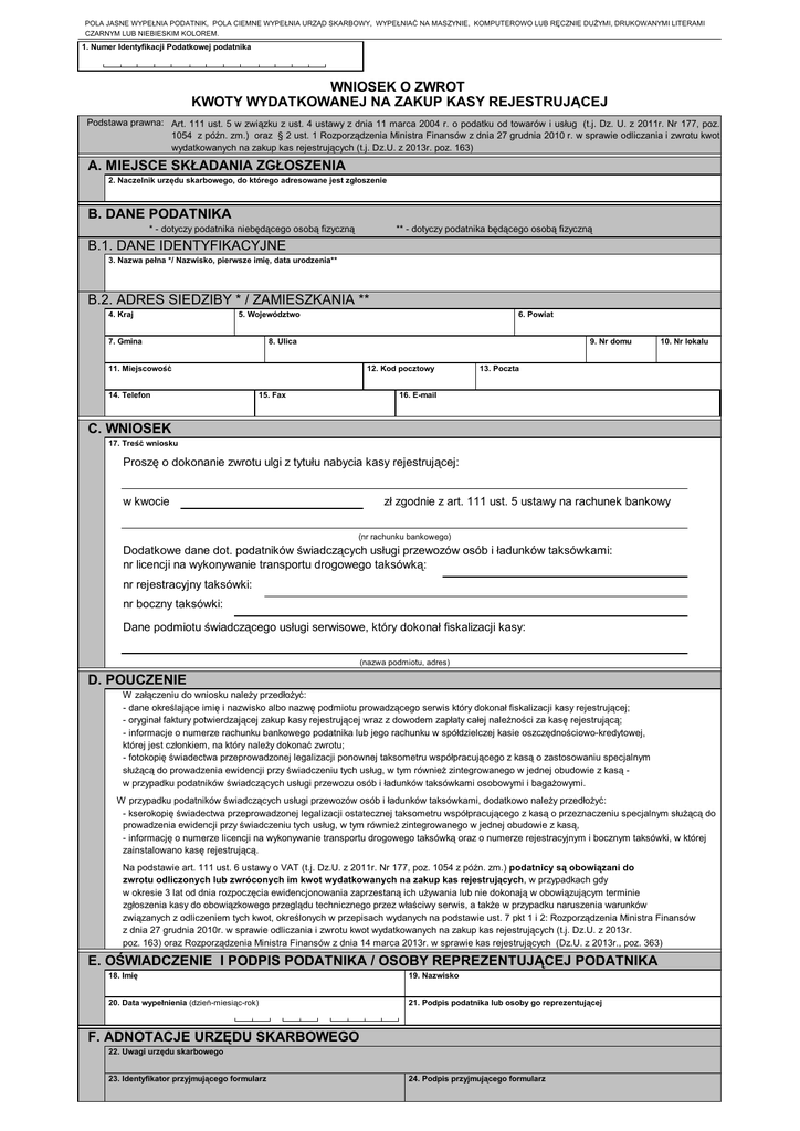 POLA JASNE WYPEŁNIA PODATNIK, POLA CIEMNE WYPEŁNIA URZĄD SKARBOWY, WYPEŁNIAĆ NA MASZYNIE, KOMPUTEROWO LUB RĘCZNIE DUŻYMI, DRUKOWANYMI LITERAMI CZARNYM LUB NIEBIESKIM KOLOREM. 1. Numer Identyfikacji Podatkowej podatnika WNIOSEK O ZWROT KWOTY WYDATKOWANEJ NA ZAKUP KASY REJESTRUJĄCEJ Podstawa prawna: Art. 111 ust. 5 w związku z ust. 4 ustawy z dnia 11 marca 2004 r. o podatku od towarów i usług (t.j. Dz. U. z 2011r. Nr 177, poz. 1054 z późn. zm.) oraz § 2 ust. 1 Rozporządzenia Ministra Finansów z dnia 27 grudnia 2010 r. w sprawie odliczania i zwrotu kwot wydatkowanych na zakup kas rejestrujących (t.j. Dz.U. z 2013r. poz. 163) A. MIEJSCE SKŁADANIA ZGŁOSZENIA 2. Naczelnik urzędu skarbowego, do którego adresowane jest zgłoszenie B. DANE PODATNIKA * - dotyczy podatnika niebędącego osobą fizyczną ** - dotyczy podatnika będącego osobą fizyczną B.1. DANE IDENTYFIKACYJNE 3. Nazwa pełna */ Nazwisko, pierwsze imię, data urodzenia** B.2. ADRES SIEDZIBY * / ZAMIESZKANIA ** 4. Kraj 5. Województwo 7. Gmina 6. Powiat 8. Ulica 9. Nr domu 12. Kod pocztowy 11. Miejscowość 14. Telefon 15. Fax 10. Nr lokalu 13. Poczta 16. E-mail C. WNIOSEK 17. Treść wniosku Proszę o dokonanie zwrotu ulgi z tytułu nabycia kasy rejestrującej: w kwocie zł zgodnie z art. 111 ust. 5 ustawy na rachunek bankowy (nr rachunku bankowego) Dodatkowe dane dot. podatników świadczących usługi przewozów osób i ładunków taksówkami: nr licencji na wykonywanie transportu drogowego taksówką: nr rejestracyjny taksówki: nr boczny taksówki: Dane podmiotu świadczącego usługi serwisowe, który dokonał fiskalizacji kasy: (nazwa podmiotu, adres) D. POUCZENIE W załączeniu do wniosku należy przedłożyć: - dane określające imię i nazwisko albo nazwę podmiotu prowadzącego serwis który dokonał fiskalizacji kasy rejestrującej; - oryginał faktury potwierdzającej zakup kasy rejestrującej wraz z dowodem zapłaty całej należności za kasę rejestrującą; - informacje o numerze rachunku bankowego podatnika lub jego rachunku w spółdzielczej kasie oszczędnościowo-kredytowej, której jest członkiem, na który należy dokonać zwrotu; - fotokopię świadectwa przeprowadzonej legalizacji ponownej taksometru współpracującego z kasą o zastosowaniu specjalnym służącą do prowadzenia ewidencji przy świadczeniu tych usług, w tym również zintegrowanego w jednej obudowie z kasą w przypadku podatników świadczących usługi przewozu osób i ładunków taksówkami osobowymi i bagażowymi. W przypadku podatników świadczących usługi przewozów osób i ładunków taksówkami, dodatkowo należy przedłożyć: - kserokopię świadectwa przeprowadzonej legalizacji ostatecznej taksometru współpracującego z kasą o przeznaczeniu specjalnym służącą do prowadzenia ewidencji przy świadczeniu tych usług, w tym również zintegrowanego w jednej obudowie z kasą, - informację o numerze licencji na wykonywanie transportu drogowego taksówką oraz o numerze rejestracyjnym i bocznym taksówki, w której zainstalowano kasę rejestrującą. Na podstawie art. 111 ust. 6 ustawy o VAT (t.j. Dz.U. z 2011r. Nr 177, poz. 1054 z późn. zm.) podatnicy są obowiązani do zwrotu odliczonych lub zwróconych im kwot wydatkowanych na zakup kas rejestrujących, w przypadkach gdy w okresie 3 lat od dnia rozpoczęcia ewidencjonowania zaprzestaną ich używania lub nie dokonają w obowiązującym terminie zgłoszenia kasy do obowiązkowego przeglądu technicznego przez właściwy serwis, a także w przypadku naruszenia warunków związanych z odliczeniem tych kwot, określonych w przepisach wydanych na podstawie ust. 7 pkt 1 i 2: Rozporządzenia Ministra Finansów z dnia 27 grudnia 2010r. w sprawie odliczania i zwrotu kwot wydatkowanych na zakup kas rejestrujących (t.j. Dz.U. z 2013r. poz. 163) oraz Rozporządzenia Ministra Finansów z dnia 14 marca 2013r. w sprawie kas rejestrujących (Dz.U. z 2013r., poz. 363) E. OŚWIADCZENIE I PODPIS PODATNIKA / OSOBY REPREZENTUJĄCEJ PODATNIKA 18. Imię 19. Nazwisko 20. Data wypełnienia (dzień-miesiąc-rok) 21. Podpis podatnika lub osoby go reprezentującej F. ADNOTACJE URZĘDU SKARBOWEGO 22. Uwagi urzędu skarbowego 23. Identyfikator przyjmującego formularz 24. Podpis przyjmującego formularz
