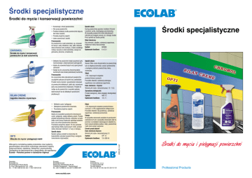 rodki specjalistyczne rodki do mycia i konserwacji powierzchni Konserwuje i chroni powierzchnie. Nie rysuje powierzchni. Poddane dzia³aniu rodka powierzchnie daj¹ siê bez trudu oczyciæ. Posiada przyjemny zapach. £atwo usuwa brud i zacieki. CHROMOL rodek do mycia i konserwacji powierzchni ze stali szlachetnej Przeznaczenie: Do powierzchni ze stali szlachetnej, np. zmywarki do naczyñ, szafy ch³odnicze, lady, pó³ki, blaszane obicia drzwiowe wind, kontuary, a tak¿e wszelkiego rodzaju naczynia ze stali szlachetnej, s³u¿¹ce do gotowania, pieczenia, sma¿enia itp. Delikatne dla powierzchni dziêki zawartoci py³u marmurowego o w³aciwociach poleruj¹cych. Idealne do usuwania t³ustych oraz uporczywych zabrudzeñ. Nadaje siê do czyszczenia zlewozmywaków kuchennych oraz armatury ³azienkowej i kuchennej. RILAN CREME Przeznaczenie: Do czyszczenia silnie zabrudzonych powierzchni, szczególnie zalecany do kuchni oraz sanitariatów. Produkt mo¿na równie¿ z powodzeniem stosowaæ do powierzchni delikatnych, takich jak: ceramiczne p³yty oraz powierzchnie emaliowane. Produkt nie nadaje siê do powierzchni o wysokim po³ysku, lakierowanych lub do delikatnych powierzchni plastikowych. £agodne mleczko czyszcz¹ce Delikatnie czyci i pielêgnuje Zabezpiecza powierzchnie drewniane. Pozostawia przyjemny zapach. Przeznaczenie: Idealny do wszystkich powierzchni drewnianych; czyci, pielêgnuje, nadaje delikatny po³ysk. Produkt posiada konsystencjê mleczka; wykonany na bazie olejku z pinii (sosny) skutecznie zapobiega osiadaniu kurzu oraz chroni powierzchnie drewniane. Pozostawia przyjemny zapach. W celu uzyskania optymalnego efektu czyszczonych mebli, produkt nale¿y stosowaæ minimum 1-2 razy w miesi¹cu. OPTI Mleczko do mycia i pielêgnacji mebli Sposób u¿ycia: Nanieæ gotowy produkt na ciereczkê lub bezporednio spryskaæ powierzchniê a nastêpnie równomiernie rozprowadziæ. Sposób u¿ycia: Such¹ powierzchniê spryskaæ rodkiem Chromol i przetrzeæ such¹, niestrzêpi¹c¹ siê ciereczk¹. W przypadku powierzchni silnie zabrudzonych zalecane jest wstêpne umycie, np. stosuj¹c rodek Pricol perfekt lub Sirafan perfekt. Sk³ad chemiczny: Olej mineralny, parafina, substancja zapachowa, trójgliceryn kwasu t³uszczowego. Symbol: 902939 Opakowanie handlowe: 6 x 0,5 l Sposób u¿ycia: Nanieæ Rilan creme bezporednio na powierzchniê lub na wilgotn¹ ciereczkê; czyciæ powierzchniê a nastêpnie przetrzeæ powierzchniê mokr¹ ciereczk¹. Sk³ad: <5%: niejonowych zwi¹zków powierzchniowo czynnych. Pozosta³e sk³adniki: substancje poleruj¹ce, wype³niacze oraz substancje zapachowe. Dane chemiczno - fizyczne: Wartoæ pH (roztw. nierozcieñczony): 10 - 10,5. Sprawdzony ekologicznie: Produkt ekologiczny, ³atwo ulegaj¹cy biodegradacji. Symbol: NRC 12 Opakowanie handlowe: 12 x 1 l. Sk³ad: <5% niejonowych zwiazków powierzchniowo czynnych, 5-15% wêglowodorów alifatycznych. Pozosta³e sk³adniki: olej parafinowy, substancje zapachowe, substancje pomocnicze. Uwaga: W przypadku stosowanie produktu do powierzchni uszkodzonych lub w przypadku stosowania Opti na przemian z produktami zawieraj¹cymi sk³adniki na bazie rozpuszczalników (politury, oleje), powierzchnia mebli mo¿e zostaæ naruszona. Chroniæ przed dzieæmi! Dane chemiczno-fizyczne: Wartoæ pH (roztw. nierozcieñczony): 8. Symbol: OPT 12 Opakowanie handlowe: 12 x 500 ml. Europa: ECOLAB GmbH Reisholzer Werftstraße 38-42 D-40554 Düsseldorf - Deutschland tel.: (0211) 9893-0; fax (0211) 9893-384 www.ecolab.com SPEC/PL11/07 Oferujemy kompletn¹ paletê produktów oraz systemy gwarantuj¹ce utrzymanie wysokiego standardu higieny instytucjonalnej, szpitalnej, tekstylnej i przemys³owej. Zachêcamy do zapoznania siê z nasz¹ ofert¹ i do wspó³pracy. Ecolab - Pañstwa partner w dziedzinie higieny! Centrala: ECOLAB Inc. 370 Wabasha Street North St. Paul, Minnesota 55 102 - USA tel.: +1-651-293-22 33; fax +1-651-293-20 92 rodki specjalistyczne Polska: ECOLAB Sp. z o.o. ul. Kalwaryjska 69 30-504 Kraków tel.: 012 26 16 100; fax 012 26 16 101 rodki do mycia i pielêgnacji powierzchni Professional Products rodki specjalistyczne rodki do mycia i konserwacji powierzchni Konserwuje i chroni powierzchnie. Nie rysuje powierzchni. Poddane dzia³aniu rodka powierzchnie daj¹ siê bez trudu oczyciæ. Posiada przyjemny zapach. £atwo usuwa brud i zacieki. CHROMOL rodek do mycia i konserwacji powierzchni ze stali szlachetnej Przeznaczenie: Do powierzchni ze stali szlachetnej, np. zmywarki do naczyñ, szafy ch³odnicze, lady, pó³ki, blaszane obicia drzwiowe wind, kontuary, a tak¿e wszelkiego rodzaju naczynia ze stali szlachetnej, s³u¿¹ce do gotowania, pieczenia, sma¿enia itp. Delikatne dla powierzchni dziêki zawartoci py³u marmurowego o w³aciwociach poleruj¹cych. Idealne do usuwania t³ustych oraz uporczywych zabrudzeñ. Nadaje siê do czyszczenia zlewozmywaków kuchennych oraz armatury ³azienkowej i kuchennej. RILAN CREME Przeznaczenie: Do czyszczenia silnie zabrudzonych powierzchni, szczególnie zalecany do kuchni oraz sanitariatów. Produkt mo¿na równie¿ z powodzeniem stosowaæ do powierzchni delikatnych, takich jak: ceramiczne p³yty oraz powierzchnie emaliowane. Produkt nie nadaje siê do powierzchni o wysokim po³ysku, lakierowanych lub do delikatnych powierzchni plastikowych. £agodne mleczko czyszcz¹ce Delikatnie czyci i pielêgnuje Zabezpiecza powierzchnie drewniane. Pozostawia przyjemny zapach. Przeznaczenie: Idealny do wszystkich powierzchni drewnianych; czyci, pielêgnuje, nadaje delikatny po³ysk. Produkt posiada konsystencjê mleczka; wykonany na bazie olejku z pinii (sosny) skutecznie zapobiega osiadaniu kurzu oraz chroni powierzchnie drewniane. Pozostawia przyjemny zapach. W celu uzyskania optymalnego efektu czyszczonych mebli, produkt nale¿y stosowaæ minimum 1-2 razy w miesi¹cu. OPTI Mleczko do mycia i pielêgnacji mebli Sposób u¿ycia: Nanieæ gotowy produkt na ciereczkê lub bezporednio spryskaæ powierzchniê a