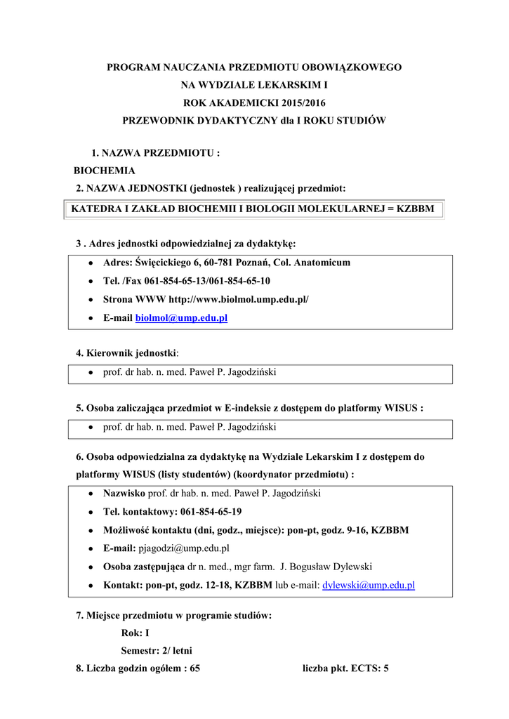 PROGRAM NAUCZANIA PRZEDMIOTU OBOWIĄZKOWEGO NA WYDZIALE LEKARSKIM I ROK AKADEMICKI 2015/2016 PRZEWODNIK DYDAKTYCZNY dla I ROKU STUDIÓW 1. NAZWA PRZEDMIOTU : BIOCHEMIA 2. NAZWA JEDNOSTKI (jednostek ) realizującej przedmiot: KATEDRA I ZAKŁAD BIOCHEMII I BIOLOGII MOLEKULARNEJ = KZBBM 3 . Adres jednostki odpowiedzialnej za dydaktykę: Adres: Święcickiego 6, 60-781 Poznań, Col. Anatomicum Tel. /Fax 061-854-65-13/061-854-65-10 Strona WWW http://www.biolmol.ump.edu.pl/ E-mail [email protected] 4. Kierownik jednostki: prof. dr hab. n. med. Paweł P. Jagodziński 5. Osoba zaliczająca przedmiot w E-indeksie z dostępem do platformy WISUS : prof. dr hab. n. med. Paweł P. Jagodziński 6. Osoba odpowiedzialna za dydaktykę na Wydziale Lekarskim I z dostępem do platformy WISUS (listy studentów) (koordynator przedmiotu) : Nazwisko prof. dr hab. n. med. Paweł P. Jagodziński Tel. kontaktowy: 061-854-65-19 Możliwość kontaktu (dni, godz., miejsce): pon-pt, godz. 9-16, KZBBM E-mail: [email protected] Osoba zastępująca dr n. med., mgr farm. J. Bogusław Dylewski Kontakt: pon-pt, godz. 12-18, KZBBM lub e-mail: [email protected] 7. Miejsce przedmiotu w programie studiów: Rok: I Semestr: 2/ letni 8. Liczba godzin ogółem : 65 liczba pkt. ECTS: 5 KZBBM Semestr letni liczba godzin W Ć Ćwiczenia S kategoria 15 38 A 12 Razem: 15 Jednostki uczestniczące w nauczaniu przedmiotu 38 12 9. Zakres wiedzy ( zgodnie z Rozporządzeniem Ministra Nauki i Szkolnictwa Wyższego z dnia 9 maja 2012 r. w sprawie standardów kształcenia dla kierunków Studiów: lekarskiego B.W10. zna budowę prostych związków organicznych wchodzących w skład makrocząsteczek obecnych w komórkach, macierzy zewnątrzkomórkowej i płynów ustrojowych; B.W11. opisuje budowę lipidów i polisacharydów oraz ich funkcje w strukturach komórkowych i pozakomórkowych; B.W12. charakteryzuje struktury I-, II-, III- oraz IV-rzędowe białek; zna modyfikacje potranslacyjne i funkcjonalne białka oraz ich znaczenie; B.W15. opisuje podstawowe szlaki kataboliczne i anaboliczne, sposoby ich regulacji oraz wpływ czynników genetycznych i środowiskowych; B.W16. zna profile metaboliczne podstawowych narządów i układów; B.W18. zna enzymy biorące udział w trawieniu, mechanizm wytwarzania kwasu solnego w żołądku, rolę żółci, przebieg wchłaniania produktów trawienia oraz zaburzenia z nimi związane; B.W19. zna konsekwencje niewłaściwego odżywiania, w tym długotrwałego głodowania, przyjmowania zbyt obfitych posiłków oraz stosowania niezbilansowanej diety; B.W20. zna konsekwencje niedoboru witamin lub minerałów oraz ich nadmiaru w organizmie; B.W26. zna mechanizm działania hormonów oraz konsekwencje zaburzeń regulacji hormonalnej; 10. Umiejętności ( zgodnie z Rozporządzeniem Ministra Nauki i Szkolnictwa Wyższego z dnia 9 maja 2012 r. w sprawie standardów kształcenia dla kierunków Studiów: lekarskiego B.U6. przewiduje kierunek procesów biochemicznych w zależności od stanu energetycznego komórek; B.U9. posługuje się podstawowymi technikami laboratoryjnymi, takimi jak: analiza jakościowa, miareczkowanie, kolorymetria, pehametria, chromatografia, elektroforeza białek i kwasów nukleinowych; B.U10. obsługuje proste przyrządy pomiarowe oraz ocenia dokładność wykonywanych pomiarów; B.U14. planuje i wykonuje proste badanie naukowe oraz interpretuje jego wyniki i wyciąga wnioski. 11. SYLABUS załącznik 12. Tematyka poszczególnych wykładów, ćwiczeń i seminariów Wykłady - Semestr letni Tematyka wykładów Wykład 1. Enzymy. Koenzymy oraz rola witamin jako ich prekursorów Wykład 2. Metabolizm aminokwasów Wykład 3. Wykład 4. Budowa i funkcja hormonów polipeptydowych oraz białkowych Utleniania biologiczne – cykl kwasu cytrynowego. Łańcuch przenośników elektronów Wykład 5. Biosynteza i funkcja tlenku azotu (NO) Wykład 6. Stres oksydacyjny Wykład 7. Metabolizm kwasu arachidonowego Imię i nazwisko osoby prowadzącej zajęcia prof. dr hab. Paweł Jagodziński Ćwiczenia - Semestr letni Tematyka ćwiczeń Ćwiczenie 1. Ćwiczenie 2. Osoba odpowiedzialna Aminokwasy i peptydy. Struktura i właściwości białek. Klasyfikacja enzymów i koenzymów Metody rozdziału białek i oznaczania aktywności enzymów Ćwiczenie 3. Repetytorium I -Białka Ćwiczenie 4. Związki azotowe występujące w organizmie człowieka - budowa i funkcja biologiczna Ćwiczenie 5. Oznaczanie związków azotowych we krwi Ćwiczenie 6. Repetytorium II – Związki azotowe Ćwiczenie 7. Repetytorium z materiału wykładowego semestru letniego Asystenci KZBBM Seminaria - Semestr letni Tematyka seminariów Seminarium 1. Struktura i funkcja białek Seminarium 2. Hemoglobina Seminarium 3. Enzymy Seminarium 4. Metabolizm nukleotydów purynowych Imię i nazwisko osoby prowadzącej zajęcia Asystenci KZBBM Seminarium 5. Metabolizm nukleotydów pirymidynowych Seminarium 6. Gospodarka azotowa 13. Organizacja zajęć: Aktualny podział grupy studenckiej na stronie internetowej jednostki : http://www.biolmol.ump.edu.pl/ REGULAMIN ZAJĘĆ: Zajęcia dydaktyczne z biochemii odbywają się systemem modułowym. Zakres materiału podzielono na dwa moduły (I. Białka i II. Związki azotowe). W skład każdego modułu wchodzą: sprawdzian wejściowy, ćwiczenie laboratoryjne, trzy seminaria, repetytorium oraz sprawdzian wyjściowy. Tematyka wykładów nie jest powtórzeniem treści omawianych w modułach tematycznych. Zajęcia dydaktyczne (wykłady, ćwiczenia i seminaria) odbywają się wg szczegółowego harmonogramu zajęć zamieszczonego na stronie Katedry i tablicy ogłoszeń zgodnie z planem i wymiarem godzin ustalonym przez Dziekana Wydziału Lekarskiego I. Sprawdziany wejściowe Zajęcia w danym module poprzedza sprawdzian pisemny obejmujący podstawowe wiadomości przydatne do efektywnego uczestniczenia w realizacji treści modułu tematycznego. Punkty uzyskane ze sprawdzianu wejściowego są traktowane jako punkty premii. Ćw