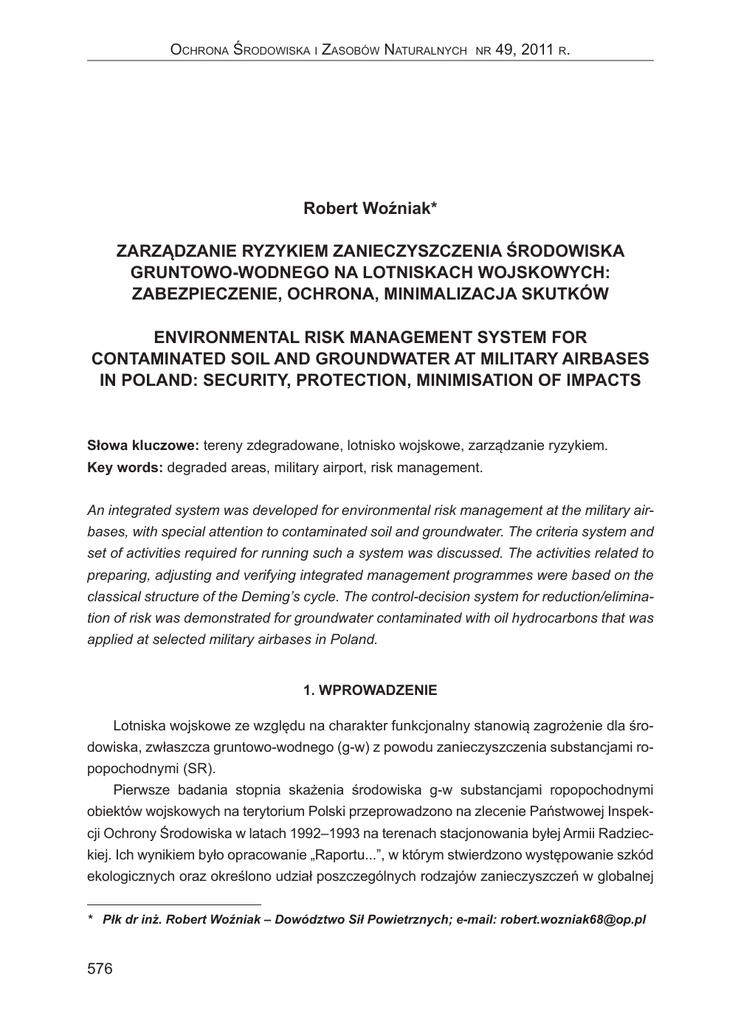 Ochrona Środowiska i Zasobów Naturalnych nr 49, 2011 r. Robert Woźniak* Zarządzanie ryzykiem zanieczyszczenia środowiska gruntowo-wodnego na lotniskach wojskowych: zabezpieczenie, ochrona, minimalizacja skutków Environmental risk management system for contaminated soil and groundwater at military airbases in Poland: security, protection, minimisation of impacts Słowa kluczowe: tereny zdegradowane, lotnisko wojskowe, zarządzanie ryzykiem. Key words: degraded areas, military airport, risk management. An integrated system was developed for environmental risk management at the military airbases, with special attention to contaminated soil and groundwater. The criteria system and set of activities required for running such a system was discussed. The activities related to preparing, adjusting and verifying integrated management programmes were based on the classical structure of the Deming’s cycle. The control-decision system for reduction/elimination of risk was demonstrated for groundwater contaminated with oil hydrocarbons that was applied at selected military airbases in Poland. 1. Wprowadzenie Lotniska wojskowe ze względu na charakter funkcjonalny stanowią zagrożenie dla środowiska, zwłaszcza gruntowo-wodnego (g-w) z powodu zanieczyszczenia substancjami ropopochodnymi (SR). Pierwsze badania stopnia skażenia środowiska g-w substancjami ropopochodnymi obiektów wojskowych na terytorium Polski przeprowadzono na zlecenie Państwowej Inspekcji Ochrony Środowiska w latach 1992–1993 na terenach stacjonowania byłej Armii Radzieckiej. Ich wynikiem było opracowanie „Raportu...”, w którym stwierdzono występowanie szkód ekologicznych oraz określono udział poszczególnych rodzajów zanieczyszczeń w globalnej * Płk dr inż. Robert Woźniak – Dowództwo Sił Powietrznych; e-mail: [email protected] 576 Zarządzanie ryzykiem zanieczyszczenia środowiska gruntowo-wodnego na lotniskach... wycenie [Kamieński 1994]. Podobne badania przeprowadzono w latach następnych na lotniskach Wojsk Lotniczych i Obrony Powietrznej (obecnie Sił Powietrznych). Wykazały one, że zanieczyszczenia koncentrują się głównie wokół takich elementów infrastruktury lotnisk wojskowych, stanowiących potencjalne ogniska zanieczyszczeń, jak: magazyny materiałów pędnych i smarów (MPS), płaszczyzny postoju samolotów (PPS), hangary, warsztaty remontowe, rampy przeładunkowe paliwa, drogi startowe i drogi kołowania [Woźniak 2006]. Przeprowadzone badania pokazały, że zarządzanie tego rodzaju terenami zdegradowanymi powinno być realizowane w sposób zintegrowany, tzn. z uwzględnieniem powiązań zachodzących między poszczególnymi elementami środowiska (grunt, woda, powietrze) oraz gospodarki: sposób wykorzystania terenu lotniska wojskowego, wartość terenu w razie przekazania go poza resort obrony narodowej, koszty rekultywacji (Malina i in. 2003), Program rządowy przyjęty przez Radę Ministrów w 2004 r., dotyczący zarządzania terenami zdegradowanymi, odnosi się przede wszystkim do terenów poprzemysłowych, definiując je jako: „zdegradowane, nie użytkowane lub nie w pełni wykorzystane tereny przeznaczone pierwotnie pod działalność gospodarczą, która została zakończona” i nie uwzględnia terenów wojskowych, a zwłaszcza lotnisk [Program Rządowy… 2004]. Badania stopnia zanieczyszczenia lotnisk wojskowych pokazały, że są to tereny zdegradowane w stopniu ograniczającym możliwości rozwoju i/lub przywrócenia im funkcji gospodarczych czy rolnych. W celu przywrócenia im ww. funkcji niezbędne wydaje się opracowanie i wdrożenie specjalnego programu zarządzania terenami wojskowymi, ze szczególnym uwzględnieniem lotnisk. Jego realizacja powinna przebiegać w następujących obszarach, które powinny się wzajemnie uzupełniać: (i) identyfikacja zanieczyszczeń, (ii) inwentaryzacja ognisk zanieczyszczeń, (iii) ocena przewidywanych zagrożeń, (iv) określenie poziomu ryzyka zdrowotnego i środowiskowego możliwego do zaakceptowania [Woźniak 2006]. Do realizacji takiego programu niezbędny jest system zarządzania lotniskami wojskowymi, kompatybilny z rejestrami prowadzonymi przez organy samorządu terytorialnego (starostowie) lub szczebla rządowego (wojewodowie). W obecnym stanie prawnym opartym na ustawie – Prawo ochrony środowiska (Dz.U. z 2001 r. Nr 62 poz. 627, z późn. zm.) odpowiednie organy prowadzą rejestry terenów zdegradowanych oparte na kryterium zanieczyszczenia gruntów, wyłącznie na obszarach przemysłowych i rolnych, dla których istnieje władający (art.10 ww. ustawy). Nie uwzględniają one specyfiki lotnisk wojskowych i dlatego tylko w niewielkim stopniu mogą być wykorzystane w zarządzaniu nimi. Konieczna jest zatem inwentaryzacja zagrożeń na terenach lotnisk wojskowych w skali kraju. Na jej podstawie możliwe będzie [Malina i in. 2003]: (i) opracowanie systemu informacji o terenach zdegradowanych, opartego na bazach danych współdziałających z systemami informacji geograficznej (GIS), umożliwiających wykorzystanie modelowania matematycznego, (ii) ustalenie priorytetów i kolejności zadań w zakresie remediacji/rekultywacji, na podstawie ustalonych uprzednio jednolitych kryteriów oceny ryzyka, a tym samym na planowanie i realizację efektywnej polityki ochrony powierzchni ziemi na tych terenach. 577 Robert Woźniak System zarządzania terenami wojskowymi, w tym lotniskami, powinien zawierać informacje o planowaniu przestrzennym w gminie odnośnie do obszarów przeznaczonych do rewitalizacji. Efektywne zarządzanie wymaga także wprowadzenia pewnych zmian dotyczących przede wszystkim zakresu i sposobu prowadzenia badań monitoringowych jakości gruntu i wody, zasad prowadzenia rejestru lotnisk zanieczyszczonych, uwzględnienia rezygnacji strony wojskowej z dalszego użytkowania lotniska oraz sposobu dalszego jego wykorzystania po zakończeniu procesu rekultywacji [Woźniak 2006]. Celem podjętych badań był
