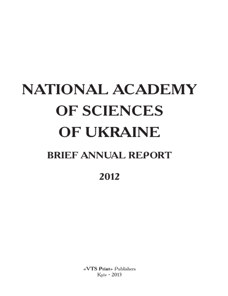 NATIONAL ACADEMY OF SCIENCES OF UKRAINE BRIEF ANNUAL REPORT 2012 «VTS Print» Publishers Kyiv • 2013 NAS of Ukraine 2012 Main Results B. E. Paton, President of the Academy In 2012, institutions of the National Academy of Sciences (NAS) of Ukraine carried out extensive fundamental and applied research and produced numerous promising developments in priority areas of science and technology. New results were obtained in many cutting-edge fields of mathematics, information science, mechanics, physics, astronomy and radio astronomy, Earth sciences, materials science, studies of physical-andtechnological problems of power engineering, in nuclear and radiation technologies, chemistry and biology. Institutions of socio-humanities research aimed their efforts at studying novel socio-economic, legal, spiritual, cultural and ideological transformations in Ukraine, the status and prospects of the Ukrainian society development. These results were used in drawing up numerous generalizing prognostic documents prepared for state authorities. Among them are the national report “National Strategy of Sustainable Human Development: Ensuring Equity”, the Concept of Ukraine’s Humanitarian Development till 2020. Last year, Academy’s scholars presented the results of their research work in nearly 800 academic books, 570 and 214 collected works included. Over 25 thousand research papers were published, 5,4 thousand of those – in leading specialized foreign journals. A large number of textbooks, reference and popular-science books were prepared for the education sphere – 470 books in total. I would like to draw your attention to the extension of NAS scientific expert functions and commissions we have witnessed recently. No doubt, this has had a positive effect on the quality and quantity of evaluations and forecasts, proposals and recommendations prepared by its specialists for governmental structures. In 2012, NAS institutions provided 1880 expert evaluations of legal acts and program documents on the assignments of and in the interests of various bodies of state power, as well as information-and-analytical materials on various aspects of socio-political, socio-economic, S&T and cultural progress of the nation. Of great importance for ensuring high scientific relevance of research are targeted NAS research programs. Today the Academy is implementing 19 integrative programs covering cutting-edge areas of fundamental and applied science, the interdisciplinary ones included. Over 20% of studies of NAS institutions are carried out under those programs, and the total share of targeted-program research in the Academy is as high as 43%. We were able to achieve such a significant proportion due to insistent purposeful work towards introducing advanced principles in research management, which has been done in the Academy for a long time. A system of various programs and competitions has been formed and is operating. Beside state-supported targeted R&D programs initiated by the NAS of Ukraine and all-Academy integrated programs that have already been mentioned, it also includes fundamental research programs of Academy departments, the competition of R&D (innovation) projects, joint competitions with foreign scientific centers and foundations. A lot of effort was given last year to establishing efficient co-operation with industrial ministries and agencies, large state and private companies in order to determine and jointly carry out high-priority tasks of technological renovation of Ukrainian enterprises. Specialists of the Academy and the Ministry of Coal Energy of Ukraine prepared a collaborative project “Renovation of Ukraine’s Energy Strategy out to 2030 in Electric Power Engineering”. A cooperation agreement between the National Academy of Sciences of Ukraine and the State Agency of Water Resources of Ukraine was concluded. Under this agreement, NAS specialists are to take part in the scientific back-up to improving the environmental status of surface water resources, developing land reclamation, centralized water supply of rural settlements, integrated flood-control measures etc. A NAS Presidium guest session was held at the ‘ANTONOV’ State Company. It determined areas of further co-operation, namely, introducing novel technologies in aircraft construction, studying advanced aviation materials, their practical application in Ukrainian aircraft industry, improving aircraft aerodynamic performances etc. The collaboration with the ‘Pivdenne’ State Design Office was furthered. A general contract on S&T co-operation in developing space vehicles was signed and research priorities were set. Among them are ballistics, aerodynamics, heat exchange, novel materials and technologies, general issues of prospective designing etc. Direct and efficient ties with private manufacturers were extended as well. The program of technological projects formed by a joint working group of Academy scientists and specialists of Donbas Fueland-Power Company could be cited as an example of those. The implementation of some projects has already been started. One should note that NAS of Ukraine has achieved significant R&D results, which are the basis for efficient collaboration with large enterprises. Last year 3900 business agreements were fulfilled; they focused on improving the engineering and technological parameters of manufacturing in various industries. The innovative activities of NAS scientists 3 NAS of Ukraine 2012 resulted in 825 patent applications and 722 patents received for inventions and utility models. In the year under review, Academy institutions concluded 86 license agreements and contracts both in Ukraine and abroad. Significant results were achieved in implementing the R&D (innovative) projects selected through competition. Yet, it should be admitted that the scope of R&D carried out under contracts with outside organizations and commercialization of novel developments do not correspond to our pot