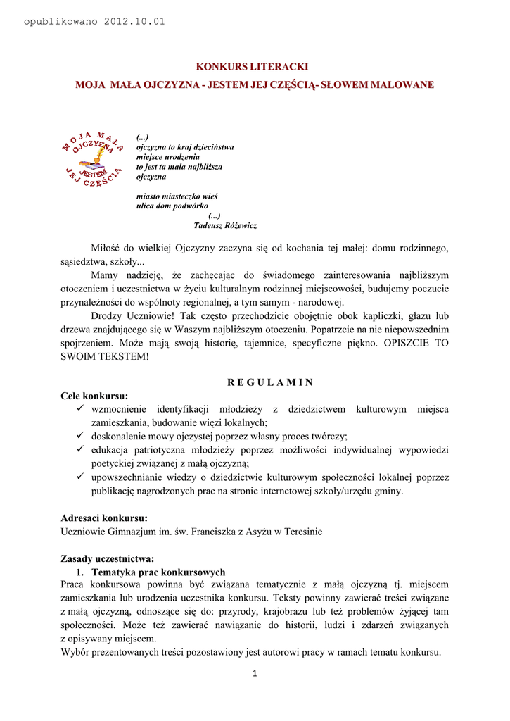 opublikowano 2012.10.01 KONKURS LITERACKI MOJA MAŁA OJCZYZNA - JESTEM JEJ CZĘŚCIĄ- SŁOWEM MALOWANE (...) ojczyzna to kraj dzieciństwa miejsce urodzenia to jest ta mała najbliższa ojczyzna miasto miasteczko wieś ulica dom podwórko (...) Tadeusz Różewicz Miłość do wielkiej Ojczyzny zaczyna się od kochania tej małej: domu rodzinnego, sąsiedztwa, szkoły... Mamy nadzieję, że zachęcając do świadomego zainteresowania najbliższym otoczeniem i uczestnictwa w życiu kulturalnym rodzinnej miejscowości, budujemy poczucie przynależności do wspólnoty regionalnej, a tym samym - narodowej. Drodzy Uczniowie! Tak często przechodzicie obojętnie obok kapliczki, głazu lub drzewa znajdującego się w Waszym najbliższym otoczeniu. Popatrzcie na nie niepowszednim spojrzeniem. Może mają swoją historię, tajemnice, specyficzne piękno. OPISZCIE TO SWOIM TEKSTEM! REGULAMIN Cele konkursu: wzmocnienie identyfikacji młodzieży z dziedzictwem kulturowym miejsca zamieszkania, budowanie więzi lokalnych; doskonalenie mowy ojczystej poprzez własny proces twórczy; edukacja patriotyczna młodzieży poprzez możliwości indywidualnej wypowiedzi poetyckiej związanej z małą ojczyzną; upowszechnianie wiedzy o dziedzictwie kulturowym społeczności lokalnej poprzez publikację nagrodzonych prac na stronie internetowej szkoły/urzędu gminy. Adresaci konkursu: Uczniowie Gimnazjum im. św. Franciszka z Asyżu w Teresinie Zasady uczestnictwa: 1. Tematyka prac konkursowych Praca konkursowa powinna być związana tematycznie z małą ojczyzną tj. miejscem zamieszkania lub urodzenia uczestnika konkursu. Teksty powinny zawierać treści związane z małą ojczyzną, odnoszące się do: przyrody, krajobrazu lub też problemów żyjącej tam społeczności. Może też zawierać nawiązanie do historii, ludzi i zdarzeń związanych z opisywany miejscem. Wybór prezentowanych treści pozostawiony jest autorowi pracy w ramach tematu konkursu. 1 2. Forma prac konkursowych Zainteresowani udziałem w konkursie powinni złożyć (do wyboru): - mała forma poetycka (1 – 2 wiersze); - reportaż- żywy opis zdarzeń i faktów aktualnych lub z przeszłości (społecznych, obyczajowych, przyrodniczych) w atrakcyjnej formie prasowej; -fotoreportaż - 4-6 zdjęć opatrzonych kilkuzdaniowym tekstem, tworzących jednorodny temat; - felieton - opis zdarzenia, zjawiska, osoby, lub instytucji; Prace muszą być w całości samodzielne (obowiązuje ustawa o prawach autorskich Dz.U. z 23.02.1994 r. Nr 24 poz.83 art. 115). Każdy tekst należy podpisać: - w prawym górnym rogu - pseudonim autora. Do pracy należy dołączyć zaklejoną kopertę opatrzoną takim samym godłem (pseudonimem), zawierającą dane personalne (imię, nazwisko, wiek, klasa oraz imię i nazwisko opiekuna ucznia, a także oświadczenie o wyrażeniu zgody na wykorzystanie danych osobowych na potrzeby promocji (ustawa z dn. 29.08.1997 r. o ochronie danych osobowych Dz. U. Nr 1334 poz. 883) - podpisane przez rodzica lub opiekuna). Praca nie może zawierać żadnej informacji identyfikującej jej autora. Organizatorzy zastrzegają sobie prawo do udostępnienia publikacji mediom i umieszczenia ich na stronie internetowej szkoły. Organizator nie zwraca prac nadesłanych na konkurs, ani nie informuje o ich niedopuszczeniu z powodów regulaminowych. 3. Kryteria oceniania prac konkursowych: - twórczy charakter utworów, - poprawność stylistyczna i językowa, - propagowanie idei „małych ojczyzn”. Termin składania prac : 28 luty 2013 roku (do p. Tomasza Daczko, sala nr 9). Najlepsze prace uhonorowane zostaną nagrodami – złotymi, srebrnymi i brązowymi piórami. Prace oceniać będzie jury składające się z nauczycieli polonistów uczących w szkole. Uroczyste podsumowanie konkursu, połączone z wręczeniem nagród, przewidziane jest podczas Finału Tygodnia Kultury Humanistycznej w marcu 2013 r. 2