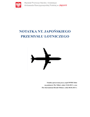 NOTATKA NT. JAPOŃSKIEGO PRZEMYSŁU LOTNICZEGO Notatka opracowana przez zespół WPHI Tokio na podstawie The Nikkei z dnia 15.04.2013 r. oraz The International Herald Tribune z dnia 08.04.2013 r. SPIS TREŚCI KAWASAKI HEAVY INDUSTRIES ....................................................................................... 3 AEROBOTY ........................................................................................................................... 4 KAWASAKI HEAVY INDUSTRIES 26 marca firma Kawasaki Heavy Industries Ltd. dostarczyła dla Japońskiego Ministerstwa Obrony dwa samoloty zwiadowcze P-1, które są w stanie wykrywać obecność łodzi podwodnych i innych obiektów. Jest to pierwszy wojskowy samolot zwiadowczy, który został wyprodukowany w Japonii od czasów II wojny światowej. Prezes Kawasaki Heavy Industries Ltd., Satoshi Hasegawa był obecny podczas ceremonii przekazania pierwszego samolotu. W trakcie przemowy podkreślił, że większość części samolotu zostało zbudowanych przez japońskie firmy. W produkcję P-1 zaangażowanych jest 2 000 japońskich przedsiębiorstw. Współproducenci samolotu mają nadzieję, że rząd premiera Abe wprowadzi zapowiadane zmiany w japońskim prawie, które pozwolą na sprzedaż P-1 za granicę. Japońskie firmy produkujące części do samolotów wojskowych doznały dużego uszczerbku, ze względu na zmniejszone zamówienia na japoński myśliwiec wielozadaniowy F-2 (samolot bojowy opracowany przez Mitsubishi przy współpracy z Lockheed Martin, którego podstawowa konstrukcja wzorowana jest na amerykańskim F-16) w 2011 r. Również problemem pozostaje chęć włączenia się przez Japońskie Ministerstwo Obrony do projektu F-35, które zamierza uczynić amerykański myśliwiec typu stealth głównym myśliwcem japońskich sił powietrznych. Jednak wciąż nie wiadomo, które części F-35 miałyby być budowane przez japońskie firmy. Dla japońskiego sektora zbrojeniowego zakaz eksportowania swoich produktów za granicę był głównym problemem dla rozwinięcia podstawowej produkcji. Ze względu na to, ich produkcja zawsze ograniczała się do kilku modeli myśliwców wojskowych, które były wykorzystywane przez Siły Samoobrony. W przypadku P-1 zamówienia ograniczają się jedynie do 8 egzemplarzy. Tak długo, dopóki nie będzie możliwa sprzedaż japońskiego uzbrojenia za granicę, przewiduje się wyprodukowanie jedynie 70 sztuk samolotu. W prasie można znaleźć informację, że japońskie firmy zbrojeniowe nie będą w stanie w takiej sytuacji utrzymać swoich możliwości technologicznych na wysokim poziomie. Jeżeli firmy zbrojeniowe zaczną wycofywać się z produkcji części do samolotów wojskowych, Ministerstwo Obrony może mieć problem z zaopatrzeniem dla już używanych przez Japońskie Siły Samoobrony myśliwców. Sytuacja ta stanowi poważne zagrożenie dla bezpieczeństwa Japonii. Dodatkowy problem dla japońskich firm stanowi prawo międzynarodowe. W kwietniu ONZ zaadoptował pierwsze Porozumienie nt. Handlu Bronią (Arms Trade Treaty), które ma wprowadzić duże utrudnienia dla handlu bronią jakiegokolwiek rodzaju. Pod koniec roku fiskalnego 2014 Kawasaki Heavy Indsutries Ltd. zamierza zacząć dostarczać samoloty transportowe C-2 dla Japońskich Sił Samoobrony (łącznie zamierza dostarczyć 40 samolotów). Według przedstawiciela Kawasaki Heavy Industries Ltd. gdyby możliwe było dostarczanie samolotu klientom zagranicznym, sprzedaż mogłaby wzrosnąć do 200, a nawet 300 sztuk. Według podobnego schematu, możliwe byłoby zwiększenie produkcji P-1. W celu sprzedaży samolotu za granicę, Japońskie Ministerstwo Obrony oraz Kawasaki Heavy Industries Ltd. postanowiło zaadoptować morski samolot zwiadowczy do spełniania funkcji samolotu cywilnego. Samolot pasażerski zbudowany na bazie P-1 mógłby zabierać na pokład od 120 do 130 pasażerów (więcej niż MRJ produkcji Mitsubishi, który będzie mógł zabrać od 70 do 90 pasażerów). Byłby mniejszy od Boeinga 737 oraz A320 produkcji Airbus SAS (działu firmy European Aeronautic defense and Space Co.). Istnieją wątpliwości, czy taki samolot cywilny przyciągnąłby uwagę zagranicznych linii lotniczych, co sprawia, że inwestowanie w modyfikowanie go jest zadaniem ryzykownym. Modyfikacja taka wymagałaby również wprowadzenie znancznych zmian w wewnętrznym projekcie samolotu i zastąpienie aparatury wojskowej wyposażeniem dla pasażerów oraz uzyskania dla niego dodatkowego certyfikatu (na sprzedaż samolotu wojskowego przebudowanego dla celów cywilnych). Oznacza to również konieczność zmian w projecie samolotu w ten sposób, aby był w stanie spełniać zarówno cele wojskowe, jak i cywilne (będzie musiał spełniać wymogi komfortu i bezpieczeństwa dla pasażerów). AEROBOTY W związku z szybkim rozwojem w dziedzinie IT oraz miniaturyzacji silników, japońskie firmy opracowują technologię małych, latających robotów, które mogłyby zastąpić ludzi przy wykonywaniu zadań związanych z np.: obserwacją warunków drogowych, prowadzeniem rozpoznania przy awariach w zakładach chemicznych (gdzie wysłanie ratowników wiązałoby się z zagrożeniem życia) i badań konstrukcyjnych w miejscach o trudnej dostępności dla człowieka (jak np. tamy) itp. Dzięki rozwojowi informatyki, przy pomocy danych geograficznych aerboty są w stanie nawigować w przestrzeni powietrznej bez nadzoru użytkownika. Model aerobota opracowywanego w Uniwersytecie w Chiba jest długości 80 centymetrów. Jego kadłub waży 2 kilogramy i jest w stanie udźwignąć sprzęt i kamery ważące do 10 kilogramów. Jeden aerobot jest w stanie latać przez kilkadziesiąt minut, po czym jego baterie powinny zostać ponownie naładowane. Doktor Kenzo Nonami, z Uniwersytetu w Chiba uważa, że technologia aerobotów może być również wykorzystywana przy opracowywaniu dokładnych map urbanistycznych, inspekcji tam. Wstępnie, aeroboty miały ułatwi