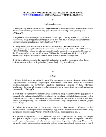 REGULAMIN KORZYSTANIA ZE STRONY INTERNETOWEJ WWW.MEDIPE.COM OBOWIĄZUJĄCY OD DNIA 01.03.2016 §1 Informacje ogólne 1. Niniejszy regulamin (zwany dalej: „Regulaminem”) normuje zasady i warunki korzystania Ze strony internetowej zlokalizowanej pod adresem: www.medipe.com (zwanej dalej: „Witryną”). 2. Regulamin został wydany na podstawie art. 8 ust. 1 pkt 1 ustawy z dnia 18.07.2002r. o świadczeniu usług drogą elektroniczną (Dz.U. nr 144 poz. 1204 ze zm.) i jest udostępniany Użytkownikom nieodpłatnie za pośrednictwem Witryny. 3. Usługodawcą jest Administrator Witryny (zwany dalej: „Administratorem” lub „Usługodawcą”) tj. spółka Medipe Polska, adres: ul. Strzegomska 236A, 54-432 Wrocław, NIP 8943049030, wpisana do rejestru przedsiębiorców prowadzonego przez Sąd Rejonowy dla Wrocławia-Fabrycznej we Wrocławiu, VI Wydział Gospodarczy KRS, pod nr KRS 0000479553, kapitał zakładowy 5000 zł, adres e-mail: [email protected] 4. Użytkownikiem jest osoba fizyczna, która akceptuje warunki świadczenia usług drogą elektroniczną określone w Regulaminie (zwana dalej: „Użytkownikiem”). §2 Usługa 1. Usługa świadczona za pośrednictwem Witryny obejmuje swym zakresem udostępnianie Użytkownikowi informacji dotyczących zatrudnienia oraz ofert pracy w charakterze opiekuna/opiekunki na terytorium Republiki Federalnej Niemiec, w tym informacji handlowych dotyczących zatrudnienia lub pośrednictwa w zatrudnieniu przez Administratora (zwana dalej: "Usługą"). 2. Wszelkie udostępniane w ramach Usługi informacje mają charakter jedynie poglądowy, w szczególności na ich podstawie Użytkownikowi nie przysługuje jakiekolwiek roszczenie wobec Administratora o zawarcie umowy o pracę czy zapewnienie zatrudnienia w jakiejkolwiek innej formie cywilnoprawnej, jak również o świadczenie usług związanych z kursem języka niemieckiego. 3. Usługa świadczona jest od momentu połączenia Użytkownika z Witryną, co jest równoznaczne z zaakceptowaniem niniejszego regulaminu. Zaprzestanie świadczenia Usługi następuje z opuszczeniem Witryny przez Użytkownika, z zastrzeżeniem ust. 4. 4. W przypadku wyrażenia przez Użytkownika zgody na otrzymywanie informacji handlowych oraz podania swych danych osobowych, Usługa obejmuje również przesyłanie informacji handlowych dotyczących zatrudnienia na terytorium Republiki Federalnej Niemiec. W przypadku takim zaprzestanie świadczenia Usługi, poza przesłankami wskazanymi w ust. 3 powyżej, następuje z chwilą cofnięcia zgody na otrzymywanie informacji handlowych przez Użytkownika. §3 Wymagania techniczne 1. Warunkiem korzystania z Witryny jest posiadanie przez Użytkownika urządzenia końcowego (komputera, tabletu, smatphone'a etc.) połączonego z siecią internet oraz przeglądarki internetowej umożliwiającej wyświetlanie na ekranie komputera dokumentów hipertekstowych (HTML) oraz PHP, powiązanych w sieci Internet przez usługę sieciową z włączonym wykonywaniem Java Script oraz zapisywaniem Cookies. 2. Korzystanie z Witryny możliwe jest bez ograniczeń terytorialnych. 3. Administrator nie ponosi odpowiedzialności za utrudnienia w korzystaniu z usługi wynikające z niespełnienia wymagań technicznych wskazanych w ust. 1, w tym z błędnej konfiguracji oprogramowania lub sprzętu Użytkownika, bądź wynikające z problemów ze sprzętem lub łączem internetowym Użytkownika. §4 Uwagi na temat funkcjonowania serwisu 1. Uwagi składane przez Użytkownika w związku z nienależytym działaniem Witryny powinny być przesłane pocztą elektroniczną na adres mailowy podany w na stronie głównej w zakładce „Kontakt” w ciągu 14 dni od dnia wystąpienia zdarzenia uzasadniającego takie zgłoszenie. Odpowiedź zostanie udzielona w terminie 14 dni od daty otrzymania pisemnego zgłoszenia, w formie, w jakiej Administrator Witryny otrzymał zgłoszenie, na adres podany w zgłoszeniu. 2. W szczególnych przypadkach, tj. gdy rozpatrzenie zgłoszenia wymaga nietypowych, szczególnych działań i ustaleń ze strony Administratora lub napotka obiektywne przeszkody niezależne i niezawinione przez Usługodawcę, termin rozpoznania zgłoszenia może ulec wydłużeniu, jednakże nie dłużej niż o 14 dni. W sytuacji, w której do rozpatrzenia zgłoszenia niezbędne jest uzyskanie od Użytkownika dodatkowych wyjaśnień, termin na ustosunkowanie się do zgłoszenia ulega dodatkowo przedłużeniu o czas udzielania wyjaśnień przez Użytkownika. 3. Witryna udostępnia Użytkownikowi oficjalne informacje dotyczące zakresu działalności Usługodawcy oraz funkcjonalność w formie formularzy elektronicznych mających na celu dobrowolne pozostawienie przez Użytkownika podstawowych danych kontaktowych, które Usługodawca wykorzysta do nawiązania kontaktu w formie elektronicznej lub poprzez polaczenie głosowe z Użytkownikiem. 4. Pod pojęciem podstawowe dane kontaktowe rozumie się dane osobowe takie jak imię oraz nazwisko Użytkownika, dodatkowo zbierane są także takie informacje jak numer telefonu kontaktowego lub/i adres poczty elektronicznej. W niektórych przypadkach Użytkownik może zostać poproszony o dobrowolne określenie regionu poprzez wybór województwa, na którego podstawie Usługodawca określi odpowiedzialna komórkę w strukturze działalności Usługodawcy za kontakt z Użytkownikiem. 5. Użytkownik podaje swoje dane dobrowolnie i poprzez kontakt z Usługodawcą ma prawo do edycji swoich danych lub usunięcia ich i zaniechania dalszego kontaktu od strony Usługodawcy. 6. Zakazane jest podawanie przez Użytkownika danych osobowych innej osoby. 7. Użytkownik powinien użytkować Witrynę zgodnie z jej przeznaczeniem. Wszelkie działania Użytkownika mające wpływ na pogorszenie działania Witryny, nieautoryzowany dostęp do Witryny, generowanie zbędnego ruchu w Witrynie są zabronione. Nieprawidłowe wykorzystanie Witryny odnosi się również do użytkowania w sposób niezgodn