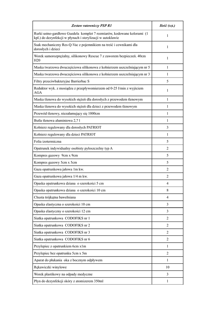 Zestaw ratowniczy PSP R1 Ilość (szt.) Rurki ustno-gardłowe Guedela komplet 7 rozmiarów, kodowane kolorami (1 kpl.) do dezynfekcji w płynach i sterylizacji w autoklawie 1 Ssak mechaniczny Res-Q-Vac z pojemnikiem na treść i cewnikami dla dorosłych i dzieci 1 Worek samorozprężalny, silikonowy Rescue 7 z zaworem bezpieczeń. 40cm H20 1 Maska twarzowa dwuczęściowa silikonowa z kołnierzem uszczelniającym nr 5 1 Maska twarzowa dwuczęściowa silikonowa z kołnierzem uszczelniającym nr 3 1 Filtry przeciwbakteryjne Barrierbac S 5 Reduktor wyk. z mosiądzu z przepływomierzem od 0-25 l/min z wyjściem AGA 1 Maska tlenowa do wysokich stężeń dla dorosłych z przewodem tlenowym 1 Maska tlenowa do wysokich stężeń dla dzieci z przewodem tlenowym 1 Przewód tlenowy, niezałamujący się 1000cm 1 Butla tlenowa aluminiowa 2,7 l 1 Kołnierz regulowany dla dorosłych PATRIOT 3 Kołnierz regulowany dla dzieci PATRIOT 1 Folia izotermiczna 5 Opatrunek indywidualny osobisty pyłoszczelny typ A 2 Kompres gazowy 9cm x 9cm 5 Kompres gazowy 5cm x 5cm 5 Gaza opatrunkowa jałowa 1m kw. 2 Gaza opatrunkowa jałowa 1/4 m kw. 2 Opaska opatrunkowa dziana o szerokości 5 cm 4 Opaska opatrunkowa dziana o szerokości 10 cm 8 Chusta trójkątna bawełniana 4 Opaska elastyczna o szerokości 10 cm 3 Opaska elastyczny o szerokości 12 cm 3 Siatka opatrunkowa CODOFIKS nr 1 2 Siatka opatrunkowa CODOFIKS nr 2 2 Siatka opatrunkowa CODOFIKS nr 3 2 Siatka opatrunkowa CODOFIKS nr 6 2 Przylepiec z opatrunkiem 6cm x1m 1 Przylepiec bez opatrunku 5cm x 5m 2 Aparat do płukania oka z bocznym odpływem 1 Rękawiczki winylowe 10 Worek plastikowy na odpady medyczne 3 Płyn do dezynfekcji skóry z atomizerem 350ml 1 Nożyczki ratownicze 1 Młotek dwufunkcyjny ratowniczy z nożem do cięcia pasów i ze zbijakiem do szyb 1 Folia do przykrycia zwłok 3 Opakowanie: torba transportowa 1 Szyny Kramera (1 kpl.= 14 szt.) w powleczeniu w torbie transportowej 1 Deska ortopedyczna Iron Duck Ultra Vue 18 1 Pasy do deski ortopedycznej 4 szt, kodowane kolorami, mocowanie karabinkowe 1 Stabilizator głowy klockowy - czerwony 1 Opatrunek hydrożelowy na twarz 25cm x 25cm Aqua Gel 2 Opatrunek hydrożelowy 20cm x 40cm Aqua Gel 8 Opatrunek hydrożelowy 10cm x 12cm Aqua Gel 1