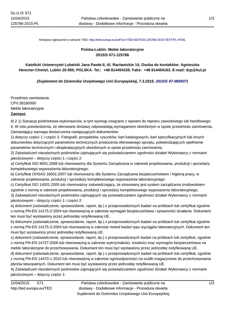 Dz.U./S S71 11/04/2015 125786-2015-PL Państwa członkowskie - Zamówienie publiczne na dostawy - Dodatkowe informacje - Procedura otwarta 1/3 Niniejsze ogłoszenie w witrynie TED: http://ted.europa.eu/udl?uri=TED:NOTICE:125786-2015:TEXT:PL:HTML Polska-Lublin: Meble laboratoryjne 2015/S 071-125786 Katolicki Uniwersytet Lubelski Jana Pawła II, Al. Racławickie 14, Osoba do kontaktów: Agnieszka Hencner-Chmiel, Lublin 20-950, POLSKA. Tel.: +48 814454159. Faks: +48 814454163. E-mail: [email protected] (Suplement do Dziennika Urzędowego Unii Europejskiej, 7.3.2015, 2015/S 47-080937) Przedmiot zamówienia: CPV:39180000 Meble laboratoryjne Zamiast: III.2.1) Sytuacja podmiotowa wykonawców, w tym wymogi związane z wpisem do rejestru zawodowego lub handlowego: 4. W celu potwierdzenia, że oferowane dostawy odpowiadają wymaganiom określonym w opisie przedmiotu zamówienia, Zamawiający wymaga dostarczenia następujących dokumentów: 1) dotyczy części 1 i części 2: Fotografii, prospektów, rysunków, kart katalogowych, kart specyfikacyjnych lub innych dokumentów dotyczących parametrów technicznych producenta oferowanego sprzętu, potwierdzających spełnienie parametrów technicznych i eksploatacyjnych określonych w opisie przedmiotu zamówienia. 2) Zaświadczeń niezależnych podmiotów zajmujących się poświadczaniem zgodności działań Wykonawcy z normami jakościowymi – dotyczy części 1 i części 2: a) Certyfikat ISO 9001:2008 lub równoważny dla Systemu Zarządzania w zakresie projektowania, produkcji i sprzedaży kompleksowego wyposażenia laboratoryjnego; b) Certyfikat OHSAS 18001:2007 lub równoważny dla Systemu Zarządzania bezpieczeństwem i higieną pracy, w zakresie projektowania, produkcji i sprzedaży kompleksowego wyposażenia laboratoryjnego; c) Certyfikat ISO 14001:2005 lub równoważny zaświadczający, że stosowany jest system zarządzania środowiskiem zgodnie z normą w zakresie projektowania, produkcji i sprzedaży kompleksowego wyposażenia laboratoryjnego; 3) Zaświadczeń niezależnych podmiotów zajmujących się poświadczaniem zgodności działań Wykonawcy z normami jakościowymi – dotyczy części 1 i części 2: a) dokument (zaświadczenie, sprawozdanie, raport, itp.) z przeprowadzonych badań na próbkach lub certyfikat zgodnie z normą PN-EN 14175-2:2004 lub równoważną w zakresie wymagań bezpieczeństwa i sprawności działania. Dokument ten musi być wystawiony przez jednostkę notyfikowaną UE. b) dokument (zaświadczenie, sprawozdanie, raport, itp.) z przeprowadzonych badań na próbkach lub certyfikat zgodnie z normą PN-EN 14175-3:2004 lub równoważną w zakresie metod badań typu wyciągów laboratoryjnych. Dokument ten musi być wystawiony przez jednostkę notyfikowaną UE. c) dokument (zaświadczenie, sprawozdanie, raport, itp.) z przeprowadzonych badań na próbkach lub certyfikat, zgodnie z normą PN-EN 14727:2006 lub równoważną w zakresie wytrzymałości, trwałości oraz wymogów bezpieczeństwa na meble laboratoryjne do przechowywania. Dokument ten musi być wystawiony przez jednostkę notyfikowaną UE. d) dokument (zaświadczenie, sprawozdanie, raport, itp.) z przeprowadzonych badań na próbkach lub certyfikat, zgodnie z normą PN-EN 14470-1:2010 lub równoważną w zakresie ognioodporności na szafki magazynowe do przechowywania płynów łatwopalnych. Dokument ten musi być wystawiony przez jednostkę notyfikowaną UE. 4) Zaświadczeń niezależnych podmiotów zajmujących się poświadczaniem zgodności działań Wykonawcy z normami jakościowymi – dotyczy części 1: 11/04/2015 S71 http://ted.europa.eu/TED Państwa członkowskie - Zamówienie publiczne na dostawy - Dodatkowe informacje - Procedura otwarta Suplement do Dziennika Urzędowego Unii Europejskiej 1/3 Dz.U./S S71 11/04/2015 125786-2015-PL Państwa członkowskie - Zamówienie publiczne na dostawy - Dodatkowe informacje - Procedura otwarta 2/3 a) dokument (zaświadczenie, sprawozdanie, raport, itp.) z przeprowadzonych badań na próbkach lub certyfikat, zgodnie z normą PN-EN ISO 10545-9:1998 lub równoważną w zakresie odporności termicznej. Dokument ten musi być wystawiony przez jednostkę notyfikowaną UE; b) dokument (zaświadczenie, sprawozdanie, raport, itp.) z przeprowadzonych badań na próbkach lub certyfikat, zgodnie z normą PN-EN ISO 10545-13:1999 lub równoważną w zakresie odporności chemicznej. Dokument ten musi być wystawiony przez jednostkę notyfikowaną UE; c) dokument (zaświadczenie, sprawozdanie, raport, itp.) z przeprowadzonych badań na próbkach lub certyfikat, zgodnie z normą PN-EN ISO 10545-14:1999 lub równoważną w zakresie odporności na plamienie. Dokument ten musi być wystawiony przez jednostkę notyfikowaną UE; d) dokument (zaświadczenie, sprawozdanie, raport, itp.) z przeprowadzonych badań na próbkach lub certyfikat, zgodnie z normą PN-EN ISO 10545-15:1999 lub równoważną w zakresie zawartości uwalnianego ołowiu i kadmu. Dokument ten musi być wystawiony przez jednostkę notyfikowaną UE; e) dokument (zaświadczenie, sprawozdanie, raport, itp.) z przeprowadzonych badań na próbkach lub certyfikat, zgodnie z normą PN-EN ISO 10545-3:1999 lub równoważną w zakresie nasiąkliwości wodnej; f) dokument (zaświadczenie, sprawozdanie, raport, itp.) z przeprowadzonych badań na próbkach lub certyfikat, zgodnie z normą PN-EN ISO 10545-7:2000 lub równoważną w zakresie odporność na przetarcie powierzchni. 5) Zaświadczeń niezależnych podmiotów zajmujących się poświadczaniem zgodności działań Wykonawcy z normami jakościowymi – dotyczy części 2: a) atesty higieniczne lub równoważne wydane przez Państwowy Zakład Higieny lub niezależny instytut badawczy na armaturę laboratoryjną, na płyty z ceramiki litej wielkogabarytową oraz na blaty z ceramiki monolitycznej. b) świadectwo z zakresu higieny radiacyjnej lub równoważne wydane przez Państwowy Zakład Higieny lub niezależny insty