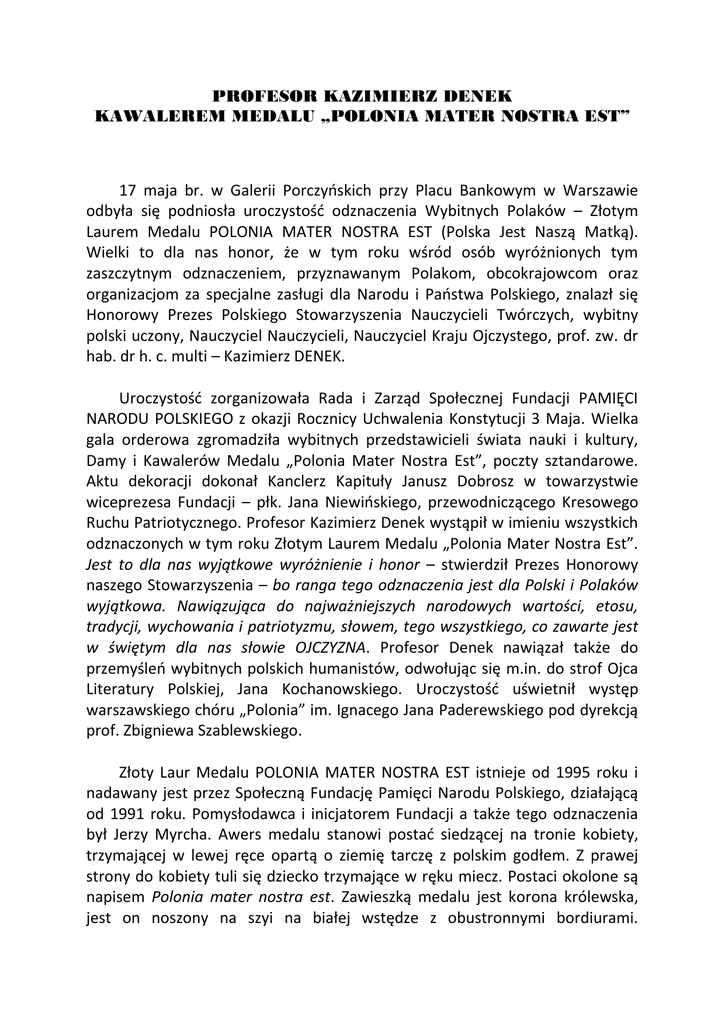 PROFESOR KAZIMIERZ DENEK KAWALEREM MEDALU „POLONIA MATER NOSTRA EST” 17 maja br. w Galerii Porczyńskich przy Placu Bankowym w Warszawie odbyła się podniosła uroczystość odznaczenia Wybitnych Polaków – Złotym Laurem Medalu POLONIA MATER NOSTRA EST (Polska Jest Naszą Matką). Wielki to dla nas honor, że w tym roku wśród osób wyróżnionych tym zaszczytnym odznaczeniem, przyznawanym Polakom, obcokrajowcom oraz organizacjom za specjalne zasługi dla Narodu i Państwa Polskiego, znalazł się Honorowy Prezes Polskiego Stowarzyszenia Nauczycieli Twórczych, wybitny polski uczony, Nauczyciel Nauczycieli, Nauczyciel Kraju Ojczystego, prof. zw. dr hab. dr h. c. multi – Kazimierz DENEK. Uroczystość zorganizowała Rada i Zarząd Społecznej Fundacji PAMIĘCI NARODU POLSKIEGO z okazji Rocznicy Uchwalenia Konstytucji 3 Maja. Wielka gala orderowa zgromadziła wybitnych przedstawicieli świata nauki i kultury, Damy i Kawalerów Medalu „Polonia Mater Nostra Est”, poczty sztandarowe. Aktu dekoracji dokonał Kanclerz Kapituły Janusz Dobrosz w towarzystwie wiceprezesa Fundacji – płk. Jana Niewińskiego, przewodniczącego Kresowego Ruchu Patriotycznego. Profesor Kazimierz Denek wystąpił w imieniu wszystkich odznaczonych w tym roku Złotym Laurem Medalu „Polonia Mater Nostra Est”. Jest to dla nas wyjątkowe wyróżnienie i honor – stwierdził Prezes Honorowy naszego Stowarzyszenia – bo ranga tego odznaczenia jest dla Polski i Polaków wyjątkowa. Nawiązująca do najważniejszych narodowych wartości, etosu, tradycji, wychowania i patriotyzmu, słowem, tego wszystkiego, co zawarte jest w świętym dla nas słowie OJCZYZNA. Profesor Denek nawiązał także do przemyśleń wybitnych polskich humanistów, odwołując się m.in. do strof Ojca Literatury Polskiej, Jana Kochanowskiego. Uroczystość uświetnił występ warszawskiego chóru „Polonia” im. Ignacego Jana Paderewskiego pod dyrekcją prof. Zbigniewa Szablewskiego. Złoty Laur Medalu POLONIA MATER NOSTRA EST istnieje od 1995 roku i nadawany jest przez Społeczną Fundację Pamięci Narodu Polskiego, działającą od 1991 roku. Pomysłodawca i inicjatorem Fundacji a także tego odznaczenia był Jerzy Myrcha. Awers medalu stanowi postać siedzącej na tronie kobiety, trzymającej w lewej ręce opartą o ziemię tarczę z polskim godłem. Z prawej strony do kobiety tuli się dziecko trzymające w ręku miecz. Postaci okolone są napisem Polonia mater nostra est. Zawieszką medalu jest korona królewska, jest on noszony na szyi na białej wstędze z obustronnymi bordiurami. Odznaczeni posiadają własny hymn – Polonia, Polonia, Polonia/Mater nostra est, autorstwa Jerzego Myrchy. Uroczystości nadawania medalu odbywają się przemiennie w Sali Kolumnowej warszawskiego Zamku Królewskiego oraz w Galerii Porczyńskich. Wśród osób wyróżnionych tym szczególnym, niezwykle patriotycznym odznaczeniem są m.in. Janina i Zbigniew Porczyńscy, prezydent RP Ryszard Kaczorowski, ks. poeta Jan Twardowski, legendarny pilot, as myśliwski okresu II wojny światowej gen. Stanisław Skalski, prof. Stefan Stuligrosz, Wojciech Dzieduszycki, Wiktor Zinn, brytyjski historyk, kawaler Orderu Orla Białego Norman Davies. Panie Profesorze – w tak uroczystym dniu i z okazji tak wyjątkowej okoliczności, proszę przyjąć najserdeczniejsze gratulacje i życzenia od członków i sympatyków Polskiego Stowarzyszenia Nauczycieli Twórczych. To dla nas wielki honor i zaszczyt, wpisujący się Złotymi Zgłoskami w tegoroczne obchody X-lecia działalności naszego Stowarzyszenia. Dziękujemy, jesteśmy dumni i czujemy się ogromnie zaszczyceni. Bogdan Urbanek Rzecznik prasowy PSNT