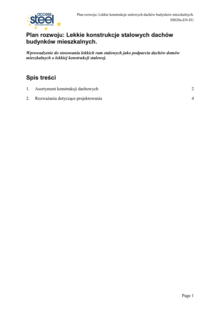 Plan rozwoju: Lekkie konstrukcje stalowych dachów budynków mieszkalnych. SS028a-EN-EU Plan rozwoju: Lekkie konstrukcje stalowych dachów budynków mieszkalnych. Wprowadzenie do stosowania lekkich ram stalowych jako podparcia dachów domów mieszkalnych o lekkiej konstrukcji stalowej. Spis treści 1. Asortyment konstrukcji dachowych 2 2. RozwaŜania dotyczące projektowania 4 Page 1 Plan rozwoju: Lekkie konstrukcje stalowych dachów budynków mieszkalnych. SS028a-EN-EU 1. Asortyment konstrukcji dachowych Lekki szkielet stalowy moŜe być stosowany do tworzenia większości rodzajów konstrukcji dachowych, w tym: Pochyłe dachy, kształtowane z lekkich stalowych kratownic, jak przedstawiono na Rys. 1.1, które obejmują całe domy. Bardziej złoŜone kratownice pozwalają na umieszczanie pomieszczeń mieszkalnych w obrębie dachu. Płaskie lub jednospadowe dachy zawierające lekkie belki lub kratownice, podobnie jak w konstrukcjach stropowych o większych rozpiętościach. Zakrzywione dachy, składające się z segmentów o lekkiej konstrukcji stalowej, jak pokazano na Rys. 1.2, lub przy uŜyciu elementów gorąco walcowanych. „Rama typu A” albo konstrukcje typu „stodoła duńska” (Dutch barn), jak pokazuje Rys. 1.3), gdzie konstrukcja dachu tworzy podstawową (główną) przestrzeń mieszkalną. Dachy pochylone jedno i wielopłaszczyznowe dachy, podobne do rozwiązań typowych dla konstrukcji drewnianych. Rys. 1.4 przedstawiają dach zbudowany metodą „montaŜu z drobnych elementów”. Te przykłady konstrukcji dachowych są zilustrowane poniŜej. Rys. 1.1 Typowa stalowa lekka konstrukcja kratownicowa- jest to potrzebne dla rozwoju lekkich kratownic stalowych znaczących rozpiętości.(Przykład: zdjęcie po prawej-Lindab profil AB). Page 2 Plan rozwoju: Lekkie konstrukcje stalowych dachów budynków mieszkalnych. SS028a-EN-EU Rys. 1.2 Segmentowy szkielet odwrotnie zakrzywionego dachu. Rys. 1.3 Dach typu „Rama A” – konstrukcja dachu mieści trzy kondygnacje mieszkalne. Page 3 Plan rozwoju: Lekkie konstrukcje stalowych dachów budynków mieszkalnych. SS028a-EN-EU Rys. 1.4 2. Konstrukcja dachowa zbudowana metodą „montaŜu z drobnych elementów” RozwaŜania dotyczące projektowania Tam gdzie jest to moŜliwe, wszystkie elementy nośne dachu powinny być rozmieszczone współosiowo ze słupkami podpierających dach ścian. Tam gdzie nie jest to moŜliwe, belki wieńczące ściany mogą umoŜliwić podparcie elementów szkieletu dachu pomiędzy słupkami ścian, co daje większą elastyczność przy projektowaniu. Jakikolwiek by nie był kształt dachu, to kluczowym zagadnieniem przy projektowaniu jest osiągnięcie właściwej izolacyjności termicznej. MoŜe to przyjąć formę „zimnej” konstrukcji dachu, w której przestrzeń pod dachem jest nieogrzewana, lub częściej konstrukcja „ciepła”. Tutaj izolacja jest na zewnętrz szkieletu stalowego, i projekt musi zapewnić brak wykraplania się pary wodnej na elementach stalowych. Jest to szczególnie istotne, gdy poddasze jest uŜytkowane. Innym atutem lekkich stalowych dachów jest niska waga dająca moŜliwość scalania poszczególnych elementów dachu w poziomie terenu, co daje lepsze warunki pracy, a następnie przeniesienia dachu na miejsce docelowe. Page 4 Plan rozwoju: Lekkie konstrukcje stalowych dachów budynków mieszkalnych. SS028a-EN-EU Rys. 2.1 Scalona część dachu podczas podnoszenia (Źródło: Lindab Profil AB). Page 5 Plan rozwoju: Lekkie konstrukcje stalowych dachów budynków mieszkalnych. SS028a-EN-EU Protokół jakości TYTUŁ ZASOBU Sposób zastosowania: Lekkie konstrukcje stalowych dachów budynków mieszkalnych. Odniesienie DOKUMENT ORYGINALNY Imię i nazwisko Instytucja Data Stworzony przez J Baker SCI Zawartość techniczna sprawdzona przez G W Owens SCI Zawartość redakcyjna sprawdzona przez R M Lawson SCI 20.01.06 1. WIELKA BRYTANIA G W Owens SCI 18/4/06 2. Francja A Bureau CTICM 18/4/06 3. Szwecja B Uppfeldt SBI 11/4/06 4. Niemcy C Müller RWTH 18/4/06 5. Hiszpania J Chica Labein 18/4/06 G W Owens SCI 13/7/06 Zawartość techniczna zaaprobowana przez: Zasób zatwierdzony przez Koordynatora Technicznego TŁUMACZENIE DOKUMENTU Tłumaczenie wykonał i sprawdził: Tłumaczenie zatwierdzone przez: B. Stankiewicz, PRz B. Stankiewicz PRz Page 6 Plan rozwoju: Lekkie konstrukcje stalowych dachów budynków mieszkalnych. SS028a-EN-EU Informacja ramowa Tytuł* Sposób zastosowania: Lekkie konstrukcje stalowych dachów budynków mieszkalnych. Seria Opis* Wprowadzenie do stosowania lekkich ram stalowych jako podparcia dachów domów mieszkalnych o lekkiej konstrukcji stalowej. Poziom dostępu* Umiejętności specjalistyczne Profesjonalista Identyfikator* Nazwa pliku D:\ACCESS_STEEL_PL\SS\SS028a-PL-EU.doc Format Kategoria* Microsoft Word 9.0; 8 Pages; 1207kb; Typ zasobu Plan rozwoju Punkt widzenia Architekt, InŜynier Temat* Obszar stosowania Budynki mieszkalne Daty Data utworzenia 19/05/2009 Data ostatniej modyfikacji Data sprawdzenia WaŜny od WaŜny do Język(i)* Kontakt Polski Autor J Baker, SCI Sprawdził G W Owens, SCI Zatwierdził Redaktor Ostatnia modyfikacja Słowa kluczowe* Stalowe kształtowniki zimnogięte, Izolacja termiczna, Kondensacja, Dachy, Budynki mieszkalne Zobacz teŜ Odniesienie do Eurokodu Przykład(y) obliczeniowy Komentarz Dyskusja Inne Obszar stosowania Przydatność krajowa EU Page 7 Plan rozwoju: Lekkie konstrukcje stalowych dachów budynków mieszkalnych. SS028a-EN-EU Instrukcje szczególne Page 8