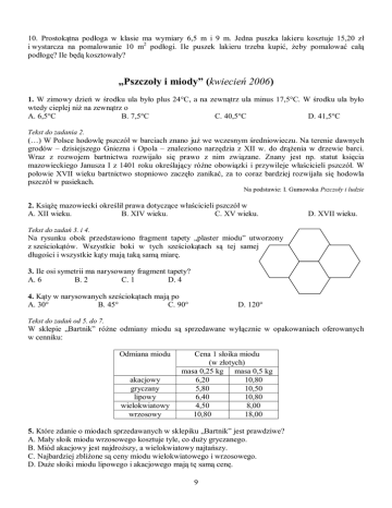 10. Prostokątna podłoga w klasie ma wymiary 6,5 m i 9 m. Jedna puszka lakieru kosztuje 15,20 zł i wystarcza na pomalowanie 10 m2 podłogi. Ile puszek lakieru trzeba kupić, żeby pomalować całą podłogę? Ile będą kosztowały? „Pszczoły i miody” (kwiecień 2006) 1. W zimowy dzień w środku ula było plus 24°C, a na zewnątrz ula minus 17,5°C. W środku ula było wtedy cieplej niż na zewnątrz o A. 6,5°C B. 7,5°C C. 40,5°C D. 41,5°C Tekst do zadania 2. (…) W Polsce hodowlę pszczół w barciach znano już we wczesnym średniowieczu. Na terenie dawnych grodów – dzisiejszego Gniezna i Opola – znaleziono narzędzia z XII w. do drążenia w drzewie barci. Wraz z rozwojem bartnictwa rozwijało się prawo z nim związane. Znany jest np. statut księcia mazowieckiego Janusza I z 1401 roku określający różne obowiązki i przywileje właścicieli pszczół. W połowie XVII wieku bartnictwo stopniowo zaczęło zanikać, za to coraz bardziej rozwijała się hodowla pszczół w pasiekach. Na podstawie: I. Gumowska Pszczoły i ludzie 2. Książę mazowiecki określił prawa dotyczące właścicieli pszczół w A. XII wieku. B. XIV wieku. C. XV wieku. D. XVII wieku. Tekst do zadań 3. i 4. Na rysunku obok przedstawiono fragment tapety „plaster miodu” utworzony z sześciokątów. Wszystkie boki w tych sześciokątach są tej samej długości i wszystkie kąty mają taką samą miarę. 3. Ile osi symetrii ma narysowany fragment tapety? A. 6 B. 2 C. 1 D. 4 4. Kąty w narysowanych sześciokątach mają po A. 30° B. 45° C. 90° D. 120° Tekst do zadań od 5. do 7. W sklepie „Bartnik” różne odmiany miodu są sprzedawane wyłącznie w opakowaniach oferowanych w cenniku: Odmiana miodu akacjowy gryczany lipowy wielokwiatowy wrzosowy Cena 1 słoika miodu (w złotych) masa 0,25 kg masa 0,5 kg 6,20 10,80 5,80 10,50 6,40 10,80 4,50 8,00 10,80 18,00 5. Które zdanie o miodach sprzedawanych w sklepiku „Bartnik” jest prawdziwe? A. Mały słoik miodu wrzosowego kosztuje tyle, co duży gryczanego. B. Miód akacjowy jest najdroższy, a wielokwiatowy najtańszy. C. Najbardziej zbliżone są ceny miodu wielokwiatowego i wrzosowego. D. Duże słoiki miodu lipowego i akacjowego mają tę samą cenę. 9 6. Agata potrzebuje do upieczenia pierników 0,4 kg miodu. Kupuje ten miód w sklepie „Bartnik”. Ile zapłaci, jeśli chce wydać jak najmniej pieniędzy? A. 4,50 zł B. 9 zł C. 8 zł D. 6,40 zł 7. Jacek chce się dowiedzieć, o ile więcej kosztuje 1 kg miodu akacjowego kupionego w małych słoikach od 1 kg tego miodu kupionego w dużych słoikach. Wystarczy, aby obliczył wartość wyrażenia A. 10,80 : 6,20 C. 10,80−6,20 B. 4⋅6,20−2⋅10,80 D. (4⋅6,20) : (2⋅10,80) 8. Jedna łyżeczka miodu waży przeciętnie 7,2 g. Pan Adam wypija codziennie szklankę wody z trzema łyżeczkami miodu, a jego żona – z dwiema. Na ile dni wystarczy im słoik zawierający 360 g miodu? A. Na 10 dni. B. Na 25 dni. C. Na 50 dni. D. Na 36 dni. 9. W dwóch słojach jest razem 7,4 litra miodu. W jednym z nich jest o 2,2 litra więcej niż w drugim. Która odpowiedź spełnia oba warunki zadania? A. 4,9 litra i 2,7 litra C. 4,8 litra i 2,6 litra B. 3,7 litra i 5,9 litra D. 2,8 litra i 4,6 litra 10. Na planie w skali 1:2000 odległość od ula do rosnącej na łące lipy jest równa 4 cm. Jaka jest odległość w terenie między ulem a tą lipą? A. 500 m B. 50 m C. 800 m D. 80 m 11. Do pomalowania jednego ula zużywa się 2 puszki farby. Ile puszek farby trzeba kupić, 3 żeby pomalować 14 takich uli? A. 21 B. 14 C. 10 D. 9 12. Samochód z ulami wyruszył z Lipowa o godzinie 255 i przybył na wrzosowisko po 50 minutach. Ustawienie uli na wrzosowisku zajęło półtorej godziny. O której godzinie zakończono ustawianie uli? A. 535 B. 515 C. 455 D. 435 13. Działka ma kształt prostokąta, którego szerokość wynosi 24 m, a długość jest 2 razy większa. 4 Na kwiaty i warzywa przeznaczono powierzchni działki, a pozostałą część na pasiekę. Ile metrów 5 kwadratowych działki przeznaczono na pasiekę? Tekst do zadań 14. i 15. Niedaleko Poznania, w Swarzędzu, w kilkuhektarowym parku znajduje się muzeum pszczelarstwa – jedno z największych w Polsce. Wybierają się tam uczniowie klasy szóstej. Korzystając z informacji na ulotce reklamującej ofertę muzeum, planują swoją wycieczkę i ustalają jej termin. Skansen i Muzeum Pszczelarstwa im. prof. Ryszarda Kosteckiego w Swarzędzu GODZINY OTWARCIA od 1 listopada do 31 marca: wtorek – sobota godz. 9.00 – 15.00 niedziela godz. 10.00 – 15.00 od 1 kwietnia do 31 października: wtorek – sobota godz. 9.00 – 16.00 niedziela godz. 10.00 – 15.00 10
