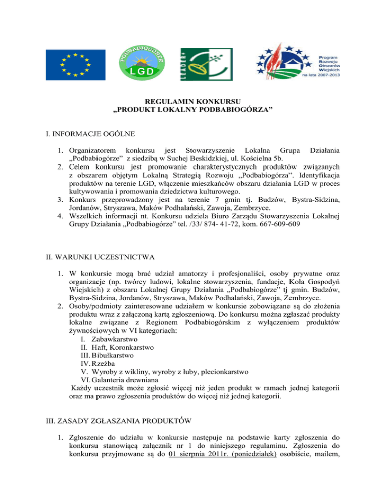 REGULAMIN KONKURSU „PRODUKT LOKALNY PODBABIOGÓRZA” I. INFORMACJE OGÓLNE 1. Organizatorem konkursu jest Stowarzyszenie Lokalna Grupa Działania „Podbabiogórze” z siedzibą w Suchej Beskidzkiej, ul. Kościelna 5b. 2. Celem konkursu jest promowanie charakterystycznych produktów związanych z obszarem objętym Lokalną Strategią Rozwoju „Podbabiogórza”. Identyfikacja produktów na terenie LGD, włączenie mieszkańców obszaru działania LGD w proces kultywowania i promowania dziedzictwa kulturowego. 3. Konkurs przeprowadzony jest na terenie 7 gmin tj. Budzów, Bystra-Sidzina, Jordanów, Stryszawa, Maków Podhalański, Zawoja, Zembrzyce. 4. Wszelkich informacji nt. Konkursu udziela Biuro Zarządu Stowarzyszenia Lokalnej Grupy Działania „Podbabiogórze” tel. /33/ 874- 41-72, kom. 667-609-609 II. WARUNKI UCZESTNICTWA 1. W konkursie mogą brać udział amatorzy i profesjonaliści, osoby prywatne oraz organizacje (np. twórcy ludowi, lokalne stowarzyszenia, fundacje, Koła Gospodyń Wiejskich) z obszaru Lokalnej Grupy Działania „Podbabiogórze” tj gmin. Budzów, Bystra-Sidzina, Jordanów, Stryszawa, Maków Podhalański, Zawoja, Zembrzyce. 2. Osoby/podmioty zainteresowane udziałem w konkursie zobowiązane są do złożenia produktu wraz z załączoną kartą zgłoszeniową. Do konkursu można zgłaszać produkty lokalne związane z Regionem Podbabiogórskim z wyłączeniem produktów żywnościowych w VI kategoriach: I. Zabawkarstwo II. Haft, Koronkarstwo III. Bibułkarstwo IV. Rzeźba V. Wyroby z wikliny, wyroby z łuby, plecionkarstwo VI. Galanteria drewniana Każdy uczestnik może zgłosić więcej niż jeden produkt w ramach jednej kategorii oraz ma prawo zgłoszenia produktów do więcej niż jednej kategorii. III. ZASADY ZGŁASZANIA PRODUKTÓW 1. Zgłoszenie do udziału w konkursie następuje na podstawie karty zgłoszenia do konkursu stanowiącą załącznik nr 1 do niniejszego regulaminu. Zgłoszenia do konkursu przyjmowane są do 01 sierpnia 2011r. (poniedziałek) osobiście, mailem, faxem lub listownie na adres: Stowarzyszenie LGD „Podbabiogórze”, ul. Kościelna 5b, 34-200 Sucha Beskidzka, mail: [email protected], fax. /33/ 874-41-72. Produkty, które nie zostaną zgłoszone w wymaganym terminie oraz bez opisów nie będą brane pod uwagę w Konkursie. 2. Do karty zgłoszeniowej należy dołączyć produkt lokalny. Produkty zgłoszone do konkursu należy dostarczyć do Biura Zarządu Stowarzyszenia LGD „Podbabiogórza” do 01 sierpnia 2011r. (poniedziałek). IV OCENA FORMALNA 1. Ocena formalna dokonywana jest przez Organizatora konkursu. 2. Ocena formalna polega na sprawdzeniu zgodności z niniejszym regulaminem, a w szczególności na sprawdzeniu, czy: 1) zgłoszenia dokonano na karcie zgłoszenia do konkursu stanowiącą załącznik nr 1 do niniejszego regulaminu; 2) wypełniono wszystkie wymagane pola karty zgłoszenia do konkursu 3) karta zgłoszenia oraz produkt lokalny zostały przesłane w wyznaczonym terminie. V OCENA MERYTORYCZNA I WYBÓR LAUREATÓW Organizator powołuje komisję konkursową, która ocenia poprawne formalnie zgłoszenia. Komisja konkursowa liczy 3 członków. Komisja konkursowa dokonuje oceny produktów w następujących kryteriach oceny: a) nawiązanie do tradycji obszaru LGD „Podbabiogórze” 0-5 pkt. b) sposób wytwarzania produktu 0-5 pkt. c) estetyka wykonania 0-5 pkt. Od werdyktu komisji konkursowej nie przysługuje odwołanie. Komisja konkursowa może zwrócić się do zgłoszonej do udziału w konkursie osoby lub podmiotu w sprawie uzyskania dodatkowych informacji i wyjaśnień. Lista laureatów zostanie ogłoszona na stronie www.lgdpodbabiogorze.pl do dnia 15 sierpnia 2011r., a uroczyste wręczenie nagród odbędzie się podczas „Dożynek Powiatowych”, które odbędą się 04 września 2011 r. w Bieńkówce. 1. 2. 3. 3. 4. 5. VI. NAGRODY 1. W wyniku rozstrzygnięcia konkursu komisja konkursowa przyzna dyplomy i nagrody rzeczowe o łącznej wartości 5000 zł. W każdej kategorii zostaną przyznane miejsca i wyróżnienia.