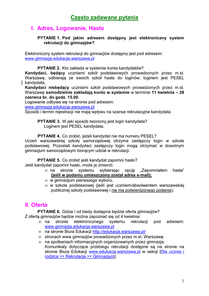 Często zadawane pytania I. Adres, Logowanie, Hasło PYTANIE 1. Pod jakim adresem dostępny jest elektroniczny system rekrutacji do gimnazjów? Elektroniczny system rekrutacji do gimnazjów dostępny jest pod adresem: www.gimnazja.edukacja.warszawa.pl PYTANIE 2. Kto zakłada w systemie konta kandydatów? Kandydaci, będący uczniami szkół podstawowych prowadzonych przez m.st. Warszawę, odbierają ze swoich szkół hasła do loginów; loginem jest PESEL kandydata. Kandydaci niebędący uczniami szkół podstawowych prowadzonych przez m.st. Warszawę samodzielnie zakładają konto w systemie w terminie 11 kwietnia – 28 czerwca br. do godz. 15.00. Logowanie odbywa się na stronie pod adresem: www.gimnazja.edukacja.warszawa.pl Sposób i termin rejestracji nie mają wpływu na szanse rekrutacyjne kandydata. PYTANIE 3. W jaki sposób tworzony jest login kandydata? Loginem jest PESEL kandydata. PYTANIE 4. Co zrobić, jeżeli kandydat nie ma numeru PESEL? Uczeń warszawskiej szkoły samorządowej otrzyma zastępczy login w szkole podstawowej. Pozostali kandydaci zastępczy login mogą otrzymać w dowolnym gimnazjum samorządowym biorącym udział w rekrutacji. PYTANIE 5. Co zrobić jeśli kandydat zapomni hasło? Jeśli kandydat zapomni hasło, może je zmienić: • na stronie systemu wybierając opcję „Zapomniałem hasła” (jeśli w podaniu umieszczony został adres e-mail); • w gimnazjum pierwszego wyboru, • w szkole podstawowej (jeśli jest uczniem/absolwentem warszawskiej publicznej szkoły podstawowej i nie ma potwierdzonego podania); II. Oferta PYTANIE 6. Gdzie i od kiedy dostępna będzie oferta gimnazjów? Z ofertą gimnazjów będzie można zapoznać się od 4 kwietnia: • na stronie elektronicznego systemu rekrutacji pod adresem: www.gimnazja.edukacja.warszawa.pl • na stronie Biura Edukacji http://edukacja.warszawa.pl/ • stronach www gimnazjów prowadzonych przez m.st. Warszawę • na spotkaniach informacyjnych organizowanych przez gimnazja. Komunikaty dotyczące przebiegu rekrutacji dostępne są na stronie na stronie Biura Edukacji www.edukacja.warszawa.pl w sekcji [Dla ucznia i rodzica >> Rekrutacja >> Gimnazjum]. 1 III. Harmonogram PYTANIE 7. Gdzie znajduje się harmonogram działań kandydata? Harmonogram działań kandydata znajduje się: • na stronie elektronicznego systemu rekrutacji pod www.gimnazja.edukacja.warszawa.pl • na stronie Biura Edukacji http://edukacja.warszawa.pl/ adresem: IV. Gimnazjum obwodowe PYTANIE 8. Czy kandydat będzie miał zapewnione miejsce w gimnazjum obwodowym? Kandydat zostanie zakwalifikowany do gimnazjum obwodowego pod warunkiem, że umieści je na liście preferencji. Kandydat, który nie umieści gimnazjum obwodowego na liście preferencji nie zostanie do niego zakwalifikowany. Umieszczenie na liście (na dowolnej pozycji) szkoły obwodowej oznacza, że kandydat zostanie przyjęty do tej szkoły w sytuacji, gdy nie zostanie zakwalifikowany do innej szkoły. UWAGA: pierwszeństwo przyjęcia do szkoły obwodowej nie dotyczy oddziałów specjalistycznych (dwujęzycznych, sportowych, integracyjnych części oddziałów integracyjnych). PYTANIE 9. Gdzie można sprawdzić, które gimnazjum jest gimnazjum obwodowym kandydata zamieszkałego na terenie m.st. Warszawy? Wyszukiwarka szkół obwodowych udostępniona zostanie 4 kwietnia na stronie elektronicznego systemu rekrutacji w zakładce „Szkoła obwodowa” pod adresem: www.gimnazja.edukacja.warszawa.pl V. Lista preferencji PYTANIE 10. Ile gimnazjów kandydat może wskazać na liście preferencji? Kandydat może wskazać dowolną liczbą gimnazjów, do których chce ubiegać się o przyjęcie. PYTANIE 11. Jakie typy oddziałów mogą być utworzone w gimnazjach? W gimnazjach mogą być tworzone oddziały: • ogólnodostępne • dwujęzyczne • sportowe • integracyjne PYTANIE 12. Czym różnią się poszczególne oddziały? Oddział ogólnodostępny jest oddziałem obwodowym, do którego przyjmowani są uczniowie mieszkający w obwodzie danego gimnazjum. Jeżeli pozostaną wolne miejsca w gimnazjum obwodowym, uczniowie spoza obwodu przyjmowani są zgodnie z kryteriami zapisanymi w statucie gimnazjum. Oddział dwujęzyczny jest oddziałem bez obwodu. Nauczanie w oddziałach dwujęzycznych prowadzone jest w dwóch językach: polskim oraz obcym nowożytnym będącym drugim językiem nauczania. W dwóch językach odbywają się co najmniej dwa zajęcia edukacyjne. Do oddziału dwujęzycznego przyjmowani są kandydaci, którzy zaliczą sprawdzian uzdolnień językowych przeprowadzany w tych szkołach. 2 Oddział sportowy jest oddziałem bez obwodu. Do oddziału sportowego przyjmowani są kandydaci, którzy: • zaliczą próbę sprawności fizycznej • posiadają bardzo dobry stan zdrowia, potwierdzony orzeczeniem lekarskim wydanym przez lekarza specjalistę w dziedzinie medycyny sportowej lub innego uprawnionego lekarza • przedstawią pisemną zgodę rodziców/opiekunów prawnych. Oddział integracyjny składa się z dwóch części. Liczba uczniów w oddziale integracyjnym powinna wynosić od 15 do 20 uczniów, w tym od 3 do 5 uczniów posiadających orzeczenia o potrzebie kształcenia specjalnego. Do oddziałów integracyjnych przyjmowani są kandydaci pełnosprawni oraz posiadający orzeczenia o potrzebie kształcenia specjalnego. Kandydaci ubiegający się o przyjęcie do grupy rekrutacyjnej określonej jako część integracyjna oddziału integracyjnego, powinni posiadać orzeczenie o potrzebie kształcenia specjalnego. PYTANIE 13. Czym różni się zgłoszenie od wniosku? Zgłoszenie składają kandydaci, którzy na swojej liście preferencji wskazali tylko gimnazjum obwodowe grupę rekrutacyjną ogólnodostępną. Wniosek składany jest przez kandydatów, którzy na swojej liście preferencji wskazali kilka gimnazjów, do których chcą kandydować, w tym także gimnazjum obwodowe (ale nie na pierwszej liście preferencji). PYTANIE 14. Co oznaczają skróty w ofercie