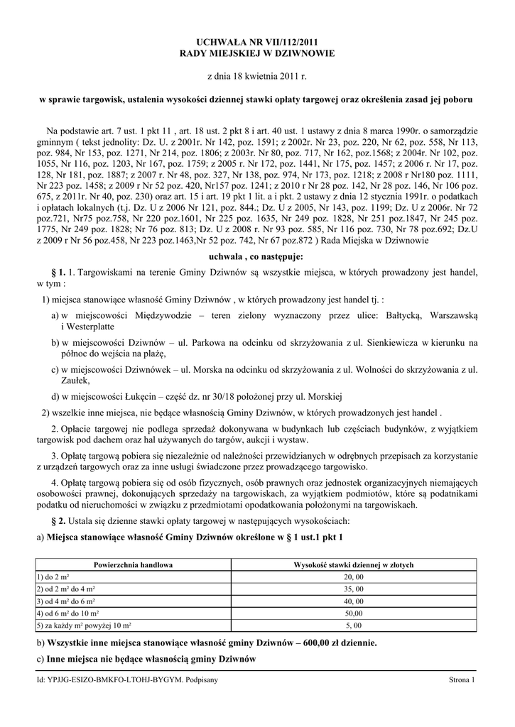 UCHWAŁA NR VII/112/2011 RADY MIEJSKIEJ W DZIWNOWIE z dnia 18 kwietnia 2011 r. w sprawie targowisk, ustalenia wysokości dziennej stawki opłaty targowej oraz określenia zasad jej poboru Na podstawie art. 7 ust. 1 pkt 11 , art. 18 ust. 2 pkt 8 i art. 40 ust. 1 ustawy z dnia 8 marca 1990r. o samorządzie gminnym ( tekst jednolity: Dz. U. z 2001r. Nr 142, poz. 1591; z 2002r. Nr 23, poz. 220, Nr 62, poz. 558, Nr 113, poz. 984, Nr 153, poz. 1271, Nr 214, poz. 1806; z 2003r. Nr 80, poz. 717, Nr 162, poz.1568; z 2004r. Nr 102, poz. 1055, Nr 116, poz. 1203, Nr 167, poz. 1759; z 2005 r. Nr 172, poz. 1441, Nr 175, poz. 1457; z 2006 r. Nr 17, poz. 128, Nr 181, poz. 1887; z 2007 r. Nr 48, poz. 327, Nr 138, poz. 974, Nr 173, poz. 1218; z 2008 r Nr180 poz. 1111, Nr 223 poz. 1458; z 2009 r Nr 52 poz. 420, Nr157 poz. 1241; z 2010 r Nr 28 poz. 142, Nr 28 poz. 146, Nr 106 poz. 675, z 2011r. Nr 40, poz. 230) oraz art. 15 i art. 19 pkt 1 lit. a i pkt. 2 ustawy z dnia 12 stycznia 1991r. o podatkach i opłatach lokalnych (t.j. Dz. U z 2006 Nr 121, poz. 844.; Dz. U z 2005, Nr 143, poz. 1199; Dz. U z 2006r. Nr 72 poz.721, Nr75 poz.758, Nr 220 poz.1601, Nr 225 poz. 1635, Nr 249 poz. 1828, Nr 251 poz.1847, Nr 245 poz. 1775, Nr 249 poz. 1828; Nr 76 poz. 813; Dz. U z 2008 r. Nr 93 poz. 585, Nr 116 poz. 730, Nr 78 poz.692; Dz.U z 2009 r Nr 56 poz.458, Nr 223 poz.1463,Nr 52 poz. 742, Nr 67 poz.872 ) Rada Miejska w Dziwnowie uchwala , co następuje: § 1. 1. Targowiskami na terenie Gminy Dziwnów są wszystkie miejsca, w których prowadzony jest handel, w tym : 1) miejsca stanowiące własność Gminy Dziwnów , w których prowadzony jest handel tj. : a) w miejscowości Międzywodzie – teren zielony wyznaczony przez ulice: Bałtycką, Warszawską i Westerplatte b) w miejscowości Dziwnów – ul. Parkowa na odcinku od skrzyżowania z ul. Sienkiewicza w kierunku na północ do wejścia na plażę, c) w miejscowości Dziwnówek – ul. Morska na odcinku od skrzyżowania z ul. Wolności do skrzyżowania z ul. Zaułek, d) w miejscowości Łukęcin – część dz. nr 30/18 położonej przy ul. Morskiej 2) wszelkie inne miejsca, nie będące własnością Gminy Dziwnów, w których prowadzonych jest handel . 2. Opłacie targowej nie podlega sprzedaż dokonywana w budynkach lub częściach budynków, z wyjątkiem targowisk pod dachem oraz hal używanych do targów, aukcji i wystaw. 3. Opłatę targową pobiera się niezależnie od należności przewidzianych w odrębnych przepisach za korzystanie z urządzeń targowych oraz za inne usługi świadczone przez prowadzącego targowisko. 4. Opłatę targową pobiera się od osób fizycznych, osób prawnych oraz jednostek organizacyjnych niemających osobowości prawnej, dokonujących sprzedaży na targowiskach, za wyjątkiem podmiotów, które są podatnikami podatku od nieruchomości w związku z przedmiotami opodatkowania położonymi na targowiskach. § 2. Ustala się dzienne stawki opłaty targowej w następujących wysokościach: a) Miejsca stanowiące własność Gminy Dziwnów określone w § 1 ust.1 pkt 1 Powierzchnia handlowa Wysokość stawki dziennej w złotych 1) do 2 m² 20, 00 2) od 2 m² do 4 m² 35, 00 3) od 4 m² do 6 m² 40, 00 4) od 6 m² do 10 m² 50,00 5) za każdy m² powyżej 10 m² 5, 00 b) Wszystkie inne miejsca stanowiące własność gminy Dziwnów – 600,00 zł dziennie. c) Inne miejsca nie będące własnością gminy Dziwnów Id: YPJJG-ESIZO-BMKFO-LTOHJ-BYGYM. Podpisany Strona 1 Powierzchnia handlowa Wysokość stawki dziennej w złotych 1) do 6 m2 10, 00 2) za każdy 1 m² powyżej 6 m² do 30 m² 4, 00 3) za każdy 1 m² powyżej 30 m² 6, 00 z tym zastrzeżeniem, że stawki wymienione w lit. a) i c) nie mogą przekroczyć dziennie kwoty 699,27 zł. § 3. Zwalnia się od opłaty targowej sprzedaż podczas imprez okolicznościowych i rocznicowych pod patronatem Gminy Dziwnów § 4. 1. Pobór opłaty targowej odbywa się poprzez inkasentów w drodze inkasa. 2. Inkasentami mogą być osoby fizyczne lub prawne, powołane uchwałą Rady Miejskiej, którym powierzono pobór opłaty na podstawie indywidualnych umów zawartych między tymi osobami a Burmistrzem Dziwnowa. 3. Dowodem uiszczenia opłaty targowej jest druk ścisłego zarachowania z kwitariusza przychodowego, ostemplowanego pieczęcią urzędową. 4. Inkasent dokonując opłaty targowej wydaje pokwitowanie za każdą pobraną kwotę. § 5. Tracą moc 1) uchwała Nr XXXIV/357/2006 Rady Miejskiej w Dziwnowie z dnia 21 lutego 2006r. w sprawie targowisk, ustalenia wysokości dziennej stawki opłaty targowej oraz określenia zasad jej poboru 2) uchwała Nr XXIV/120/2008 Rady Miejskiej w Dziwnowie z dnia 26 lutego 2008r. w sprawie zmiany uchwały Nr XXXIV/357/2006 Rady Miejskiej w Dziwnowie z dnia 21 lutego 2006r.w sprawie targowisk, ustalenia wysokości dziennej stawki opłaty targowej oraz określenia zasad jej poboru 3) uchwała Nr XXVI/157/ 2008 Rady Miejskiej w Dziwnowie z dnia 15 kwietnia 2008r. w sprawie zmiany Uchwały w sprawie zmiany uchwały Nr XXXIV/357/2006 Rady Miejskiej w Dziwnowie z dnia 21 lutego 2006r.w sprawie targowisk, ustalenia wysokości dziennej stawki opłaty targowej oraz określenia zasad jej poboru § 6. Wykonanie uchwały powierza się Burmistrzowi Dziwnowa. § 7. Uchwała wchodzi w życie po upływie 14 dni od daty ogłoszenia w Dzienniku Urzędowym Województwa Zachodniopomorskiego. Id: YPJJG-ESIZO-BMKFO-LTOHJ-BYGYM. Podpisany Strona 2