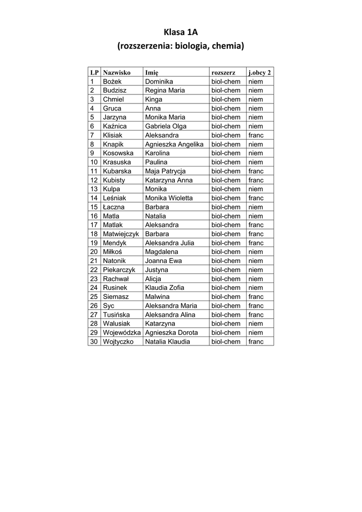 Klasa 1A (rozszerzenia: biologia, chemia) LP 1 2 3 4 5 6 7 8 9 10 11 12 13 14 15 16 17 18 19 20 21 22 23 24 25 26 27 28 29 30 Nazwisko Bożek Budzisz Chmiel Gruca Jarzyna Kaźnica Klisiak Knapik Kosowska Krasuska Kubarska Kubisty Kulpa Leśniak Łaczna Matla Matlak Matwiejczyk Mendyk Miłkoś Natonik Piekarczyk Rachwał Rusinek Siemasz Syc Tusińska Walusiak Wojewódzka Wojtyczko Imię Dominika Regina Maria Kinga Anna Monika Maria Gabriela Olga Aleksandra Agnieszka Angelika Karolina Paulina Maja Patrycja Katarzyna Anna Monika Monika Wioletta Barbara Natalia Aleksandra Barbara Aleksandra Julia Magdalena Joanna Ewa Justyna Alicja Klaudia Zofia Malwina Aleksandra Maria Aleksandra Alina Katarzyna Agnieszka Dorota Natalia Klaudia rozszerz biol-chem biol-chem biol-chem biol-chem biol-chem biol-chem biol-chem biol-chem biol-chem biol-chem biol-chem biol-chem biol-chem biol-chem biol-chem biol-chem biol-chem biol-chem biol-chem biol-chem biol-chem biol-chem biol-chem biol-chem biol-chem biol-chem biol-chem biol-chem biol-chem biol-chem j.obcy 2 niem niem niem niem niem niem franc niem niem niem franc franc niem franc niem niem franc franc franc niem niem niem niem niem franc franc franc niem niem franc