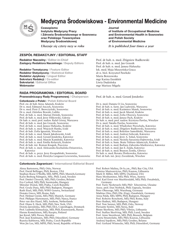 Medycyna Środowiskowa - Environmental Medicine Czasopismo Instytutu Medycyny Pracy i Zdrowia Środowiskowego w Sosnowcu oraz Polskiego Towarzystwa Medycyny Środowiskowej Ukazuje się cztery razy w roku ZESPÓŁ REDAKCYJNY / EDITORIAL STAFF Redaktor Naczelny / Editor-in-Chief Zastępcy Redaktora Naczelnego / Deputy Editors Journal of Institute of Occupational Medicine and Environmental Health in Sosnowiec and Polish Society of Environmental Medicine It is published four times a year Prof. dr hab. n. med. Zbigniew Rudkowski Redaktor Tematyczny / Feature Editor Redaktor Statystyczny / Statistical Editor Redaktor Językowy / Lingual Editor Sekretarz Redakcji / Co-editor Sekretariat / Editorial Office Webmaster Prof. dr hab. n. med. Jan Grzesik Prof. dr hab. n. med. Janusz Hałuszka lek. med. Maja Muszyńska-Graca dr n. biol. Krzysztof Pawlicki Maria Berezowska mgr Karina Erenkfeit Liwia Dudzińska mgr Mariusz Migała Przewodniczący Rady Programowej / Chairperson Prof. dr hab. n. med. Gerard Jonderko Prof. zw. dr hab. Irena Adamek, Kraków Dr n. med. Edmund Anczyk, Sosnowiec Dr n. med. Piotr Z. Brewczyński, Sosnowiec Dr n. med. Zdzisław Brzeski, Lublin Prof. dr hab. n. med. Marian Dróżdż, Sosnowiec Prof. dr hab. n. med. Jerzy Filikowski, Gdynia Dr hab. n. med. prof. nadzw. Rafał Górny, Warszawa Prof. dr hab. n. med. Jan Grzesik, Sosnowiec Prof. dr hab. n. med. Janusz Hałuszka, Kraków Prof. dr hab. n. med. Wojciech Hanke, Łódź Prof. dr hab. Zofia Ignasiak, Wrocław Prof. dr hab. n. med. Marek Jakubowski, Łódź Prof. dr hab. n. med. Gerard Jonderko, Katowice Prof. dr hab. n. med. Marcin Kamiński, Katowice Prof. dr hab. n. med. Emilia Kolarzyk, Kraków Prof. dr hab. inż. Roman Knapek, Pszczyna Prof. dr hab. n. med. Aleksandra Kochańska-Dziurowicz, Katowice Prof. dr hab. n. przyr. Jerzy Kwapuliński, Sosnowiec Prof. dr hab. n. med. Henryka Langauer-Lewowicka, Sosnowiec Dr n. med. Danuta O. Lis, Sosnowiec Prof. dr hab. n. farm. Jan Ludwicki, Warszawa Prof. dr hab. n. med. Kazimierz Marek, Sosnowiec Prof. dr hab. n. med. Jacek Musiał, Kraków Prof. dr hab. n. med. Zofia Olszowy, Sosnowiec Prof. dr hab. n. med. Janusz Pach, Kraków Dr hab. n. med. prof. nadzw. Krystyna Pawlas, Wrocław Dr n. med. Natalia Pawlas, Sosnowiec Prof. dr hab. n. med. Władysław Pierzchała, Katowice Prof. dr hab. n. med. Zbigniew Rudkowski, Sosnowiec Prof. dr hab. n. med. Bolesław Samoliński, Warszawa Prof. dr hab. n. med. Andrzej Sobczak, Katowice Prof. dr hab. n. med. Jerzy A. Sokal, Sosnowiec Prof. dr hab. n. med. Neonila Szeszenia-Dąbrowska, Łódź Prof. dr hab. n. hum. Beata Tobiasz-Adamczyk, Kraków Prof. dr hab. n. med. Barbara Zahorska-Markiewicz, Katowice Prof. dr hab. n. med. Jan E. Zejda, Katowice Prof. dr hab. n. med. Brunon Zemła, Gliwice Dr hab. n. med. Renata Złotkowska, Katowice Prof. dr hab. inż. Jerzy Zwoździak, Wrocław RADA PROGRAMOWA / EDITORIAL BOARD Członkowie z Polski / Polish Editorial Board Członkowie Zagraniczni / International Editorial Board Alena Bartonova, PhD, Oslo, Norway Prof. David Bellinger, PhD, Boston, USA Stephan Boese O’Reilly, MD, MPH, PhD, Munich,Germany Karin Broberg Palmgren, MSc, PhD, Lund, Sweden Prof. Dmitri Chvoryk, MD, PhD, Grodno, Belarus Eva Csobod, MD, PhD, Szentendre, Hungary Miroslav Dostal, MD, Praha, Czech Republic Prof. Gyula Dura, MD, PhD, Budapest, Hungary Ruth Etzel, MD, PhD, WHO Geneva, Switzerland Donato Greco, MD, Rome, Italy Prof. Helmut Greim, MD, PhD, Munich, Germany Prof. Philippe Hartemann, MD, PhD, Nancy, France Peter van den Hazel, MD, Arnhem, Netherlands Prof. Diane E. Heck, MD, PhD, New York, USA Dorota Jarosińska, MD, PhD, EEA, Copenhagen, Denmark Prof. Ludmiła Klimackaja, MD, PhD, Krasnoyarsk, Russia Hannu Komulainen, MD, Kuopio, Finland Jan Koval, MD, Presov, Slovakia Prof. Jean Krutmann, MD, PhD, Düsseldorf, Germany Ruzena Kubinova, MD, Praha, Czech Republic Won Jin Lee, MD, MPH, PhD, Seoul, Republic of Korea Prof. Robert Malina, Dr h.c.m., PhD, Bay City, USA Dainius Martuzevicius, PhD, Kaunas, Lithuania Mark D. Miller, MD, MPH, Oackland, USA Hans Moshammer, MD, PhD, Wien, Austria Prof. Karl Ernst von Muehlendahl, MD, PhD, Osnabrück, Germany Prof. Yuriy Nechytaylo MD, PhD Tchernivtsi, Ukraine Assoc. prof. Dan Norbäck, PhD, Uppsala, Sweden Peter Ohnsorge, MD, Wurzburg, Germany Mathias Otto, PhD, DSc (Eng), Osnabrück, Germany Anna Paldy, MD, MPH, PhD, Budapest, Hungary Prof. Roberto Ronchetti, MD, PhD, Rome, Italy Peter Rudnai, MD, Budapest, Hungary Prof. Tore Sanner, MD, PhD, Oslo, Norway Piersante Sestini, MD, Siena, Italy Birute Skerliene, MD, PhD, Vilnius, Lithuania Prof. Staffan Skerfving, MD, PhD, Lund, Sweden Prof. Anne Steenhout, MD, PhD, Brussels, Belgium Loreta Strumylaite, MD, PhD, Kaunas, Lithuania Andrzej Szpakow, MD, PhD, Grodno, Belarus Prof. Gerhard Winnecke, MD, PhD, Düsseldorf, Germany Adres Redakcji i Wydawcy: Editorial office and publisher’s address: Instytut Medycyny Pracy i Zdrowia Środowiskowego oraz Polskie Towarzystwo Medycyny Środowiskowej ul. Kościelna 13 41-200 Sosnowiec tel. (32) 266-08-85 wew. 201, 202 fax (32) 266-11-24 e-mail: ms@ imp.sosnowiec.pl Institute of Occupational Medicine and Environmental Health and Polish Society of Environmental Medicine Kościelna 13 Str. 41-200 Sosnowiec, Poland Tel. +48 (32) 266-08-85 ext. 201, 202 Fax: +48 (32) 266-11-24 e-mail: ms@ imp.sosnowiec.pl Warunki prenumeraty: Subscription conditions: Cena prenumeraty rocznej dla instytucji od 2013 r. wynosi 160 zł (40 zł za jeden numer), dla odbiorców indywidualnych 100 zł (25 zł za jeden numer). Annual subscription for institutions since 2013: 160 zł (40 zł one volume). Annual subscription for individuals: 100 zł (25 zł one volume). Subscription orders should be sent to the following address: Zamówienie prosimy kierować na adres: Redakcja Medycyny Środowiskowej Environmental Medicine ul. Kościelna 13 41-200 Sosnowiec lub e-mail: [email protected] Medycyna Środowiskowa - Environment