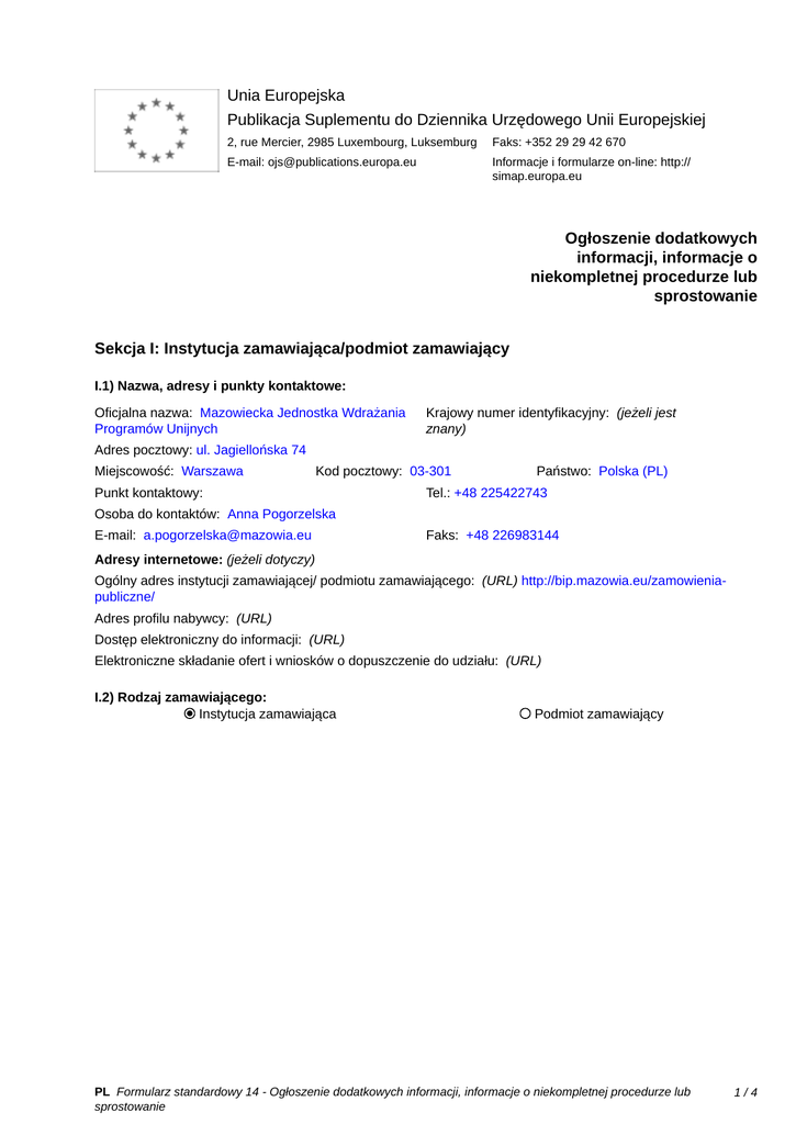 Unia Europejska Publikacja Suplementu do Dziennika Urzędowego Unii Europejskiej 2, rue Mercier, 2985 Luxembourg, Luksemburg Faks: +352 29 29 42 670 E-mail: [email protected] Informacje i formularze on-line: http:// simap.europa.eu Ogłoszenie dodatkowych informacji, informacje o niekompletnej procedurze lub sprostowanie Sekcja I: Instytucja zamawiająca/podmiot zamawiający I.1) Nazwa, adresy i punkty kontaktowe: Oficjalna nazwa: Mazowiecka Jednostka Wdrażania Programów Unijnych Krajowy numer identyfikacyjny: (jeżeli jest znany) _____ Adres pocztowy: ul. Jagiellońska 74 Miejscowość: Warszawa Kod pocztowy: 03-301 Punkt kontaktowy: _____ Państwo: Polska (PL) Tel.: +48 225422743 Osoba do kontaktów: Anna Pogorzelska E-mail: [email protected] Faks: +48 226983144 Adresy internetowe: (jeżeli dotyczy) Ogólny adres instytucji zamawiającej/ podmiotu zamawiającego: (URL) http://bip.mazowia.eu/zamowieniapubliczne/ Adres profilu nabywcy: (URL) _____ Dostęp elektroniczny do informacji: (URL) _____ Elektroniczne składanie ofert i wniosków o dopuszczenie do udziału: (URL) _____ I.2) Rodzaj zamawiającego: Instytucja zamawiająca Podmiot zamawiający PL Formularz standardowy 14 - Ogłoszenie dodatkowych informacji, informacje o niekompletnej procedurze lub sprostowanie 1/4 Sekcja II: Przedmiot zamówienia II.1.1) Nazwa nadana zamówieniu: Dostawa licencji na oprogramowanie antywirusowe wraz z centralnym zarządzaniem dla Mazowieckiej Jednostki Wdrażania Programów Unijnych II.1.2) Krótki opis zamówienia lub zakupu: (podano w pierwotnym ogłoszeniu) 1. Przedmiotem zamówienia dostawa licencji na oprogramowanie antywirusowe wraz z centralnym zarządzaniem dla Mazowieckiej Jednostki Wdrażania Programów Unijnych. Licencje dla 600 stanowisk ( w tym 15 instalacji serwerowych). 2. Szczegółowy Opis Przedmiotu Zamówienia stanowi Załącznik nr 2 do SIWZ 3. Zamówienie prowadzone w trybie przetargu nieograniczonego o wartości łącznej zamówień o tożsamym charakterze realizowanych w danym roku przekraczającej wyrażoną w złotych równowartość kwoty określonej w przepisach wydanych na podstawie art. 11 ust. 8 ustawy P.z.p. II.1.3) Wspólny Słownik Zamówień (CPV) Główny przedmiot Słownik główny 48760000 Słownik uzupełniający (jeżeli dotyczy) PL Formularz standardowy 14 - Ogłoszenie dodatkowych informacji, informacje o niekompletnej procedurze lub sprostowanie 2/4 Sekcja IV: Procedura IV.1)Rodzaj procedury (podano w pierwotnym ogłoszeniu) Otwarta Ograniczona Ograniczona przyspieszona Negocjacyjna Negocjacyjna przyspieszona Dialog konkurencyjny Negocjacyjna z uprzednim ogłoszeniem Negocjacyjna bez uprzedniego ogłoszenia Negocjacyjna z publikacją ogłoszenia o zamówieniu Negocjacyjna bez publikacji ogłoszenia o zamówieniu Udzielenie zamówienia bez uprzedniej publikacji ogłoszenia o zamówieniu w Dzienniku Urzędowym Unii Europejskiej IV.2)Informacje administracyjne IV.2.1)Numer referencyjny: (podano w pierwotnym ogłoszeniu) WZP/WO/D-332-65/15 IV.2.2)Dane referencyjne ogłoszenia w przypadku ogłoszeń przesłanych drogą elektroniczną: Pierwotne ogłoszenie przesłane przez eNotices TED eSender Login: ENOTICES_MJWPU Dane referencyjne ogłoszenia: 2015-140288 rok i numer dokumentu IV.2.3)Ogłoszenie, którego dotyczy niniejsza publikacja: Numer ogłoszenia w Dz.U.: _____ z dnia: ______ (dd/mm/rrrr) IV.2.4)Data wysłania pierwotnego ogłoszenia: 20/10/2015 (dd/mm/rrrr) PL Formularz standardowy 14 - Ogłoszenie dodatkowych informacji, informacje o niekompletnej procedurze lub sprostowanie 3/4 Sekcja VI: Informacje uzupełniające VI.1) Ogłoszenie dotyczy: Procedury niepełnej Sprostowania Informacji dodatkowych VI.2) Informacje na temat niepełnej procedury udzielenia zamówienia: Postępowanie o udzielenie zamówienia zostało przerwane Postępowanie o udzielenie zamówienia uznano za nieskuteczne Zamówienia nie udzielono Zamówienie może być przedmiotem ponownej publikacji VI.3) Informacje do poprawienia lub dodania : VI.3.1) Zmiana oryginalnej informacji podanej przez instytucję zamawiającą Publikacja w witrynie TED niezgodna z oryginalną informacją, przekazaną przez instytucję zamawiającą Oba przypadki VI.3.2) W ogłoszeniu pierwotnym W odpowiedniej dokumentacji przetargowej (więcej informacji w odpowiedniej dokumentacji przetargowej) W obu przypadkach (więcej informacji w odpowiedniej dokumentacji przetargowej) VI.3.3) Tekst, który należy poprawić w pierwotnym ogłoszeniu Miejsce, w którym znajduje się Zamiast: zmieniany tekst: Okres w miesiącach: 60 IV.3.7) Minimalny okres, w którym oferent będzie związany ofertą: VI.3.4) Daty, które należy poprawić w pierwotnym ogłoszeniu Miejsce, w którym znajdują się Zamiast: zmieniane daty: Powinno być: Okres w dniach: 60 Powinno być: VI.3.5) Adresy i punkty kontaktowe, które należy poprawić VI.3.6) Tekst, który należy dodać do pierwotnego ogłoszenia Miejsce, w którym należy dodać tekst: Tekst do dodania: VI.4) Inne dodatkowe informacje: _____ VI.5) Data wysłania niniejszego ogłoszenia: 21/10/2015 (dd/mm/rrrr) - ID:2015-140528 PL Formularz standardowy 14 - Ogłoszenie dodatkowych informacji, informacje o niekompletnej procedurze lub sprostowanie 4/4