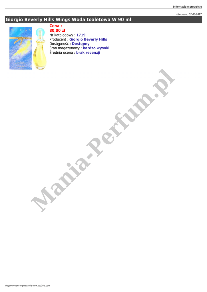 Informacje o produkcie Utworzono 02-03-2017 Giorgio Beverly Hills Wings Woda toaletowa W 90 ml Cena : 80,00 zł M an ia -P er f um .p l Nr katalogowy : 1719 Producent : Giorgio Beverly Hills Dostępność : Dostępny Stan magazynowy : bardzo wysoki Średnia ocena : brak recenzji Wygenerowano w programie www.oscGold.com
