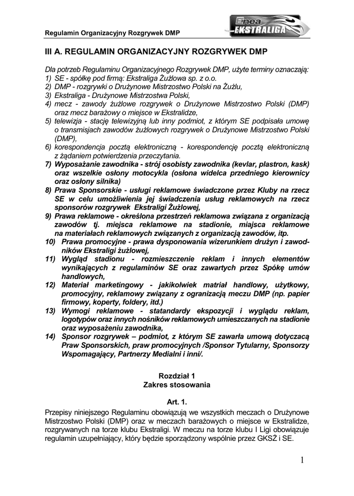 Regulamin Organizacyjny Rozgrywek DMP III A. REGULAMIN ORGANIZACYJNY ROZGRYWEK DMP Dla potrzeb Regulaminu Organizacyjnego Rozgrywek DMP, użyte terminy oznaczają: 1) SE - spółkę pod firmą: Ekstraliga Żużlowa sp. z o.o. 2) DMP - rozgrywki o Drużynowe Mistrzostwo Polski na Żużlu, 3) Ekstraliga - Drużynowe Mistrzostwa Polski, 4) mecz - zawody żużlowe rozgrywek o Drużynowe Mistrzostwo Polski (DMP) oraz mecz barażowy o miejsce w Ekstralidze, 5) telewizja - stację telewizyjną lub inny podmiot, z którym SE podpisała umowę o transmisjach zawodów żużlowych rozgrywek o Drużynowe Mistrzostwo Polski (DMP), 6) korespondencja pocztą elektroniczną - korespondencję pocztą elektroniczną z żądaniem potwierdzenia przeczytania. 7) Wyposażanie zawodnika - strój osobisty zawodnika (kevlar, plastron, kask) oraz wszelkie osłony motocykla (osłona widelca przedniego kierownicy oraz osłony silnika) 8) Prawa Sponsorskie - usługi reklamowe świadczone przez Kluby na rzecz SE w celu umożliwienia jej świadczenia usług reklamowych na rzecz sponsorów rozgrywek Ekstraligi Żużlowej, 9) Prawa reklamowe - określona przestrzeń reklamowa związana z organizacją zawodów tj. miejsca reklamowe na stadionie, miajsca reklamowe na materiałach reklamowych związanych z organizacją zawodów, itp. 10) Prawa promocyjne - prawa dysponowania wizerunkiem drużyn i zawodników Ekstraligi żużlowej, 11) Wygląd stadionu - rozmieszczenie reklam i innych elementów wynikających z regulaminów SE oraz zawartych przez Spókę umów handlowych, 12) Materiał marketingowy - jakikolwiek matriał handlowy, użytkowy, promocyjny, reklamowy związany z ogranizacją meczu DMP (np. papier firmowy, koperty, foldery, itd.) 13) Wymogi reklamowe - statandardy ekspozycji i wyglądu reklam, logotypów oraz innych nośników reklamowych umieszczanych na stadionie oraz wyposażeniu zawodnika, 14) Sponsor rozgrywek – podmiot, z którym SE zawarła umową dotyczacą Praw Sponsorskich, praw promocyjnych /Sponsor Tytularny, Sponsorzy Wspomagający, Partnerzy Medialni i inni/. Rozdział 1 Zakres stosowania Art. 1. Przepisy niniejszego Regulaminu obowiązują we wszystkich meczach o Drużynowe Mistrzostwo Polski (DMP) oraz w meczach barażowych o miejsce w Ekstralidze, rozgrywanych na torze klubu Ekstraligi. W meczu na torze klubu I Ligi obowiązuje regulamin uzupełniający, który będzie sporządzony wspólnie przez GKSŻ i SE. 1 Regulamin Organizacyjny Rozgrywek DMP Rozdział 2 Obowiązki organizatora meczu Art. 2. 1. Każdy klub musi dysponować na stadionie komputerem z systemem operacyjnym Windows wersji 98 lub nowszej i zainstalowanym programem Microsoft Excel wersji 2000 lub nowszej oraz drukarką i skanerem. 2. Komputer musi posiadać połączenie internetowe ze zdefiniowanym kontem poczty elektronicznej. 3. W celu realizacji transmisji internetowych na stronie internetowej SE zaleca się, aby komputer używany do sporządzania protokołu posiadał bezpośrednie połączenie z internetem. Art. 3. W przypadku, gdy mecz jest transmitowany przez telewizję, organizator zapewnia minimum 3 ambulanse, w tym 2 typu „S”. Art. 4. 1. Organizator zawodów jest zobowiązany do wydania programu zawodów. 2. Odrębne przepisy SE mogą zawierać szczegółowe wymogi dotyczące zawartości, wyglądu i układu programu zawodów oraz plakatu. 3. Organizator zawodów ma obowiązek wystawienia w dostępnym miejscu w parkingu ścianki do wywiadów telewizyjnych także w przypadku meczów, z których telewizja nie przeprowadza transmisji telewizyjnej. 4. Organizator jest zobowiązany do umożliwienia wjazdu na parking przy parku maszyn do dziesięciu samochodów osobowych lub dostawczych wiozących ekipę drużyny gości. Art. 5. 1. W czasie rozgrywania meczu na stadionie musi być wywieszona flaga narodowa. 2. W meczach finałowych o medale DMP organizator jest zobowiązany do odegrania hymnu narodowego na początku prezentacji. 3. Organizator zawodów ma obowiązek emitowania w trakcie zawodów przerywników dźwiękowych Ekstraligi Żużlowej na zasadach i w formie określonej przez SE. Art. 6. 1. Przebieg każdego meczu od momentu rozpoczęcia próby toru musi być zarejestrowany w trybie ciągłym przez kamerę umieszczoną na statywie w pobliżu stanowiska sędziego. W przypadku braku transmisji telewizyjnej zapis wideo może być przerwany w celu udostępnienia go sędziemu zawodów. W tym celu organizator zapewnia monitor z przeznaczeniem do zapoznania się przez sędziego zawodów z zapisem wideo. Fakt skorzystania z zapisu wideo sędzia odnotowuje w sprawozdaniu z zawodów. 2 Regulamin Organizacyjny Rozgrywek DMP 2. Szczegółowe wytyczne dotyczące zasad nagrywania materiału wideo określi SE w Załączniku nr 1. 3. Do końca dnia roboczego następującego po dniu zakończenia meczu klub przesyła do SE materiał wideo z zawodów, program zawodów, bilet i plakat (jeżeli organizator wydaje plakat). Art. 7. 1. Fotoreporterzy i prasa muszą opuścić park maszyn przed zawodami na 60 minut przed godziną ich rozpoczęcia. 2. Po zakończeniu meczu, organizator ma obowiązek zorganizowania konferencji prasowej. Udział w konferencji biorą trenerzy drużyn i po dwóch zawodników, w tym jeden z najlepszą zdobyczą punktową z każdej drużyny ubranym w swój strój zawodniczy (bez kasku), wyznaczonym przez kierownika drużyny. Powinni to być zawodnicy, którzy w meczu zdobyli pierwszą lub drugą sumę punktów w swojej drużynie. 3. Fotoreporterzy i prasa mają wstęp do parku maszyn po zawodach w momencie, gdy motocykle zostały zwolnione przez sędziego zawodów. Rozdział 3 Dodatkowe wymogi dotyczące toru i jego wyposażenia Art. 8. 1. Podczas każdego meczu w parku maszyn musi być waga najazdowa z ważnym świadectwem legalizacji wydanym przez Główny Urząd Miar lub jego jednostki okręgowe i obwodowe. 2. W każdym parku maszyn musi być wyznaczone specjalne pole zwane polem ustawienia zawodników pomal
