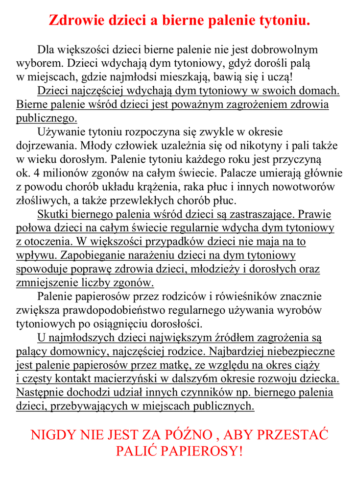 Zdrowie dzieci a bierne palenie tytoniu. Dla większości dzieci bierne palenie nie jest dobrowolnym wyborem. Dzieci wdychają dym tytoniowy, gdyż dorośli palą w miejscach, gdzie najmłodsi mieszkają, bawią się i uczą! Dzieci najczęściej wdychają dym tytoniowy w swoich domach. Bierne palenie wśród dzieci jest poważnym zagrożeniem zdrowia publicznego. Używanie tytoniu rozpoczyna się zwykle w okresie dojrzewania. Młody człowiek uzależnia się od nikotyny i pali także w wieku dorosłym. Palenie tytoniu każdego roku jest przyczyną ok. 4 milionów zgonów na całym świecie. Palacze umierają głównie z powodu chorób układu krążenia, raka płuc i innych nowotworów złośliwych, a także przewlekłych chorób płuc. Skutki biernego palenia wśród dzieci są zastraszające. Prawie połowa dzieci na całym świecie regularnie wdycha dym tytoniowy z otoczenia. W większości przypadków dzieci nie maja na to wpływu. Zapobieganie narażeniu dzieci na dym tytoniowy spowoduje poprawę zdrowia dzieci, młodzieży i dorosłych oraz zmniejszenie liczby zgonów. Palenie papierosów przez rodziców i rówieśników znacznie zwiększa prawdopodobieństwo regularnego używania wyrobów tytoniowych po osiągnięciu dorosłości. U najmłodszych dzieci największym źródłem zagrożenia są palący domownicy, najczęściej rodzice. Najbardziej niebezpieczne jest palenie papierosów przez matkę, ze względu na okres ciąży i częsty kontakt macierzyński w dalszy6m okresie rozwoju dziecka. Następnie dochodzi udział innych czynników np. biernego palenia dzieci, przebywających w miejscach publicznych. NIGDY NIE JEST ZA PÓŹNO , ABY PRZESTAĆ PALIĆ PAPIEROSY! Źródło: - informacja na podstawie ulotki Państwowej Inspekcji Sanitarnej, - ilustracja – A. Czerniawska wp.pl