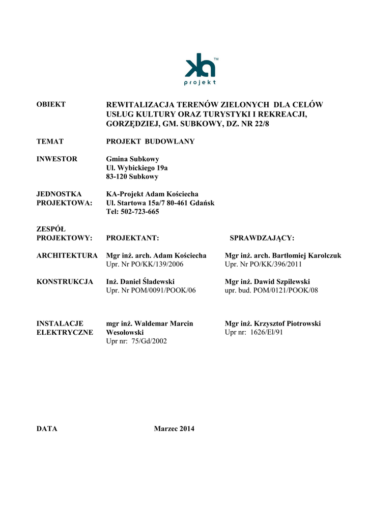 OBIEKT REWITALIZACJA TERENÓW ZIELONYCH DLA CELÓW USŁUG KULTURY ORAZ TURYSTYKI I REKREACJI, GORZĘDZIEJ, GM. SUBKOWY, DZ. NR 22/8 TEMAT PROJEKT BUDOWLANY INWESTOR Gmina Subkowy Ul. Wybickiego 19a 83-120 Subkowy JEDNOSTKA PROJEKTOWA: KA-Projekt Adam Kościecha Ul. Startowa 15a/7 80-461 Gdańsk Tel: 502-723-665 ZESPÓŁ PROJEKTOWY: PROJEKTANT: SPRAWDZAJĄCY: ARCHITEKTURA Mgr inż. arch. Adam Kościecha Upr. Nr PO/KK/139/2006 Mgr inż. arch. Bartłomiej Karolczuk Upr. Nr PO/KK/396/2011 KONSTRUKCJA Inż. Daniel Śladewski Upr. Nr POM/0091/POOK/06 Mgr inż. Dawid Szpilewski upr. bud. POM/0121/POOK/08 INSTALACJE ELEKTRYCZNE mgr inż. Waldemar Marcin Wesołowski Upr nr: 75/Gd/2002 Mgr inż. Krzysztof Piotrowski Upr nr: 1626/El/91 DATA Marzec 2014 ZAWARTOŚĆ OPRACOWANIA I. Dokumenty formalno-prawne 1. Oświadczenie projektantów oraz decyzje i zaświadczenia z Izby 2. Opinia ZUDP GG-ZUD.6630.1.141.2014 z dnia 10 kwietnia 2014 II. Opis techniczny 1. Opis techniczny do projektu 2. BIOZ 3. Część rysunkowa opisu technicznego III. Część rysunkowa 1. Projekt zagospodarowania terenu –plan sytuacyjny skala 1:500 2. Rysunek szczegółowy – rzut całości skala 1:250 3. Przekrój 1-1 skala 1:50 4. Przekrój 2-2 skala 1:50 5. Detal lampy parkowej skala 1:25 6. Detal boiska do siatkówki skala 1:100 7. Detal sceny skala 1:50 8. Mur oporowy sceny skala 1:15 OŚWIADCZENIE Oświadczam, że projekt budowlany pt. „Rewitalizacja terenów zielonych dla celów usług kultury oraz turystyki i rekreacji, Gorzędziej, gm. Subkowy, dz nr 22/8” został sporządzony zgodnie z obowiązującymi przepisami oraz zasadami wiedzy technicznej. ARCHITEKTURA Projektant: mgr inż. arch. Adam Kościecha Upr. Nr PO/KK/139/2006……………………………………………….....…….… Sprawdzający: Mgr inż. arch. Bartłomiej Karolczuk Upr. Nr PO/KK/396/2011……………………………………………….……… KONSTRUKCJA Projektant: Inż. Daniel Śladewski Upr. Nr POM/0091/POOK/06……………………………………………….....…….… Sprawdzający: Mgr inż. Dawid Szpilewski upr. bud. POM/0121/POOK/08…………………………………………….………………………. OPIS TECHNICZNY DO PROJEKTU BUDOWLANEGO REWITALIZACJI TERENÓW ZIELONYCH DLA CELÓW USŁUG KULTURY ORAZ TURYSTYKI I REKREACJI W GORZĘDZIEJU, DZ. NR 22/8 1.0.PODSTAWA OPRACOWANIA 1.1. Umowa zawarta pomiędzy Inwestorem a Projektantem. 1.2. Uzgodnienia z Inwestorem 1.3. Mapa do celów projektowych 2.0. LOKALIZACJA INWESTYCJI Rewitalizacja terenów zielonych wraz z placem zabaw i siłownią zewnętrzną został zlokalizowany na terenie należącym do byłej szkoły w Gorzędzieju, przy ul. Tczewskiej 21, gmina Subkowy. 3.0. ISTNIEJĄCY STAN ZAGOSPODAROWANIA DZIAŁKI Teren przeznaczony pod projektowaną inwestycję jest płaski, w sąsiedztwie planowanej sceny znajduje się drzewo nie kolidujące z planowanymi robotami. Na terenie inwestycji występują sieci uzbrojenia podziemnego – kanalizacja sanitarna, woda i instalacja elektroenergetyczna. Przed przystąpieniem do prac budowlanych należy zdemontować istniejące kolidujące obiekty małej architektury – stara tablica do koszykówki, stół do tenisa stołowego, ławki. 4.0. ROZWIĄZANIA ARCHITEKTONICZNO-BUDOWLANO PRZESTRZENNE 4.1. Dane ogólne Elementy placu zabaw oraz siłowni zewnętrznej zaprojektowano na terenie działki, którą Inwestor przeznaczył na funkcje sportowo – rekreacyjne. Inwestycja uwzględnia również budowę sceny plenerowej, boiska do siatki plażowej oraz sieć alejek wraz z małą architekturą. Jako wyposażenie placu zabaw oraz siłowni zewnętrznej zaprojektowano urządzenia wysokiej klasy o dużej trwałości zapewniające długie, bezpieczne użytkowanie. Przy lokalizacji urządzeń należy zachować zalecane przez producenta pasy bezpieczeństwa. W ramach opracowania zaprojektowano także ławki, śmietniki i latarnie zlokalizowane przy alejach, remont istniejących schodów terenowych oraz wymianę fragmentu ogrodzenia od strony stawu retencyjnego. 4.2. Podział funkcjonalny, lokalizacja poszczególnych elementów Plac zabaw został zaplanowany w centrum założenia, tak, aby umożliwić do każdego ze sprzętów swobodny dostęp. Siłownia zewnętrzna ulokowana została przy drugim wejściu na teren założenia oraz częściowo pomiędzy boiskiem a placem zabaw. Boisko do siatkówki plażowej znajduje się w miejscu obecnie istniejącego boiska – wzdłuż północnego ciągu pieszego. Scena plenerowa została zlokalizowana w południowej części terenu, wkomponowana w istniejącą skarpę ziemną wzmocnioną murami oporowymi. 4.3. Dane liczbowe: Powierzchnia terenu objęta opracowaniem: W tym: -nawierzchnia trawiasta projektowana do odtworzenia -kostka betonowa gr 8cm: 1046m2 510 m2 287 m2 -boisko plażowe: 240 m2 4.4. Projektowane nawierzchnie 4.4.1. Nawierzchnie pod urządzenia W związku z lokalizacją inwestycji na terenie porośniętym trawą nie ma konieczności projektowania innej nawierzchni pod urządzenia ponieważ istniejąca spełnia wszystkie wymagania dotyczące bezpieczeństwa upadku dziecka z wysokości. Należy tylko teren wyrównać, dokładnie oczyścić z ewentualnych resztek gruzu, kamieni czy innych zanieczyszczeń mogących spowodować zagrożenie dla bawiących się dzieci. 4.4.1. Chodniki Projektuje się chodniki o szerokości 150cm z kostki betonowej. Warstwy konstrukcyjne: warstwa ścieralna - kostka betonowa szara gr. 8 cm podsypka cementowo - piaskowa gr. 3 cm podbudowa z kruszywa stabilizowanego cementem Rm=2,5 MPa gr. 15 cm 5.0.DANE KONSTRUKCYJNO-BUDOWLANE 5.1.Fundamenty pod urządzenia Fundamenty pod urządzenia oraz ławki zgodnie z zaleceniami producenta. Prace montażowe w otoczeniu istniejącego drzewa należy prowadzić ręcznie, nie odsłaniać grubszych korzeni. Beton na fundamenty klasy C20/25, W-8 (wodoodporny). Zaleca się stosowanie dodatkowych stóp przy markach urz